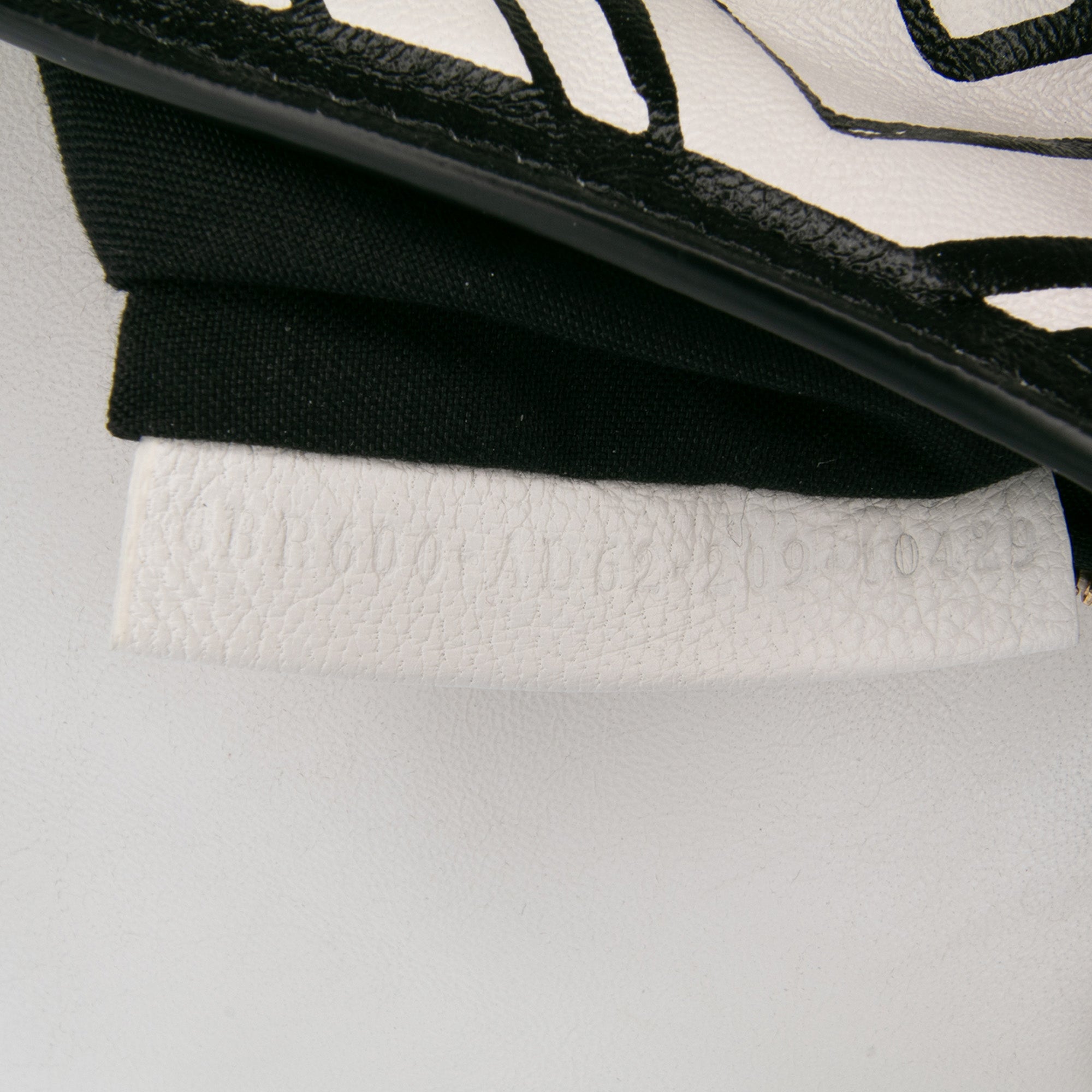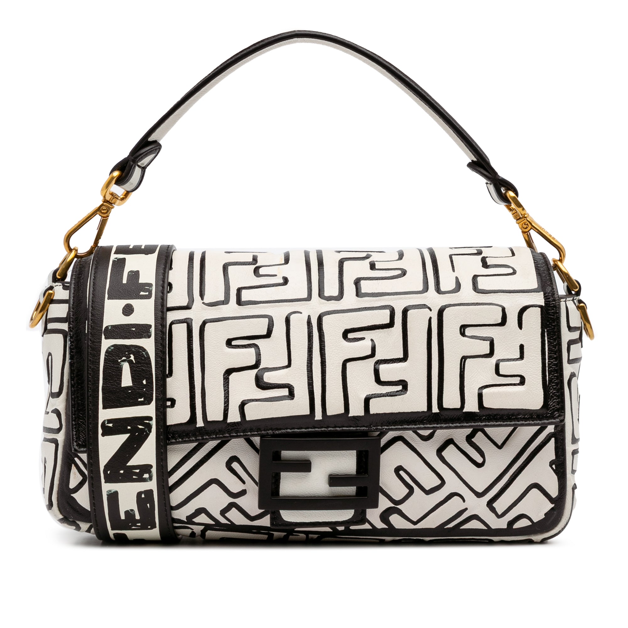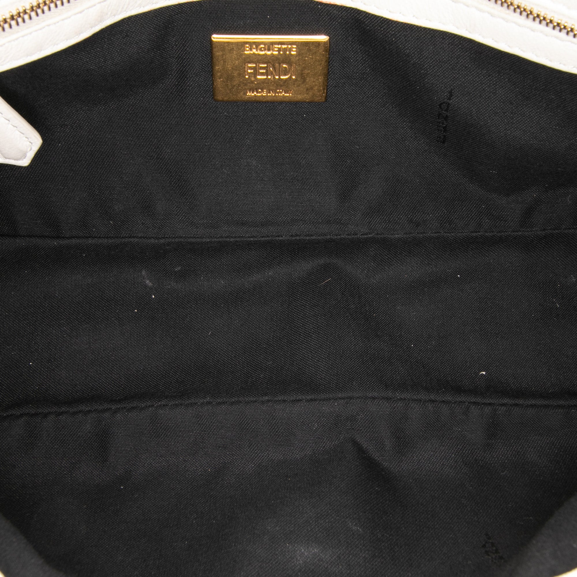 Product Details: White Fendi Joshua Vides California Sky Medium Embossed Leather Baguette Satchel. This satchel features an embossed and printed leather body, a detachable flat leather handle, a detachable flat leather shoulder strap, a front flap with magnetic snap closure, and an interior zip pocket. 5.9" L x 10.2" W x 2.6" D, 3.9" drop. Serial number 8BR600 A062 209 10429.