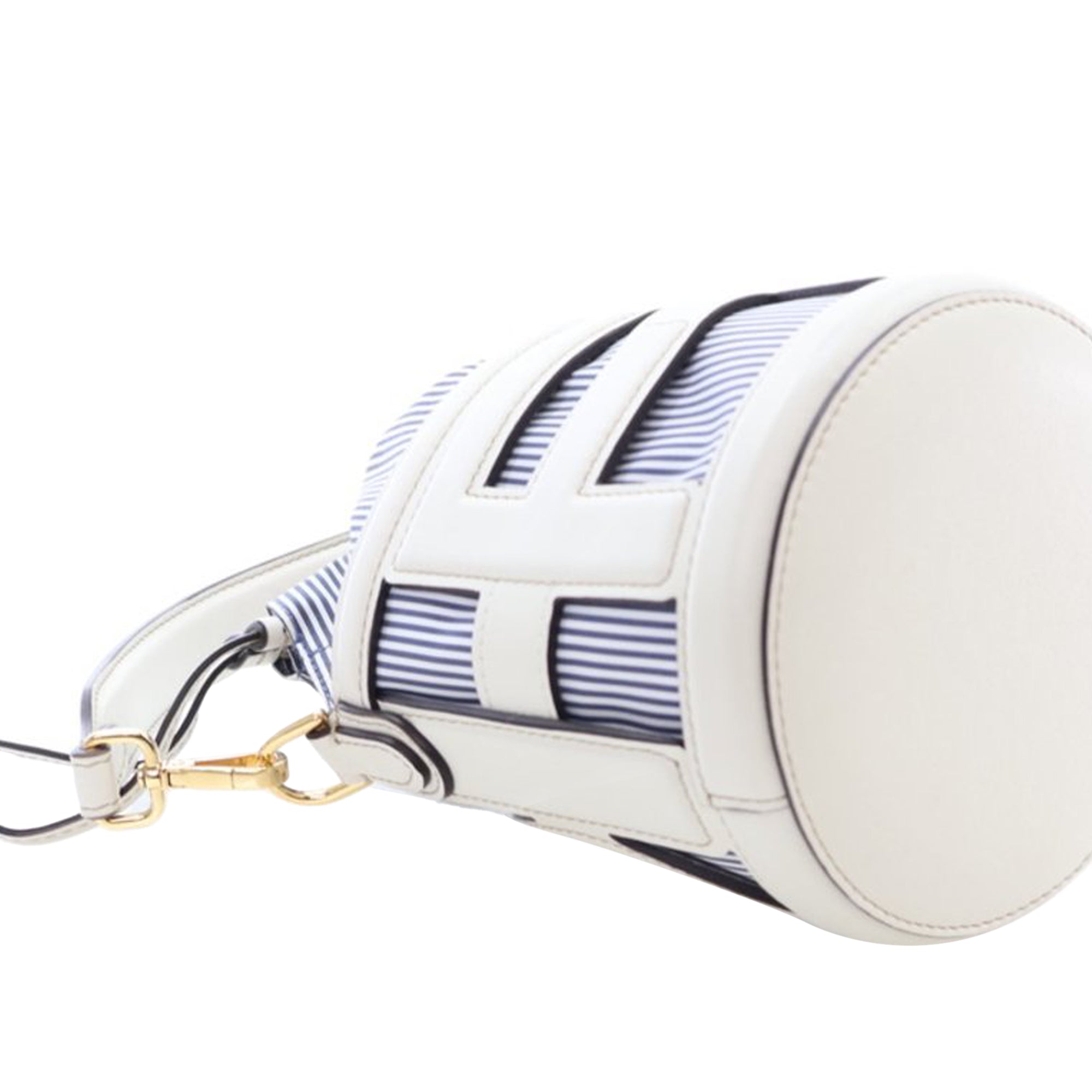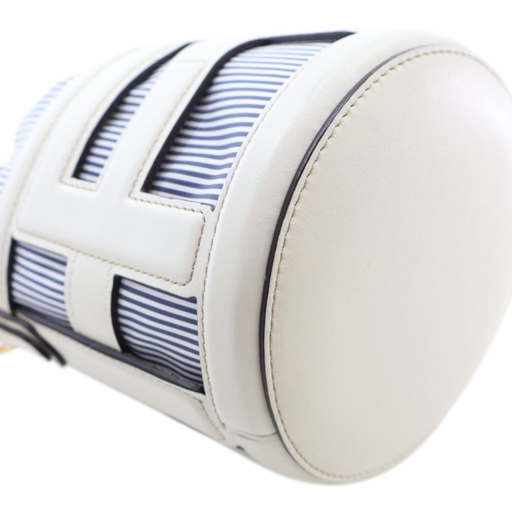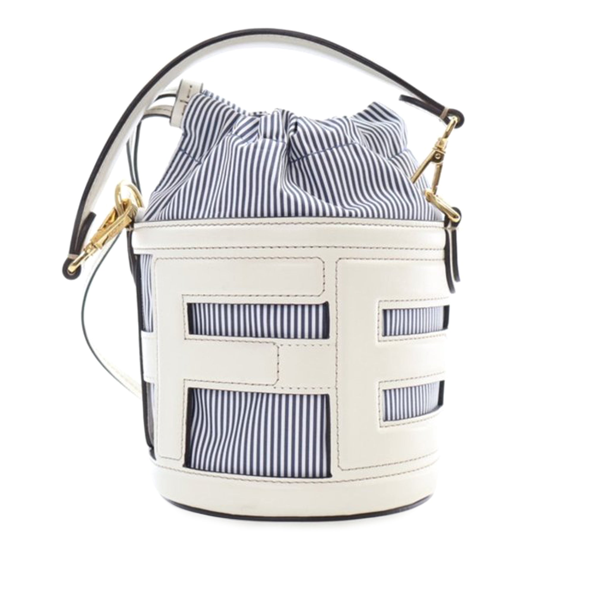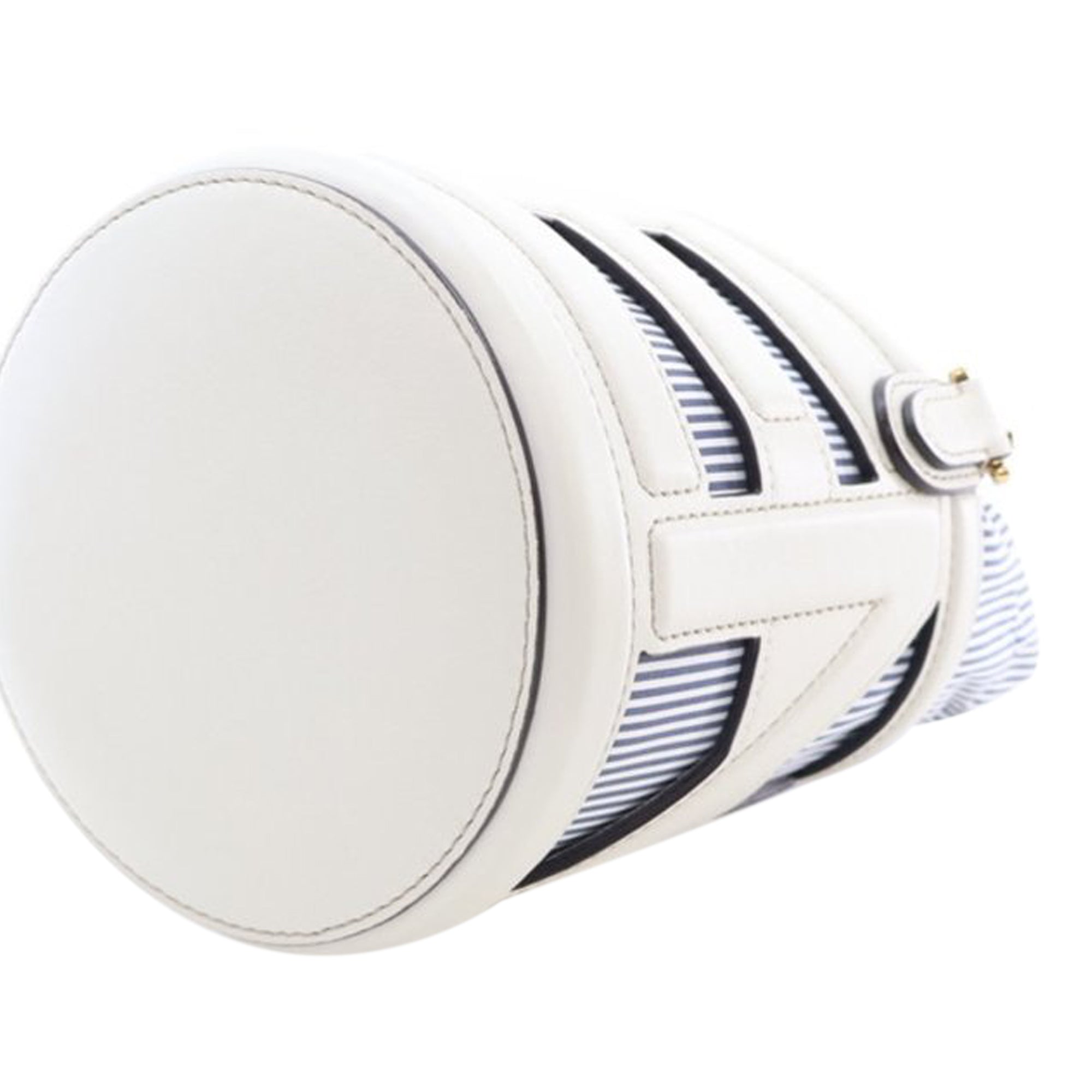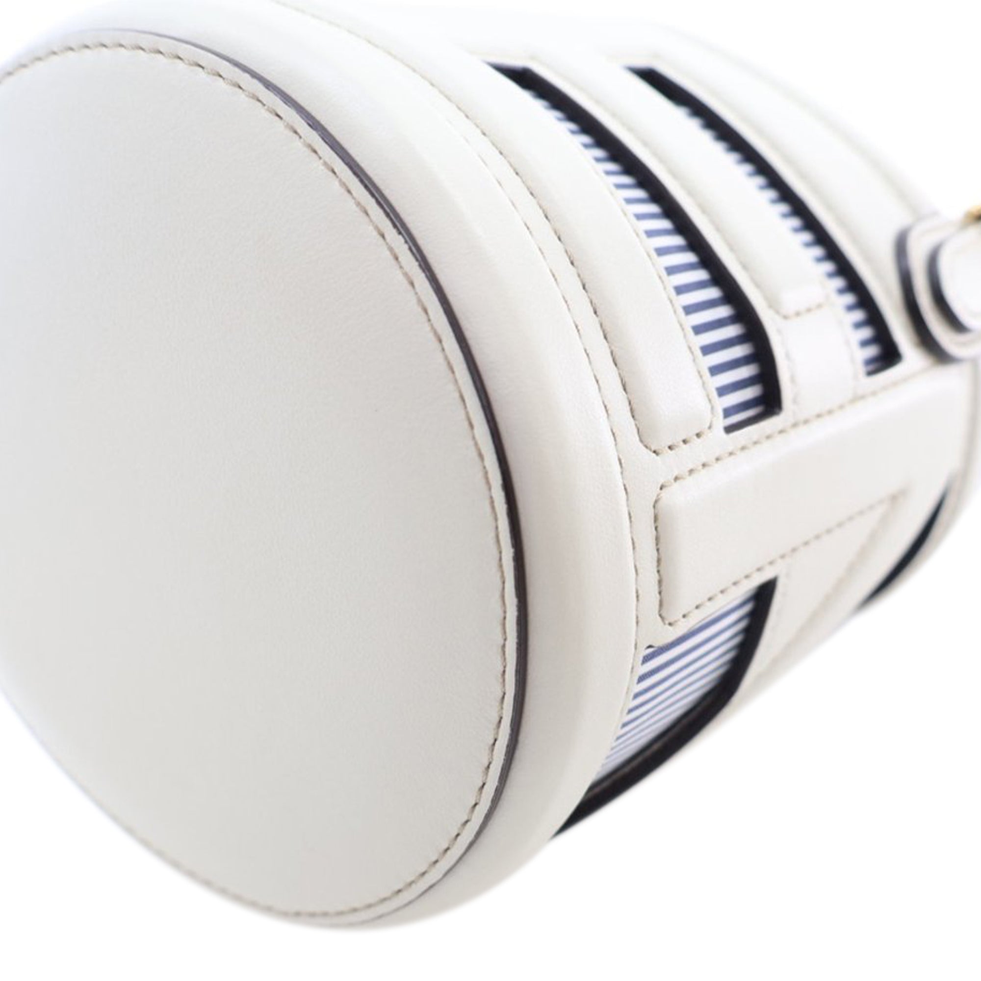 Product Details: White Fendi Mini Nylon Vitello King Logo Step Out Bag. The Step Out bucket bag features leather and nylon body, a flat leather handle, a detachable flat strap, and a top drawstring closure. 4.9" L x 6.9" W x 4.9" D, 6.3" drop. Serial number 8BS079 APEX 238 0059.