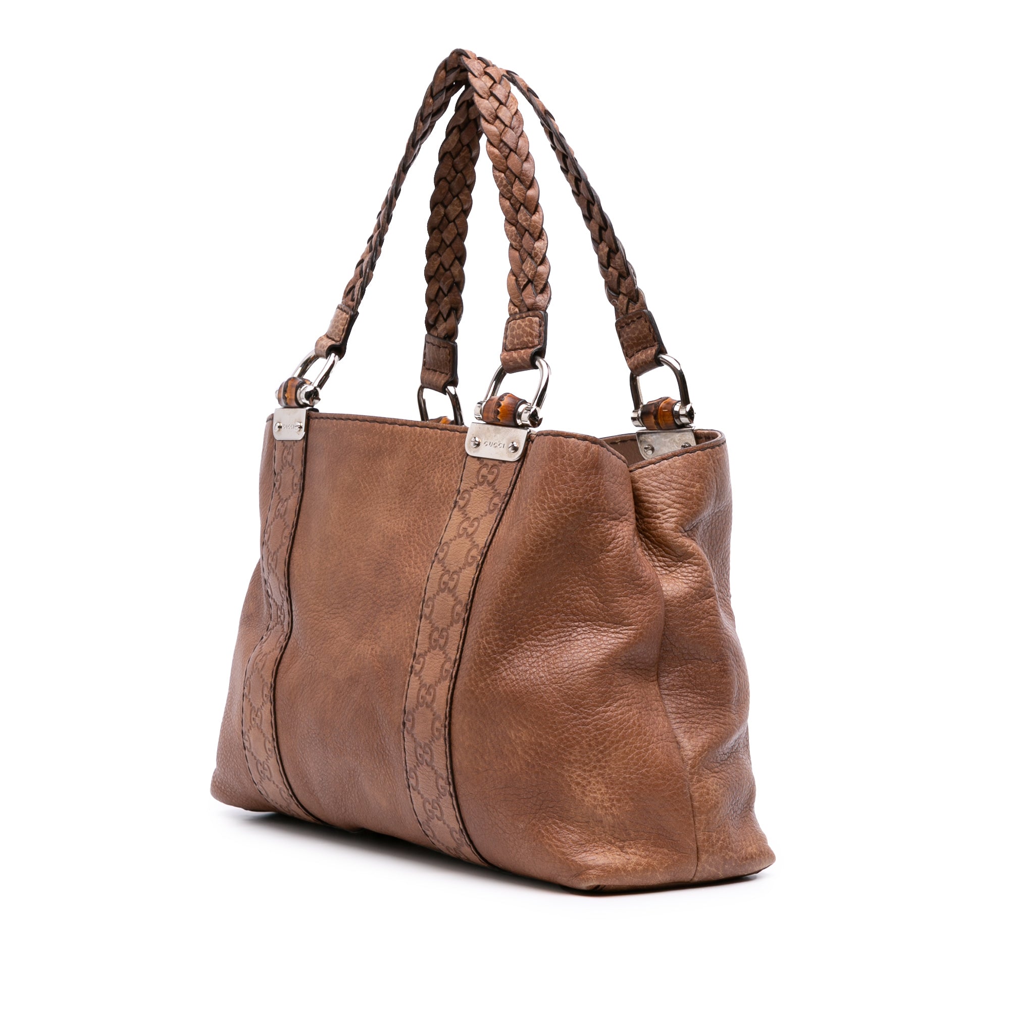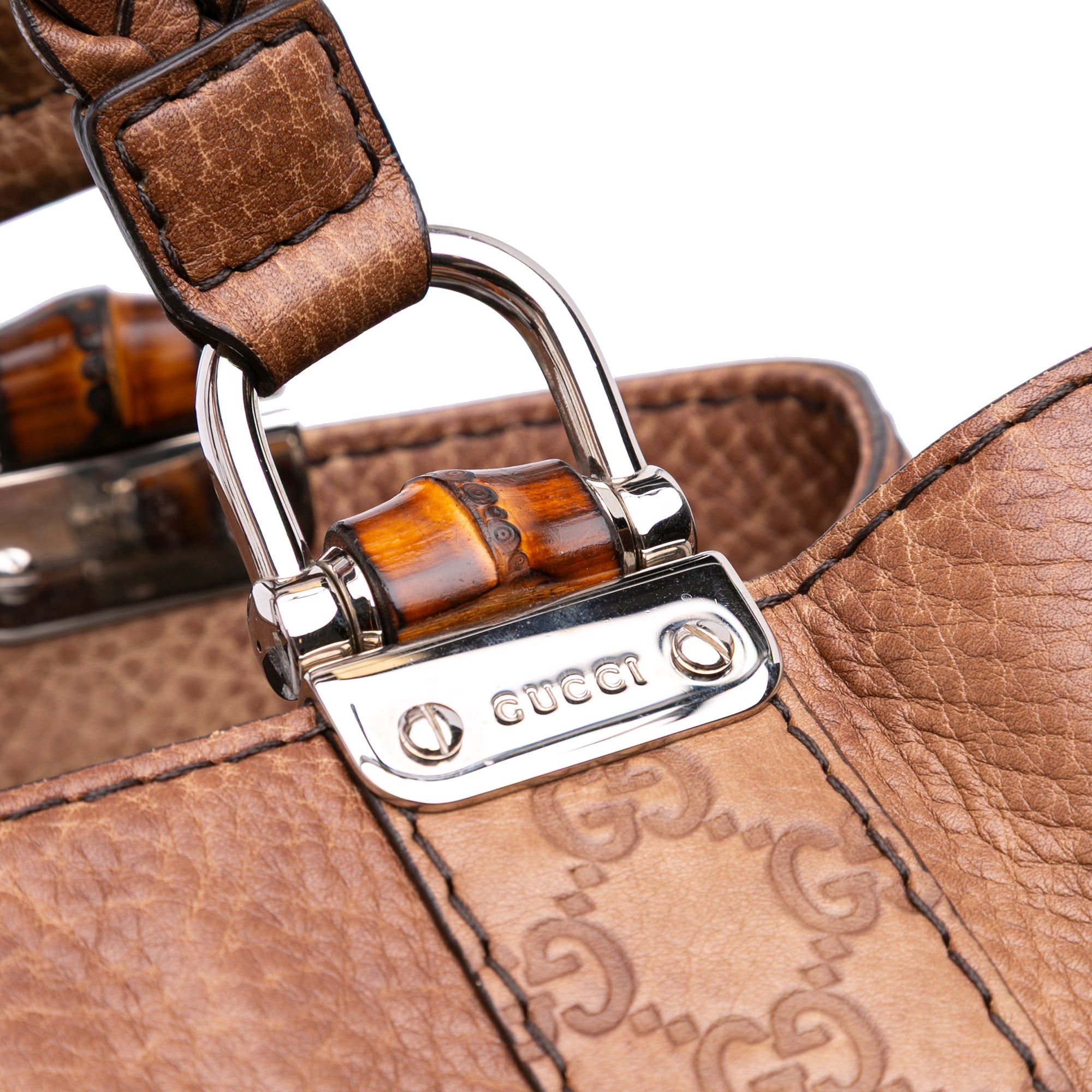 Product Details: Brown Gucci Guccissima Trimmed Leather Bamboo Libeccio Tote. This tote features a leather body with embossed leather trim, woven leather shoulder straps, an open top, an interior zip compartment, and interior zip and slip pockets. 10.4" L x 15.4" W x 4.5" D, 8.7" drop. Serial number 232947 486628.