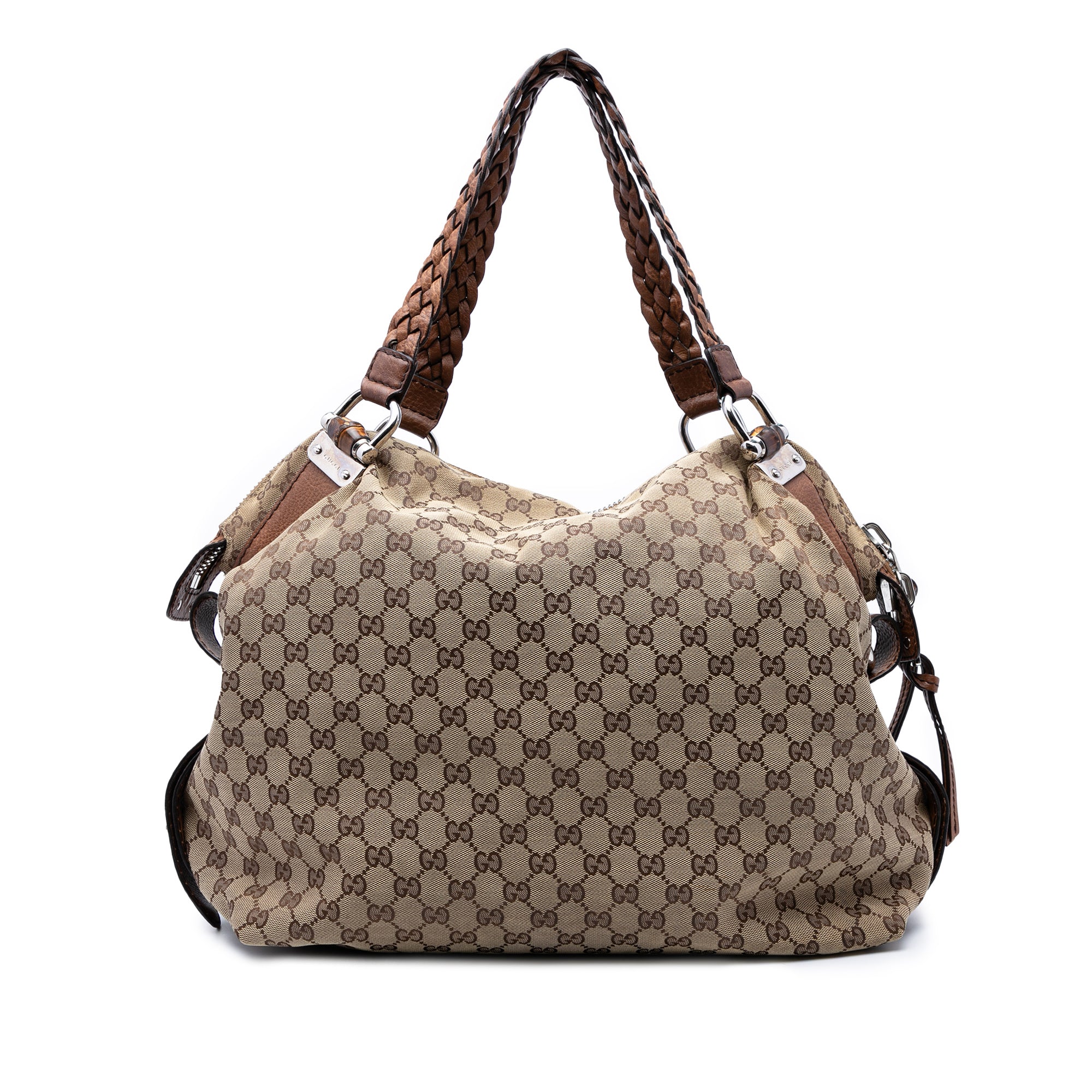 Product Details: Brown Gucci Large GG Canvas Bamboo Bar Tote. This tote bag features a canvas body with leather trim, braided leather shoulder straps, a top zip closure, and interior zip and slip pockets. 14.8" L x 15.2" W x 6.7" D. Serial number 232927 002123.