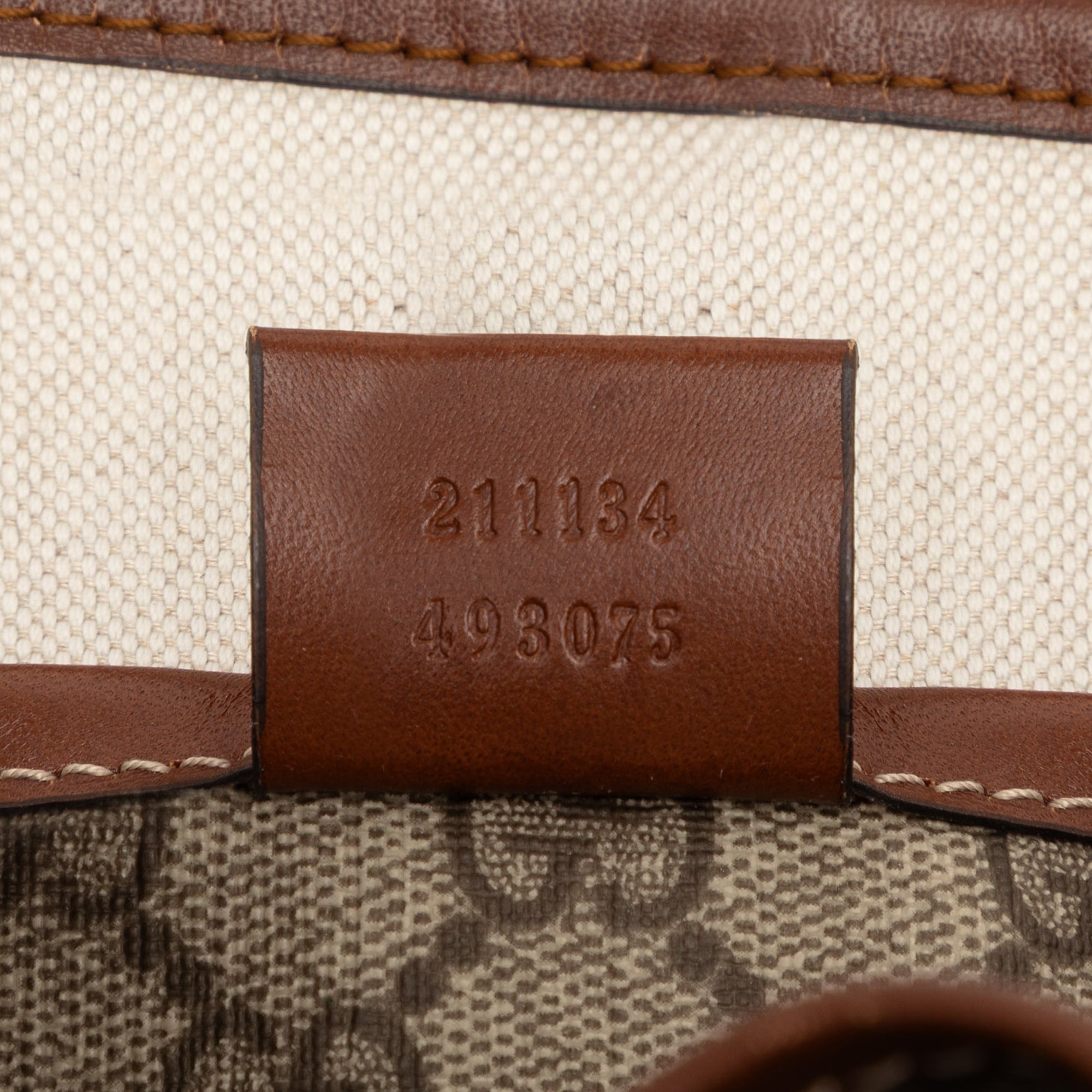 Product Details: Brown Gucci Medium GG Supreme Web Loop Tote. This tote bag features a coated canvas body with leather trim, flat leather handles, an open top, and an interior slip pocket. 10.6" L x 14.6" W x 4.1" D, 6.7" drop. Serial number 211134 493075.