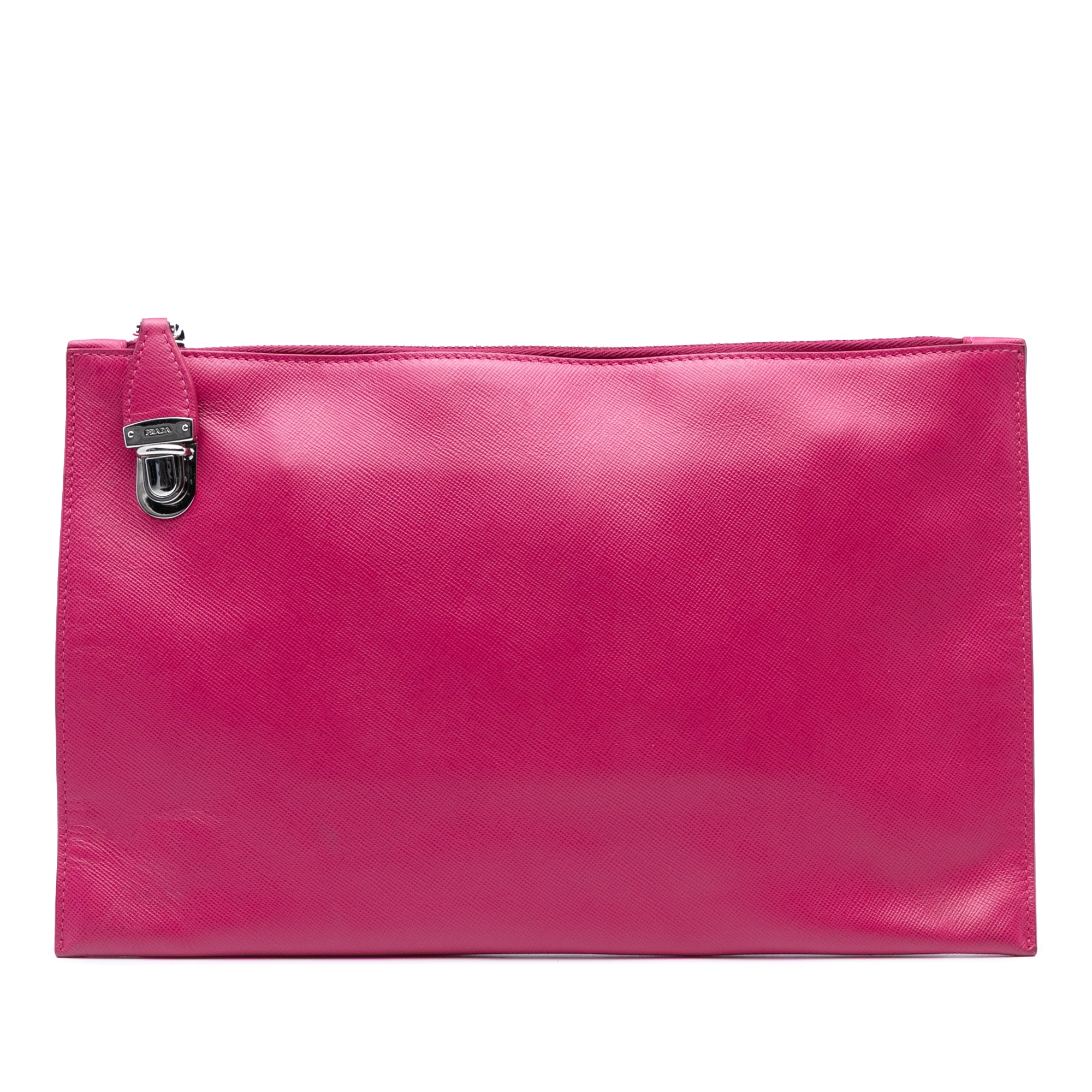 Product Details: Pink Prada Saffiano Lux Zip Clutch. This clutch bag features a saffiano leather body, top zip closure with metal lock closure, and interior zip and slip pockets. 7.3" L x 11.8" W x 0.1" D.