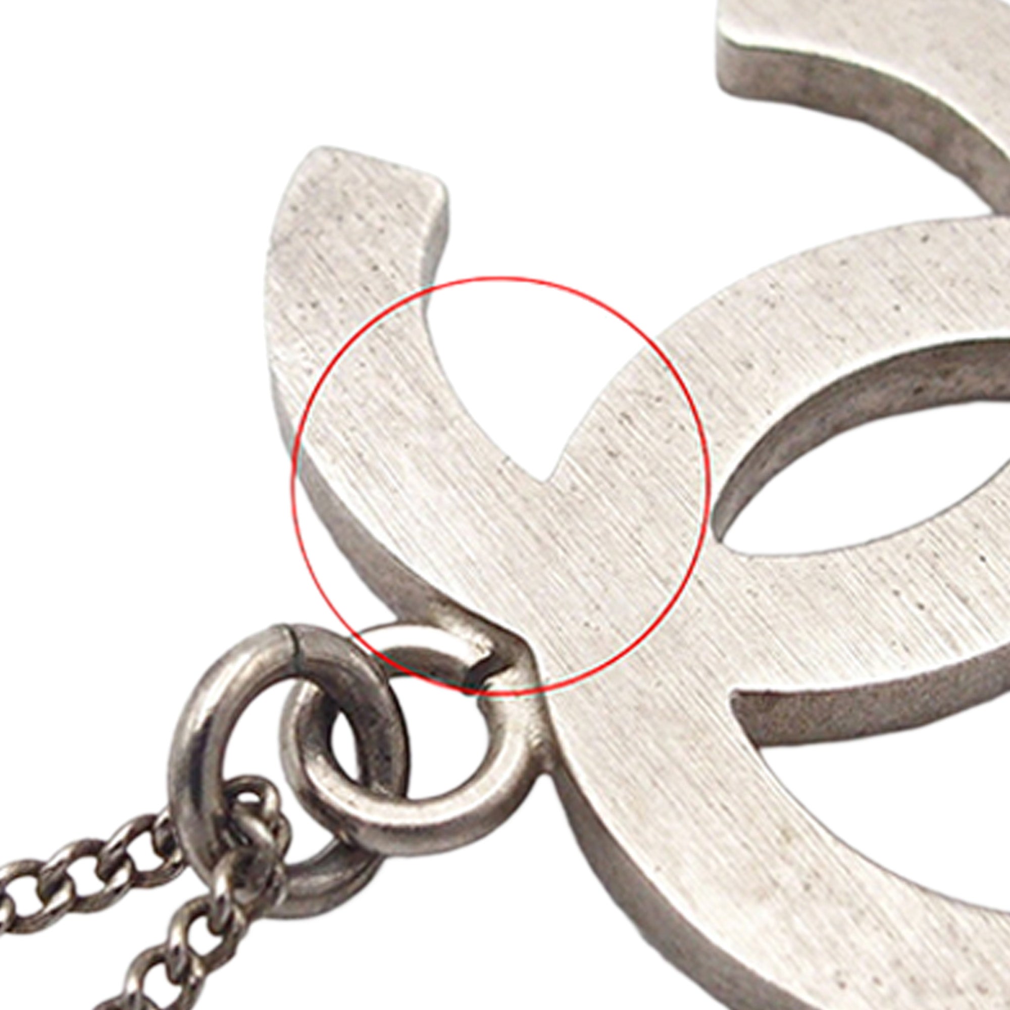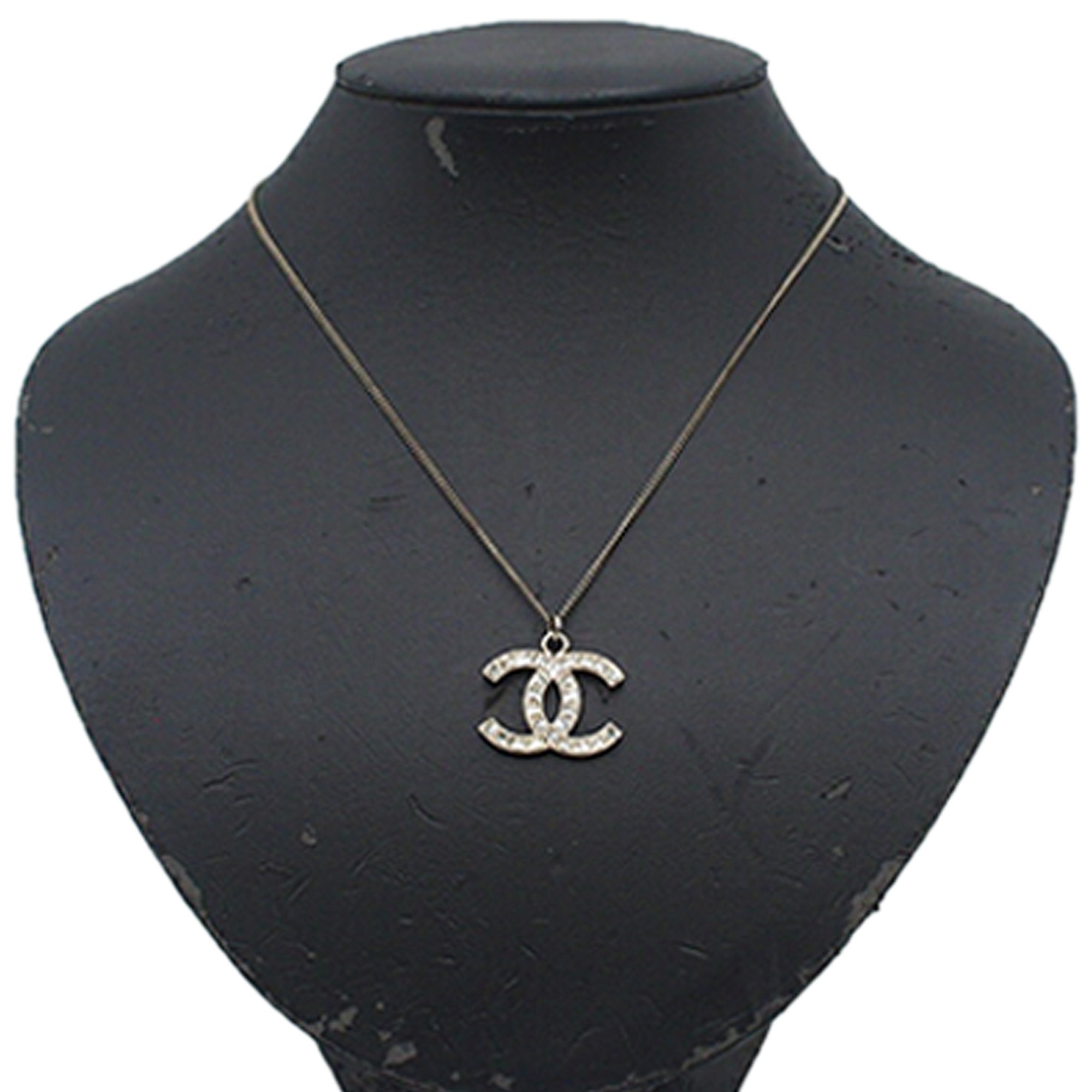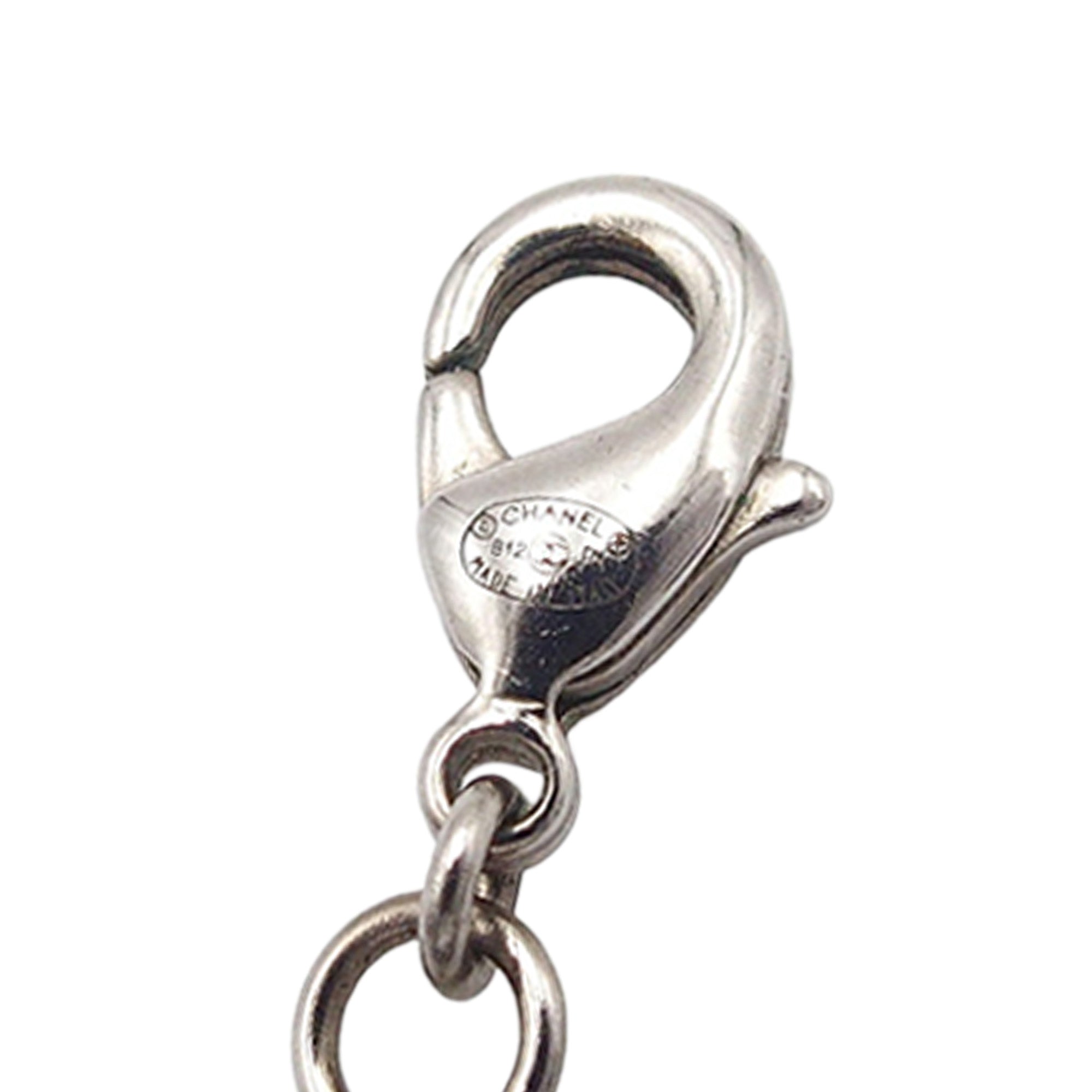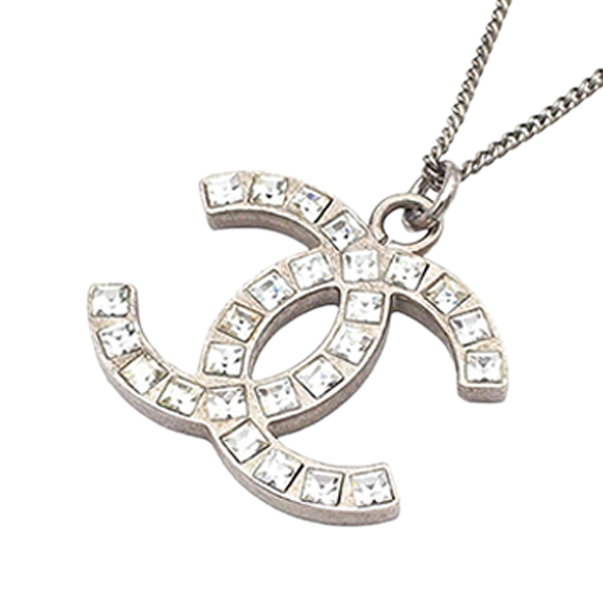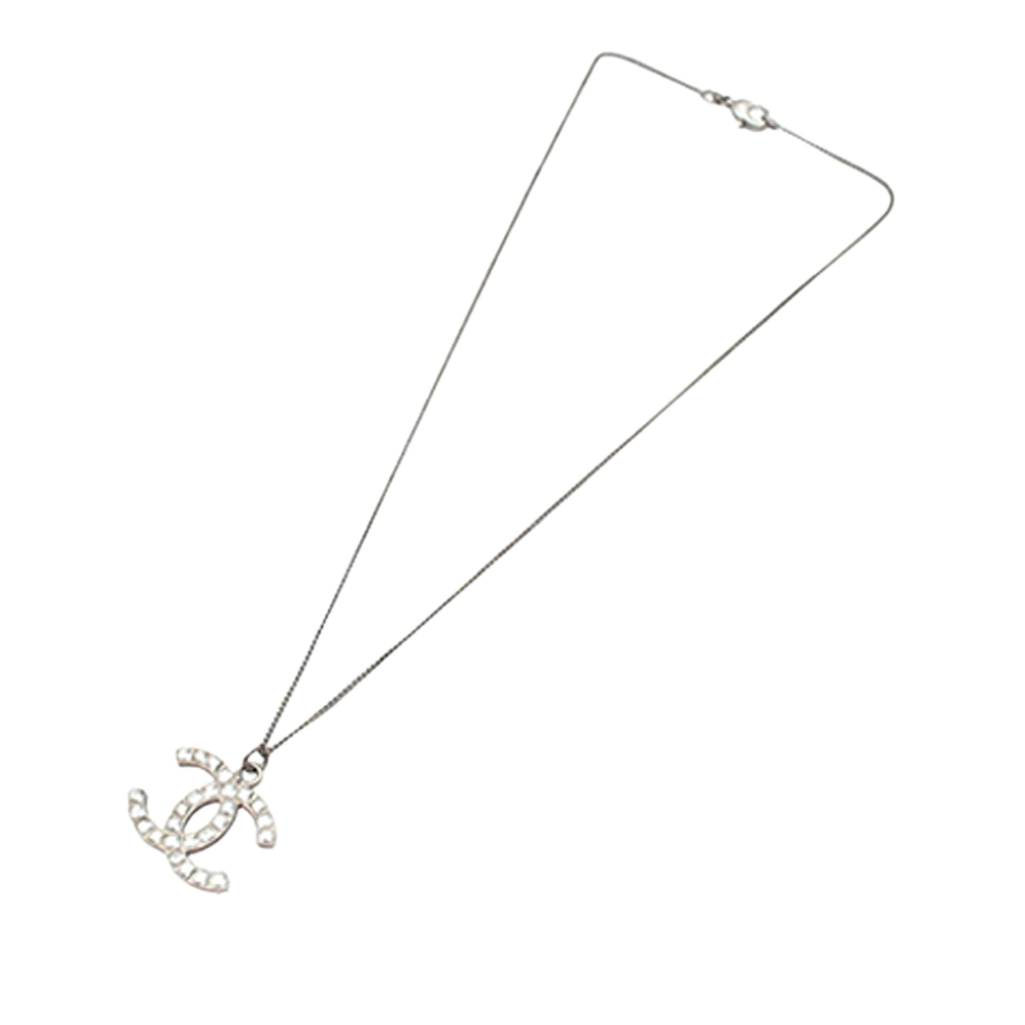 Product Details: Silver Chanel Silver Plated Rhinestone CC Pendant Necklace. This necklace features silver-tone body, a silver tone pendant with rhinestone embellishments, and a lobster clasp closure. Motif size: 2.10 cm x 2.30 cm 16.3" L x 0.9" W x 0" D. Serial number B12P.