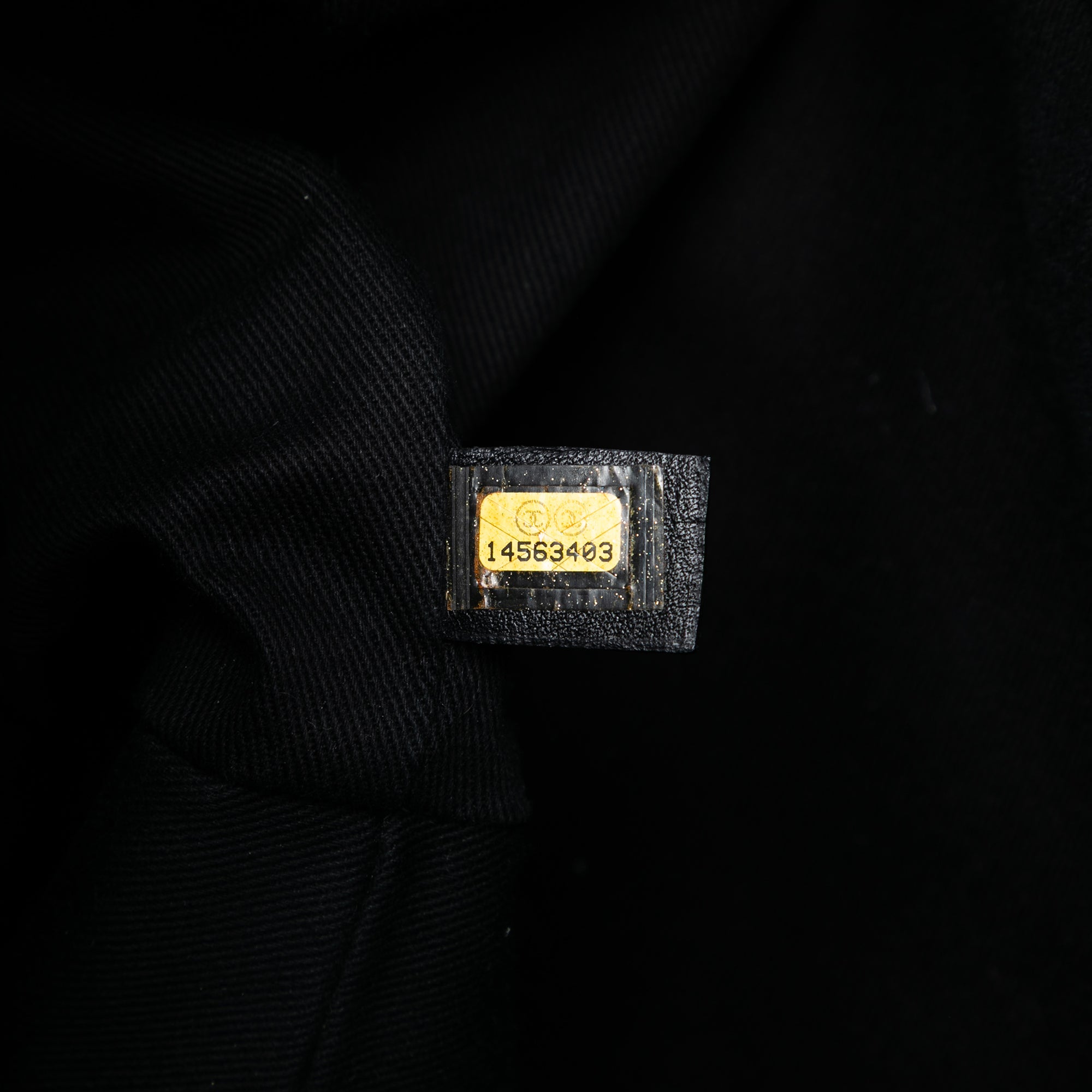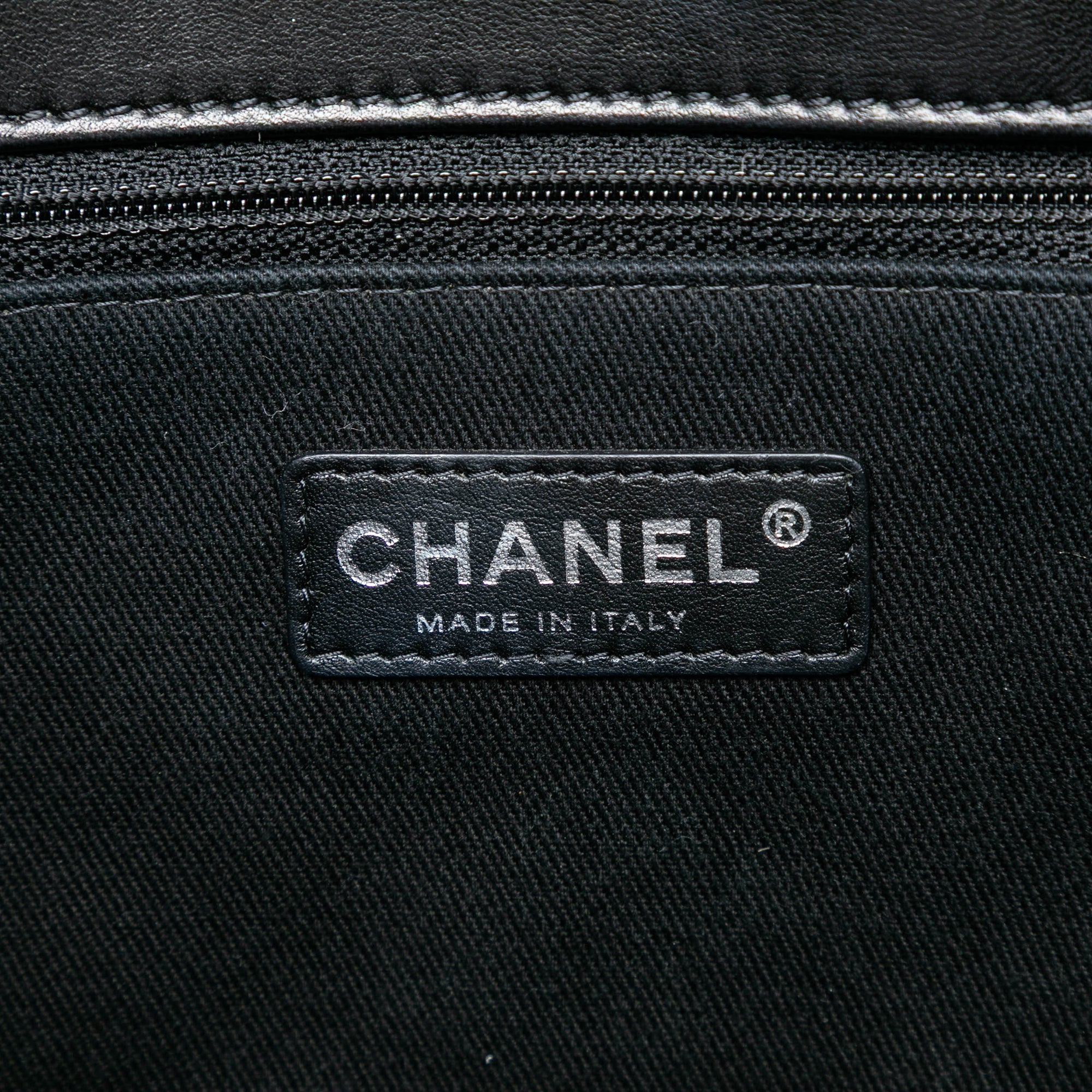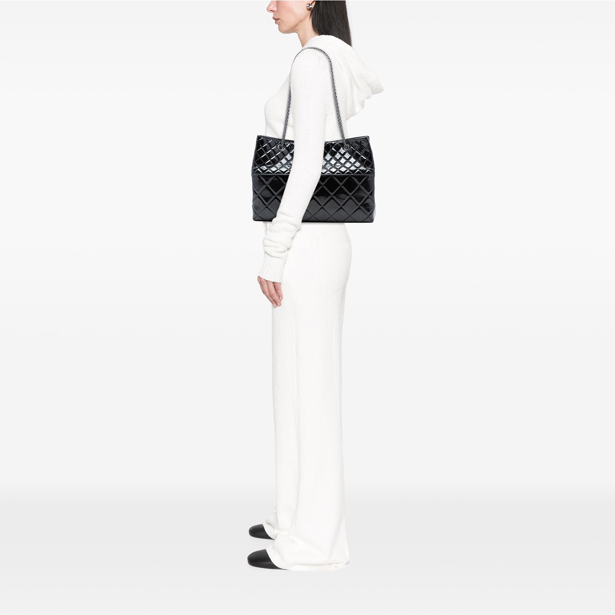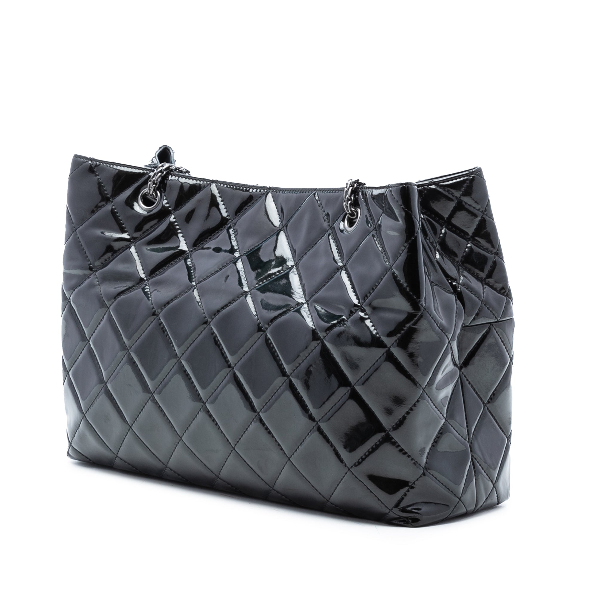 Product Details: Black Chanel Quilted Patent Reissue 2.55 Tote. This tote bag features a quilted patent leather body, silver-tone chain link shoulder straps, an open top with magnetic snap closure, and interior zip and slip pockets. 11.4" L x 15.4" W x 5.1" D, 12.6" drop. Serial number 14563403.