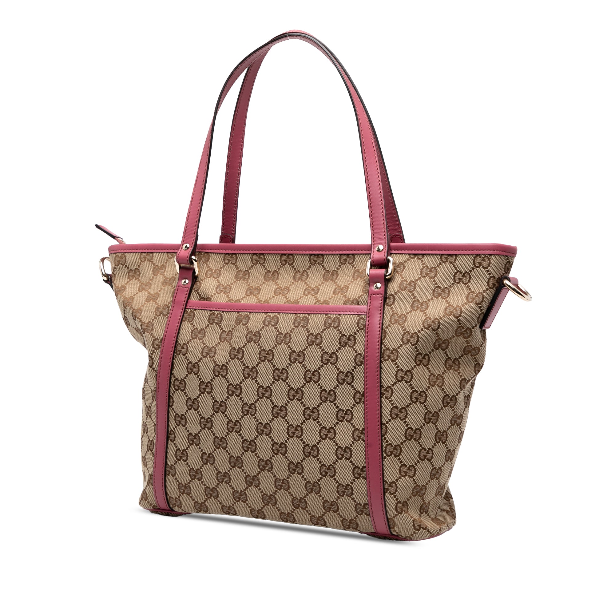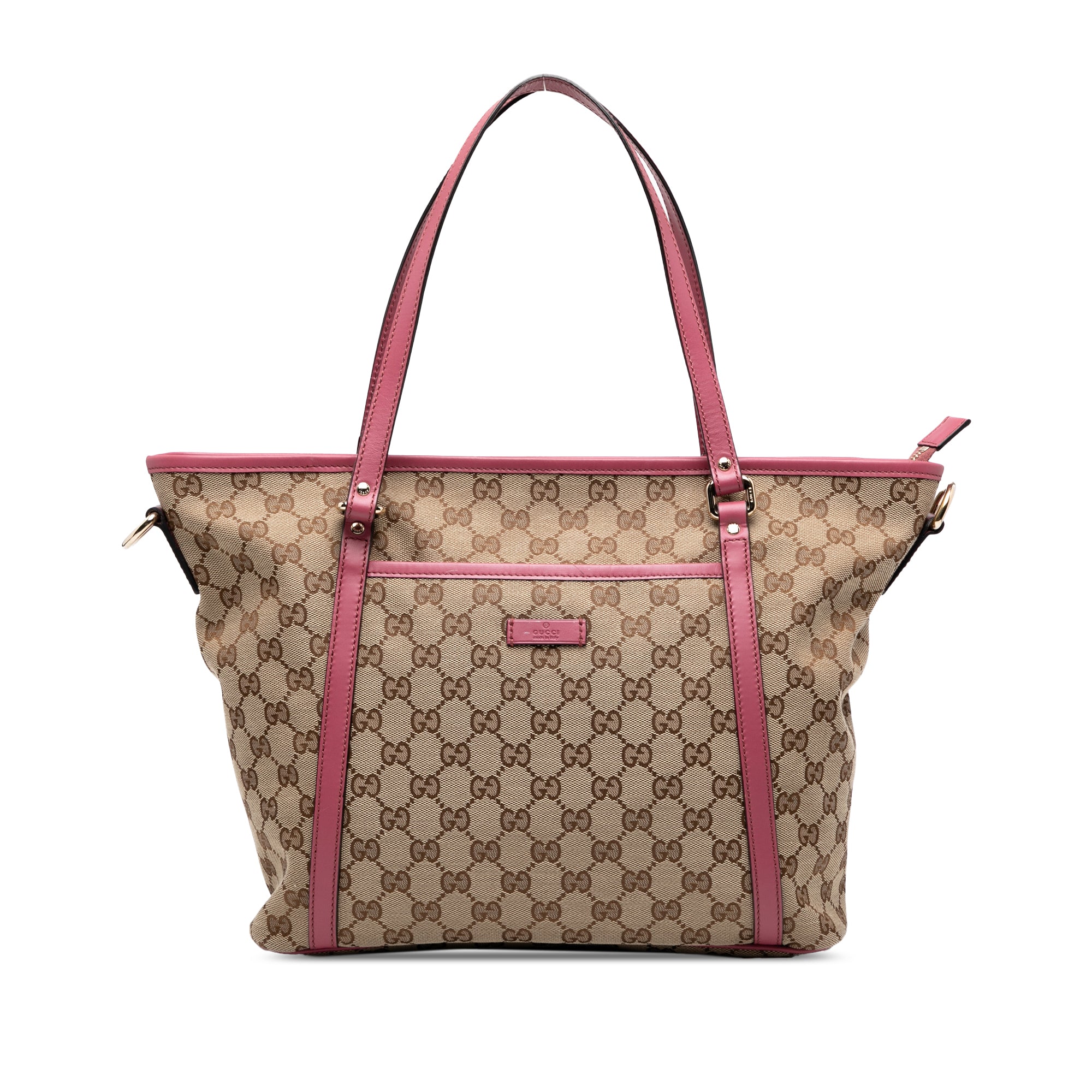 Product Details: Brown & Pink Gucci GG Canvas Convertible Joy Tote Satchel. This satchel features a canvas body with leather trim, flat leather straps, a top zip closure, exterior slip pockets, and interior zip and slip pockets. 10.2" L x 12.2" W x 3.1" D, 7.9" drop. Serial number 388929 525040.