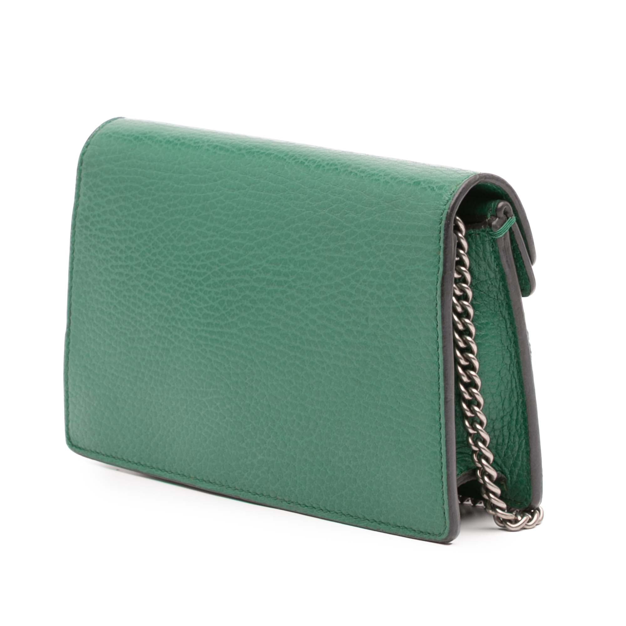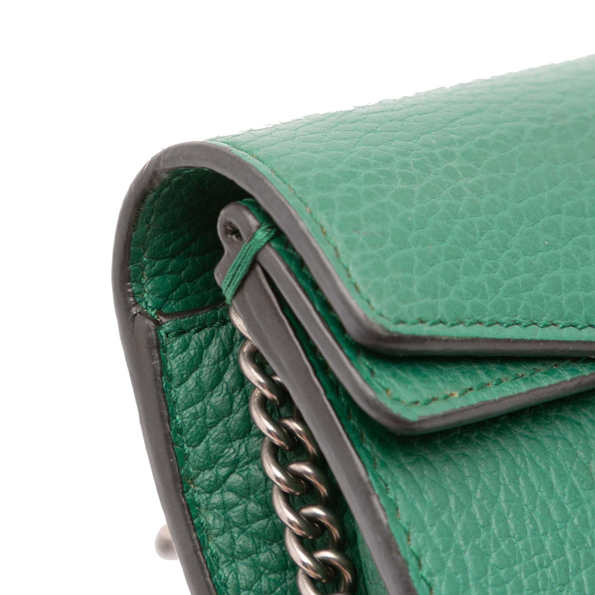 Product Details: Green Gucci Mini Leather Dionysus Crossbody. The Super Mini Dionysus Crossbody Bag features a leather body, a chain link strap, and a front flap with snap closure. 3.9" L x 6.5" W x 1.6" D. Serial number 476432 0959.