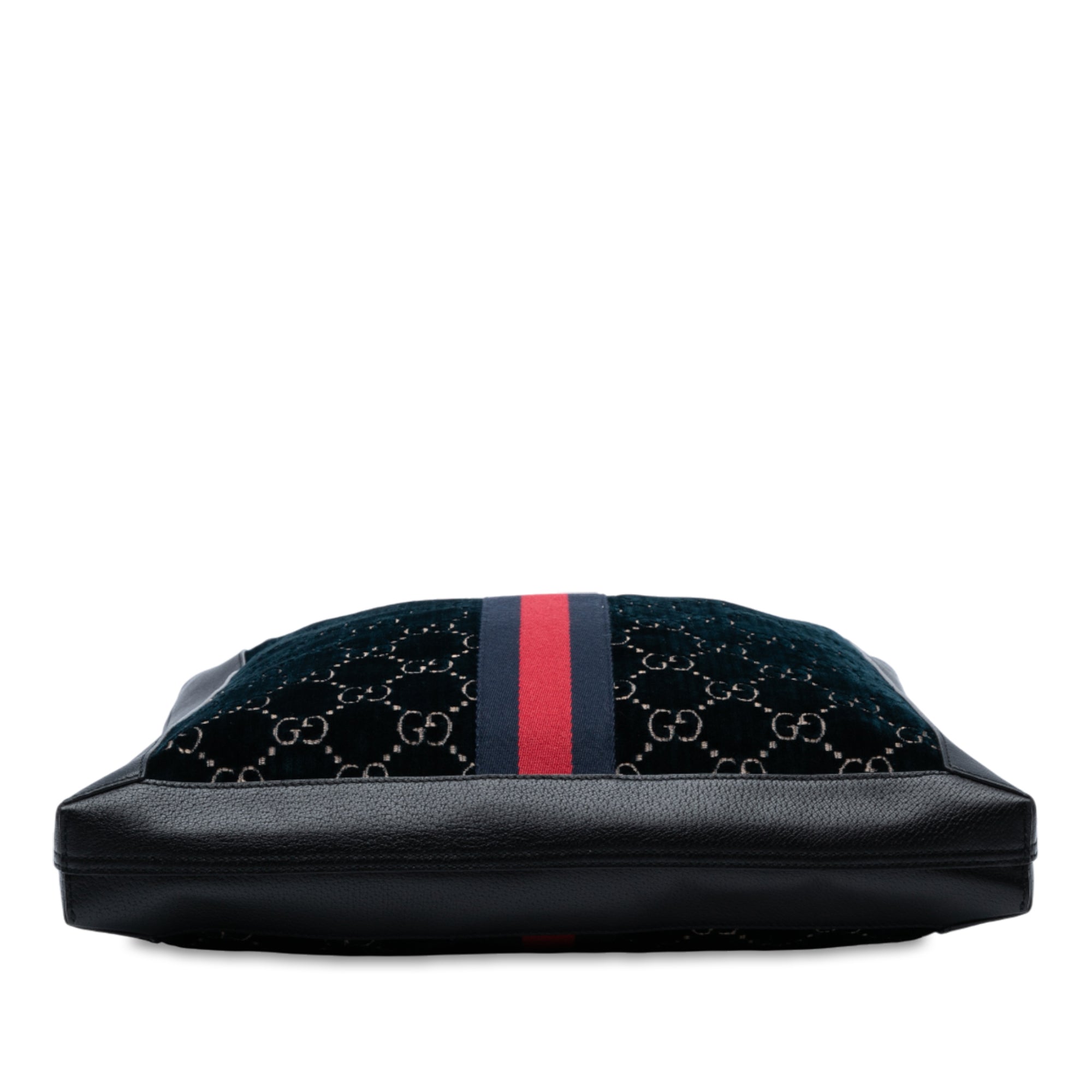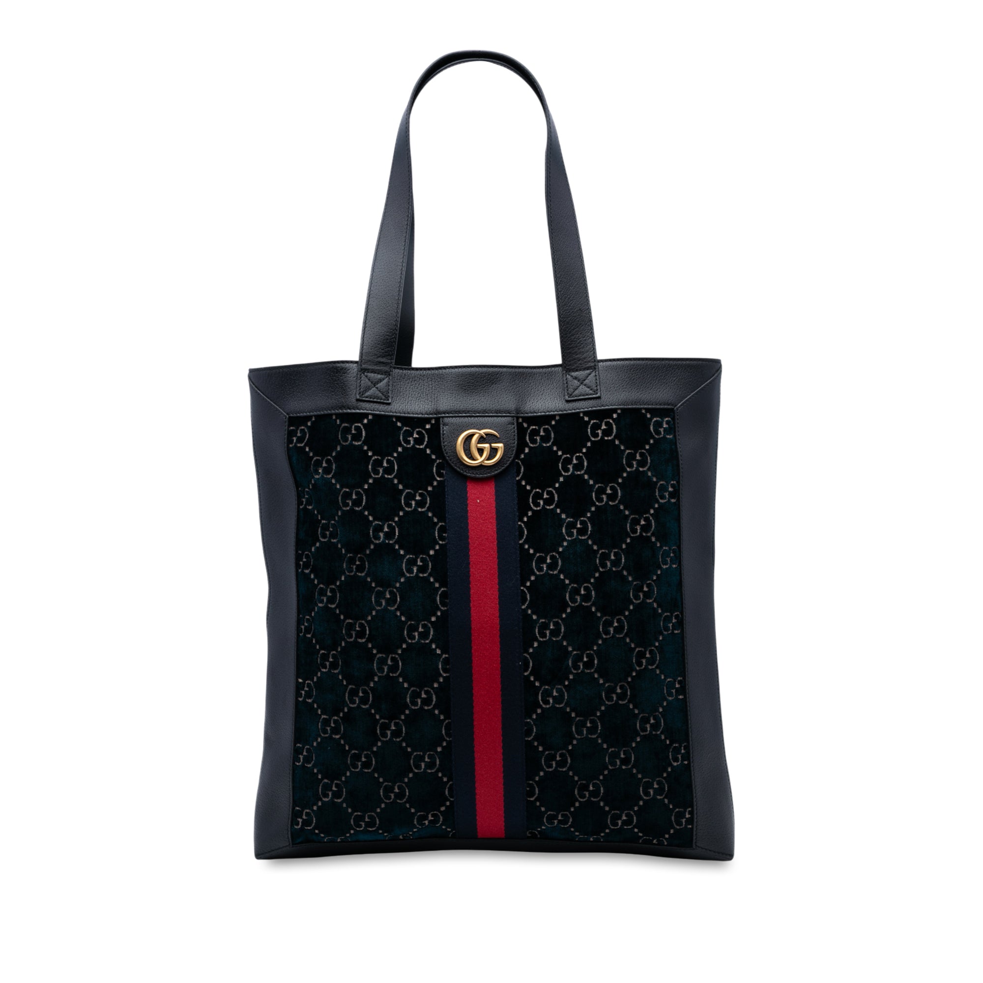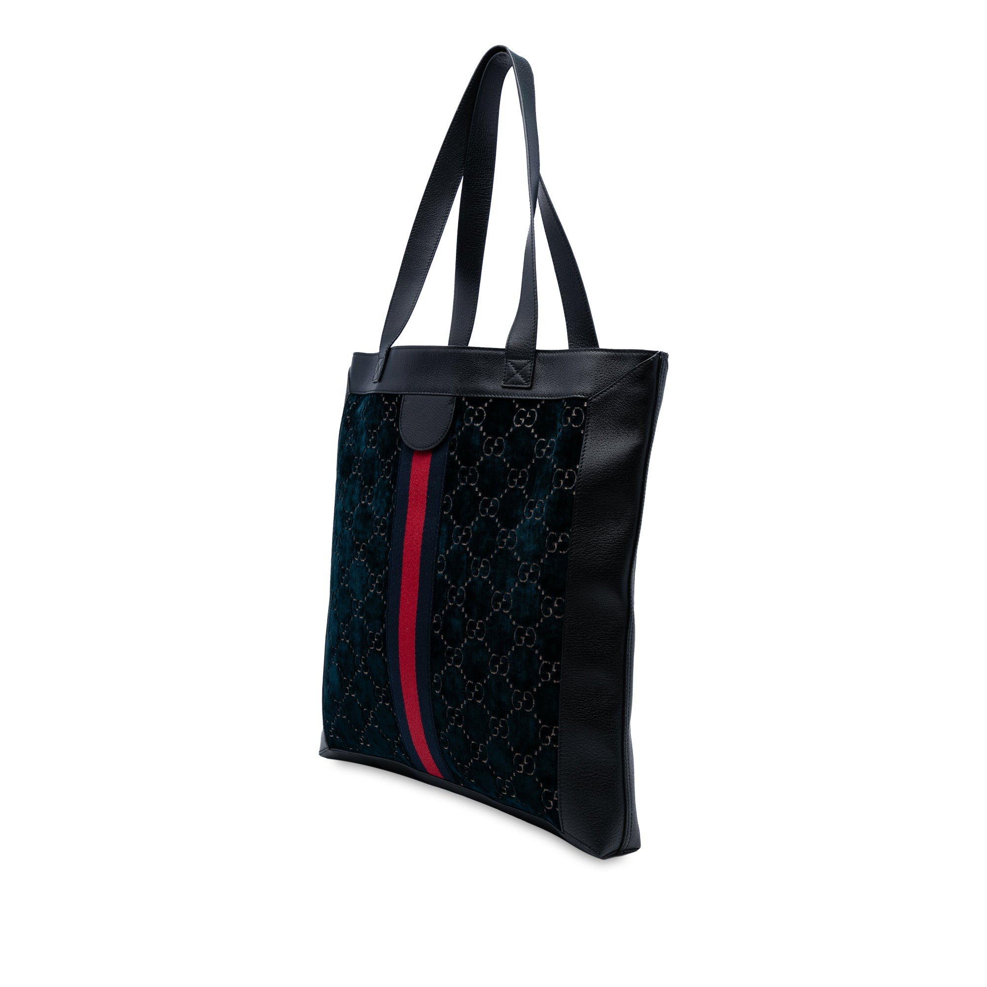 Product Details: Navy Gucci Large GG Velvet Web Ophidia Tote. The Ophidia Tote bag features a velvet body with leather trim, web details, flat leather handles, an open top, and an interior zip pocket. 16.7" L x 15.7" W x 2" D. Serial number 523781 493075.