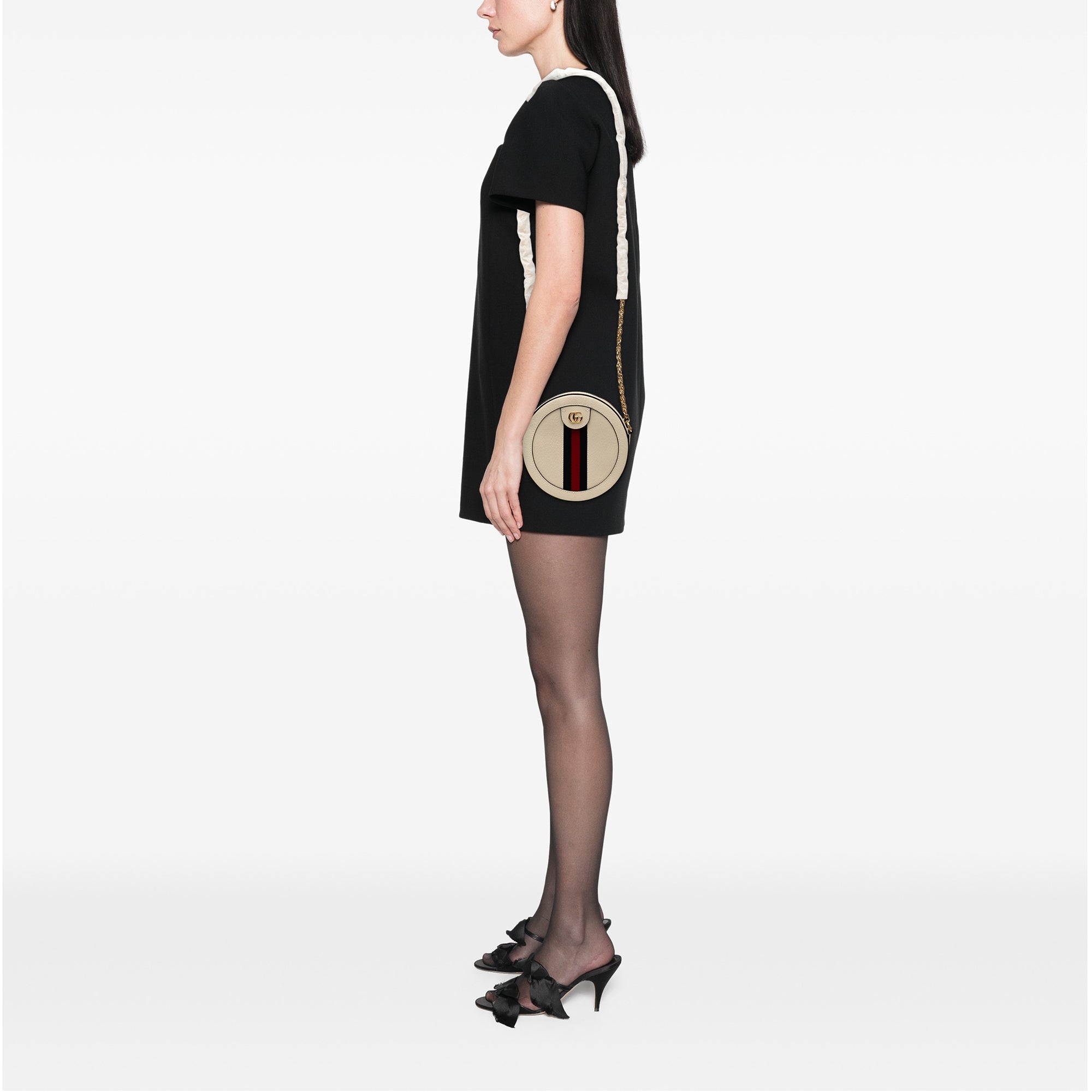 Product Details: White Gucci Mini Leather Ophidia Round Crossbody. The Mini Round Ophidia crossbody bag features a leather body, a gold toned chain link strap with leather shoulder guard, and a top zip closure. 7.3" L x 7.3" W x 1.8" D. Serial number 550618 520981.
