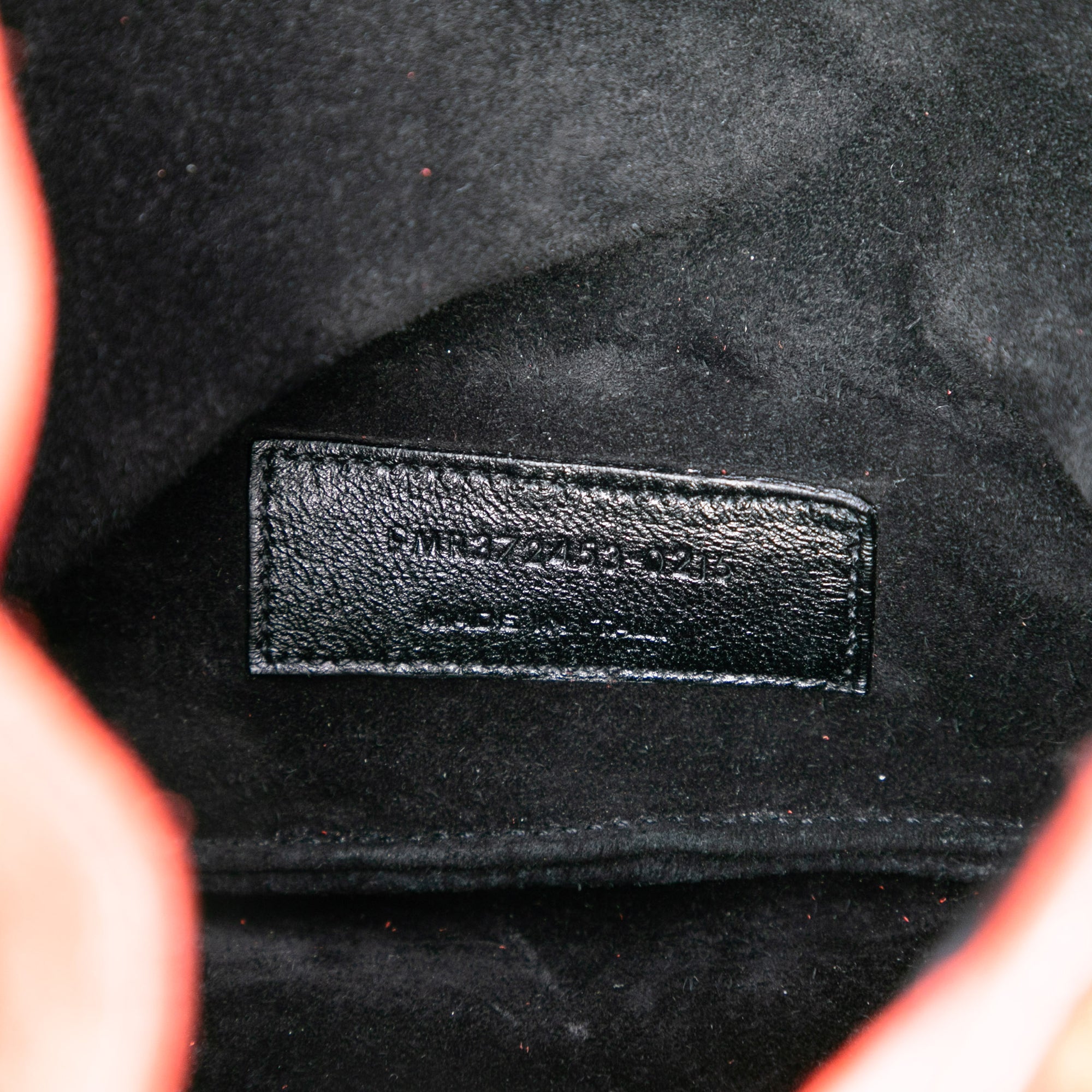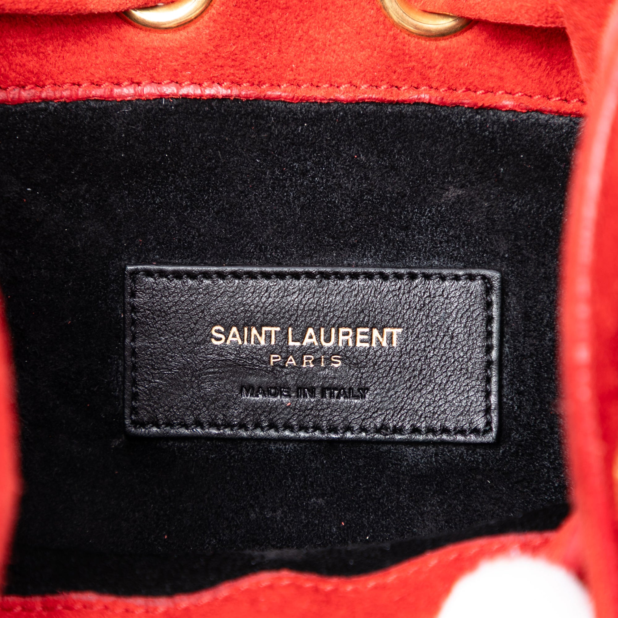 Product Details: Red Saint Laurent Small Suede Emmanuelle Fringe Bucket Bag Satchel. The Emmanuelle features a suede leather body with fringe details, a detachable rolled leather top handle, an adjustable suede leather strap, and an open top with drawstring closure. 6.7" L x 6.1" W x 4.9" D, 2.4" drop. Serial number PMR372453.0215.