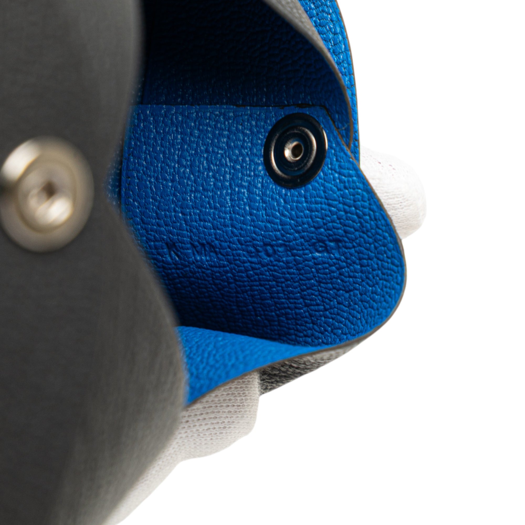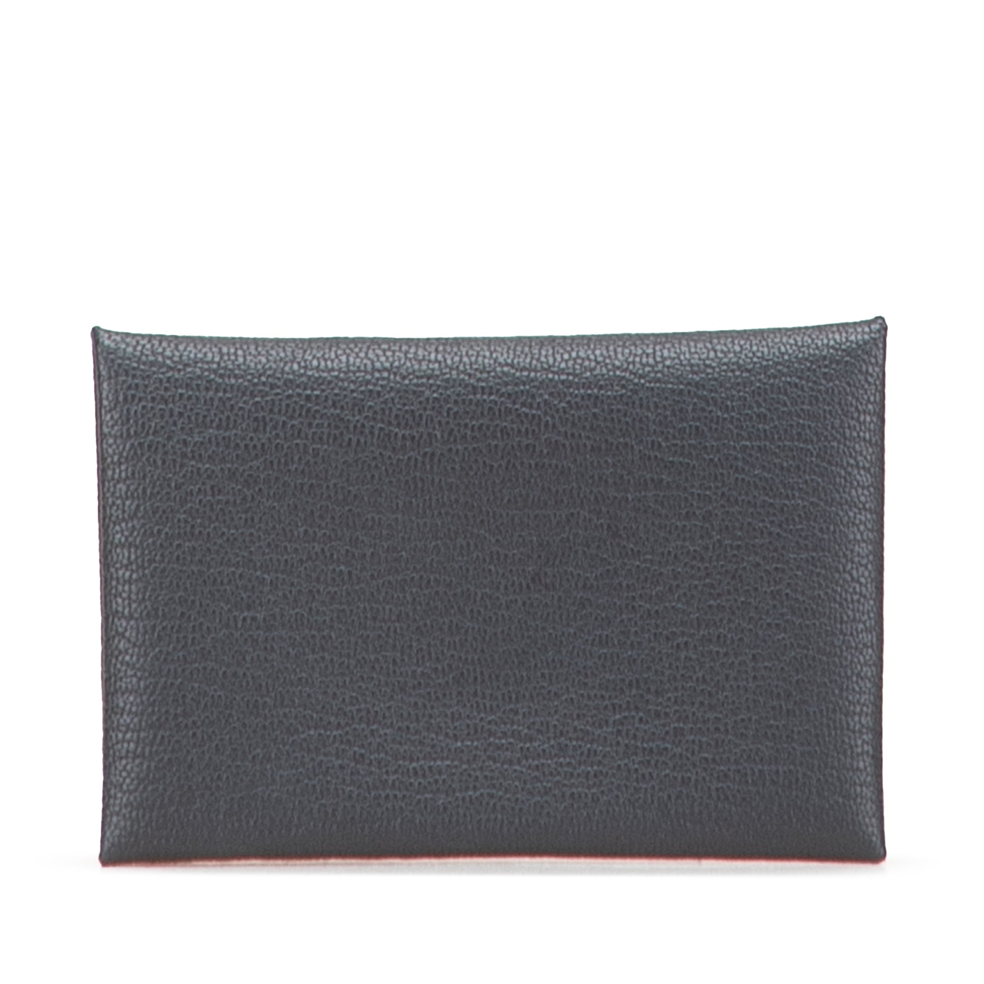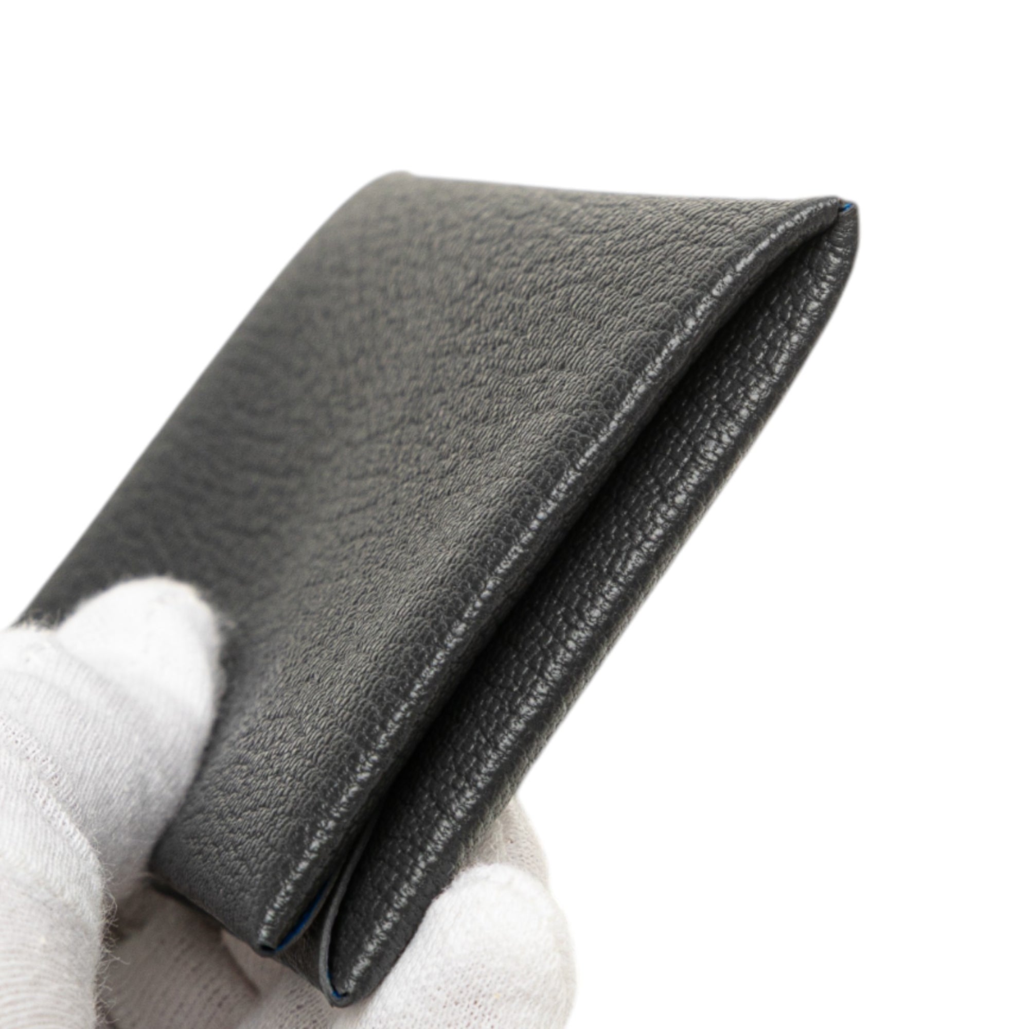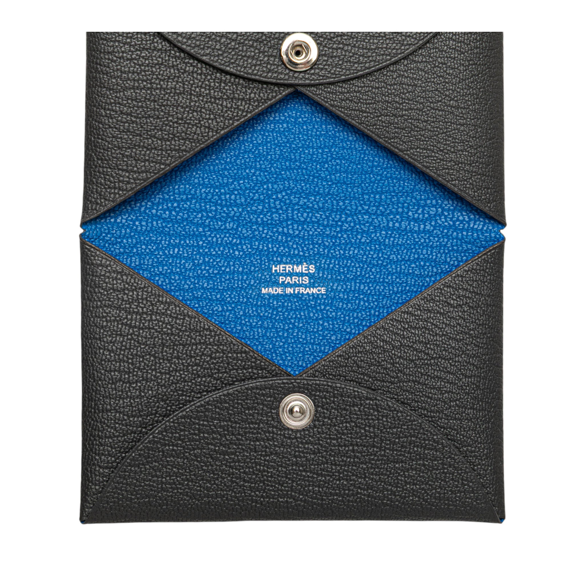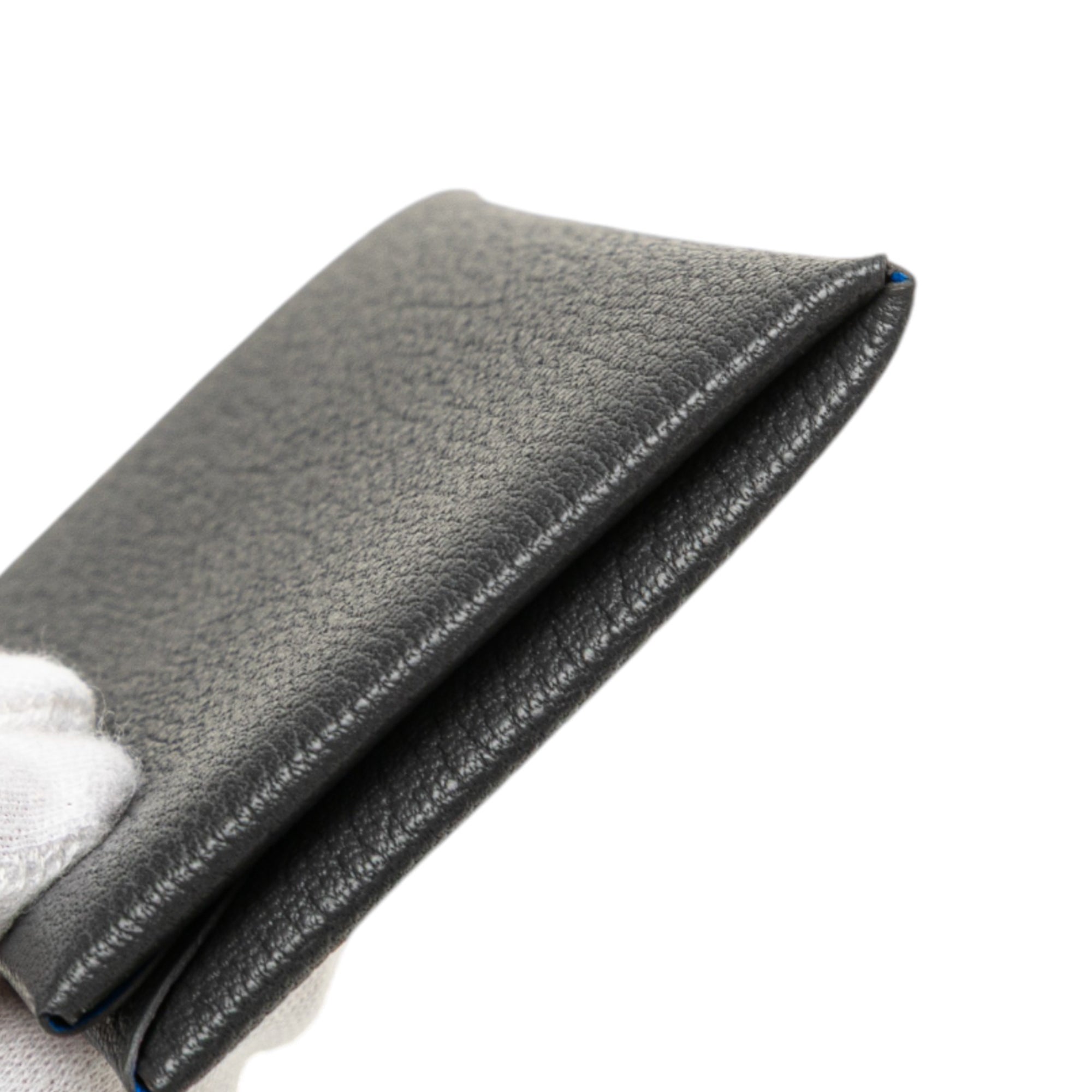 Product Details: Gray Hermès Chevre Mysore Calvi Duo Compact Verso Card Holder. This Calvi card holder features a Chevre Mysore leather body in Ardoise and Bleu Hydra colors, a snap closure, and interior slip compartments. 2.8" L x 4.1" W x 0.6" D. Serial number K.