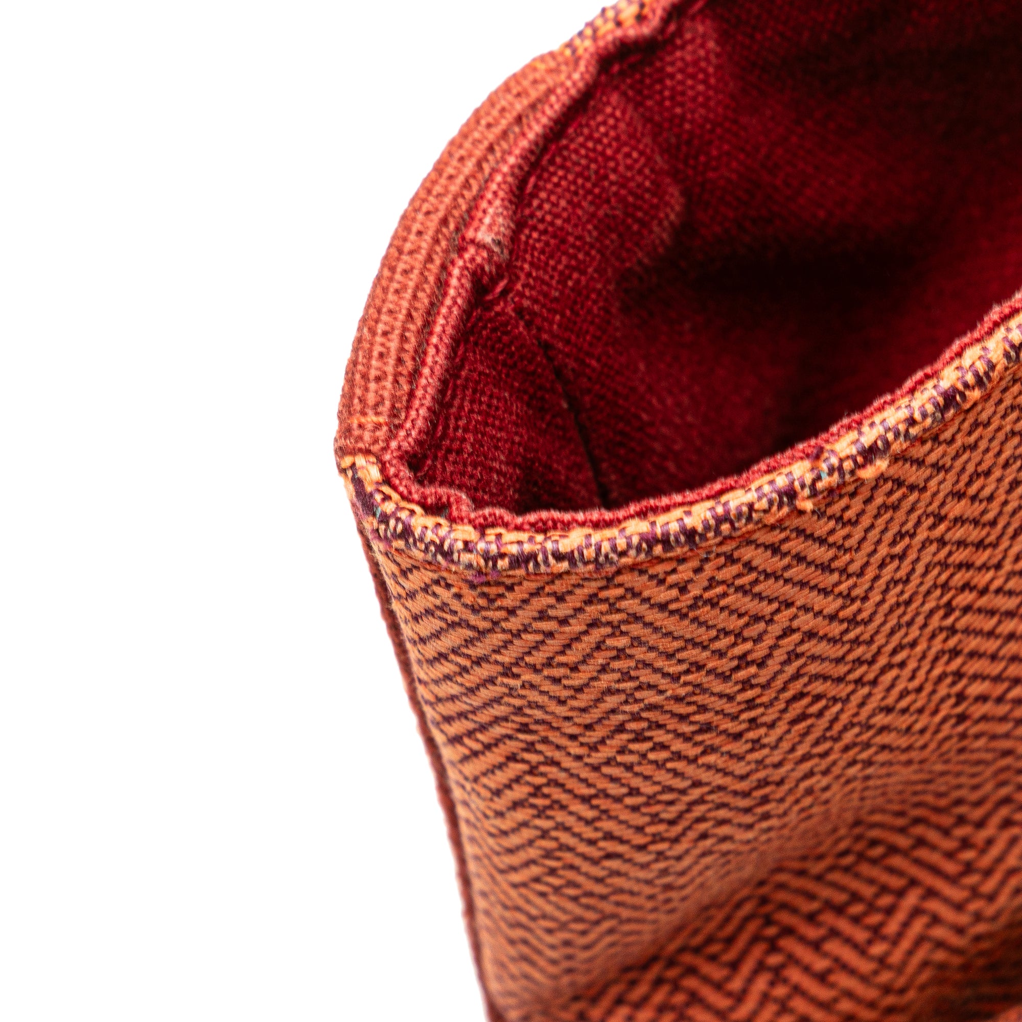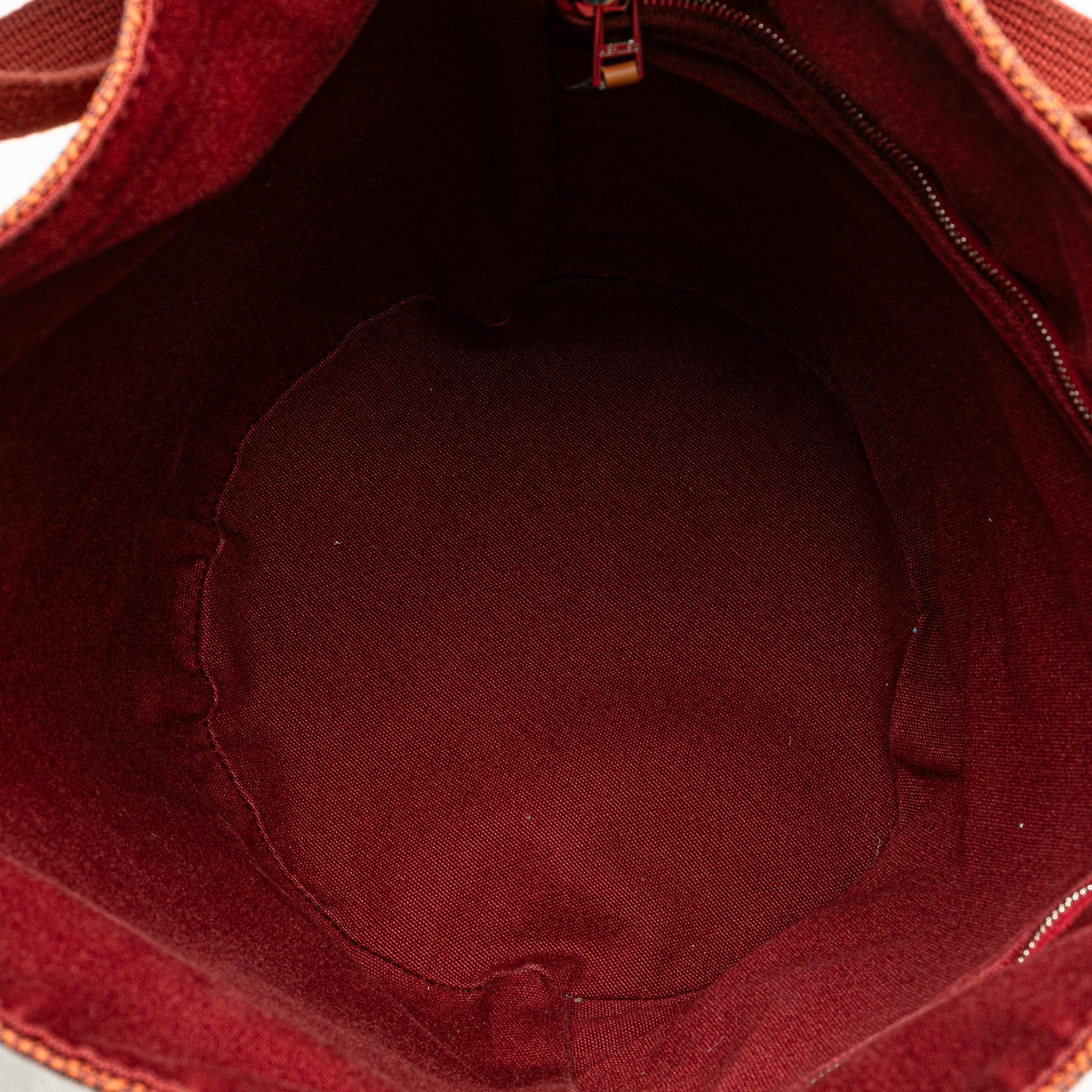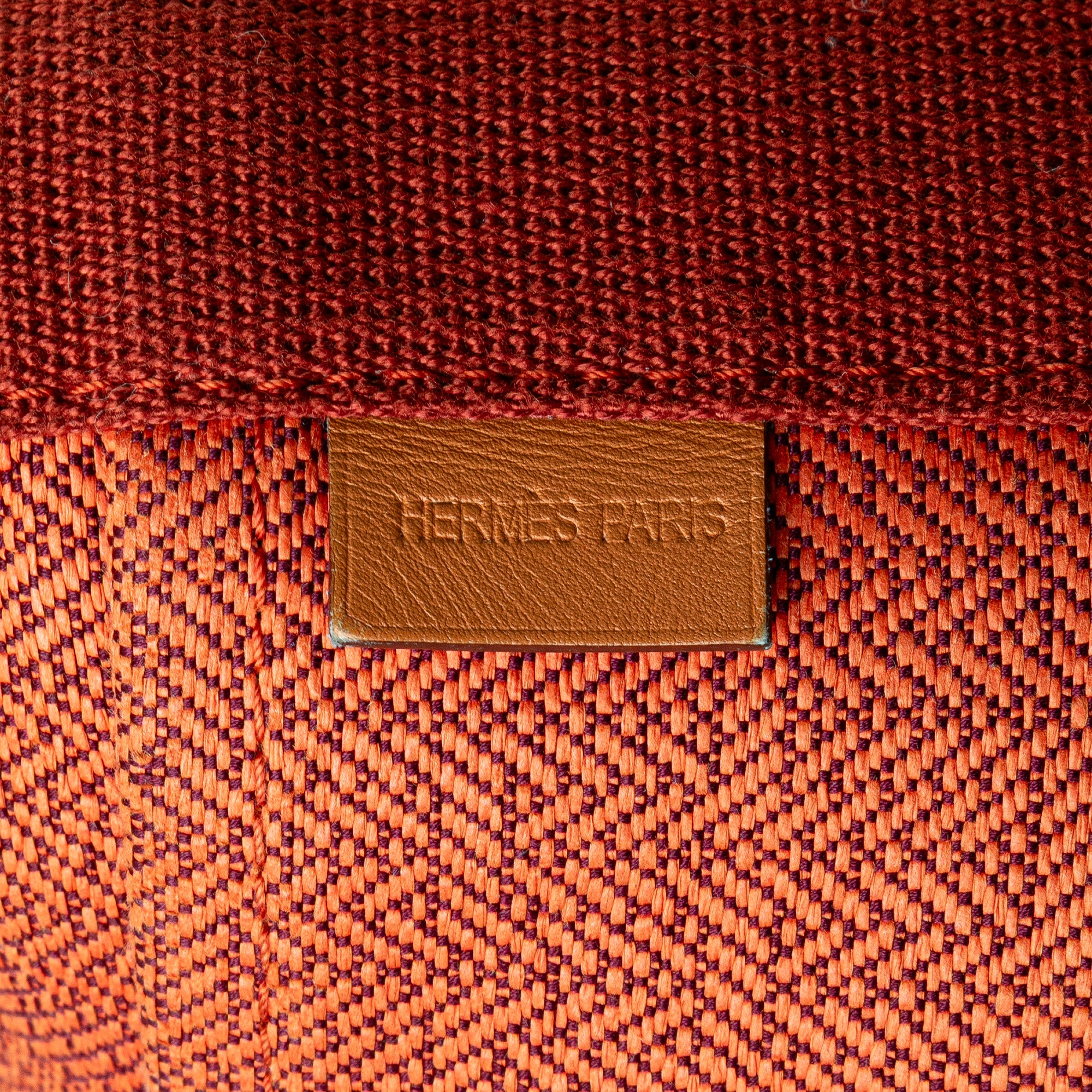 Product Details: Orange Hermès Toile Saxo MM Bucket Bag. The Saxo MM features a canvas body, a flat strap, an open top with a magnetic snap button closure, exterior front and back slip pockets, and an interior zip pocket. 10.2" L x 8.5" W x 8.5" D, 8.3" drop.
