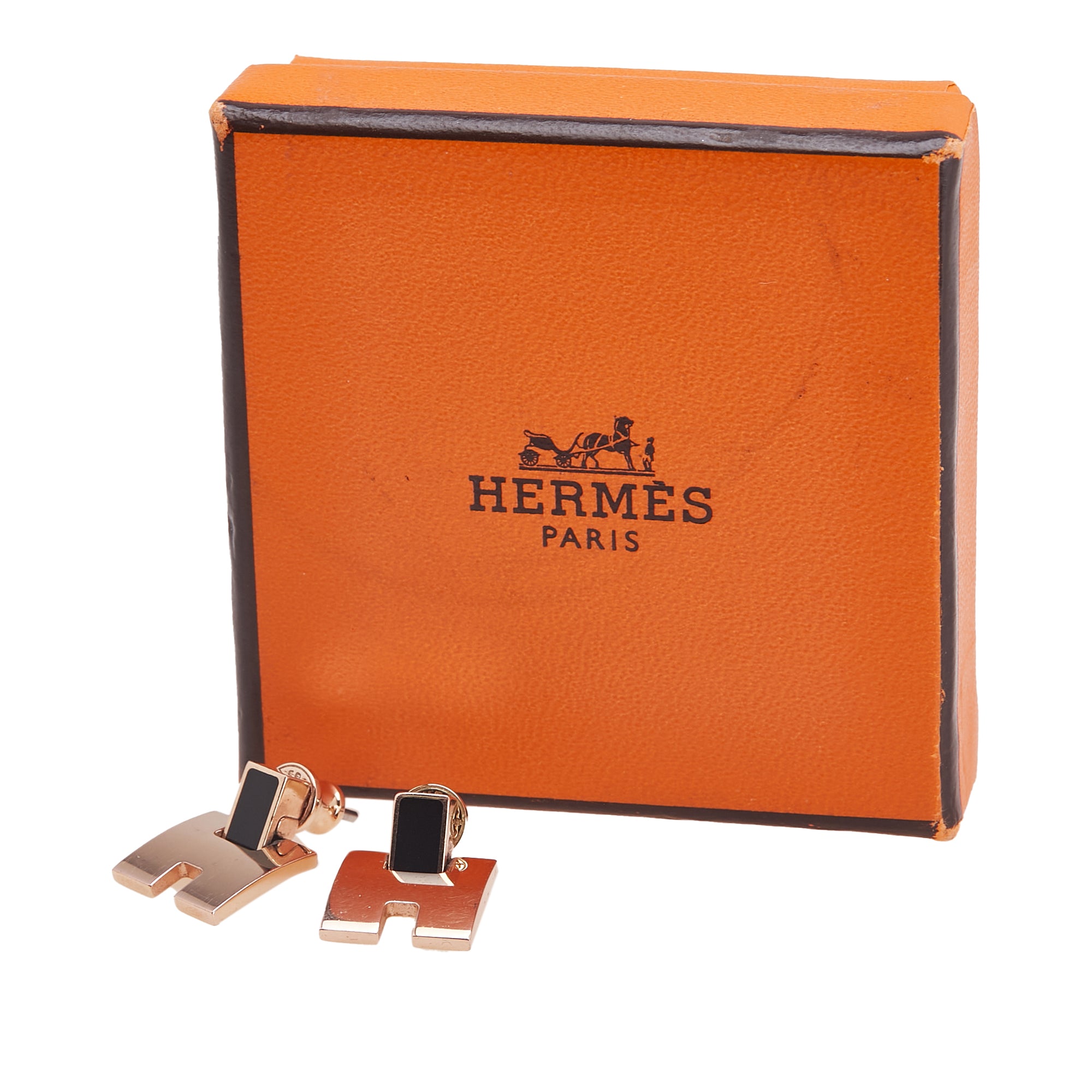 Product Details: Pink Hermès Rose Gold Plated Enamel Eileen Push Back Earrings. These earrings features a rose gold plated metal body with enamel detail and push back closure. 0.7" L x 0.5" W x 0" D.