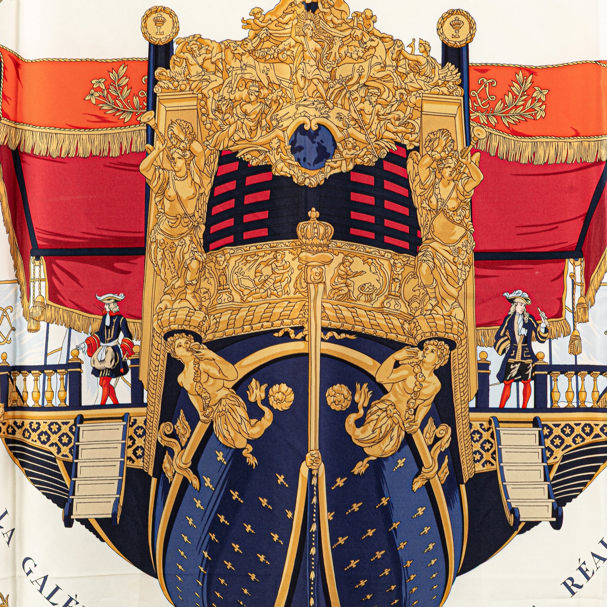 Product Details: Red Hermès Vue Du Carosse De La Galere La Reale Silk Scarf Scarves. The Vue Du Carosse De La Galere La Reale scarf features a print on 100% silk 34.6" L x 34.3" W x 0" D.