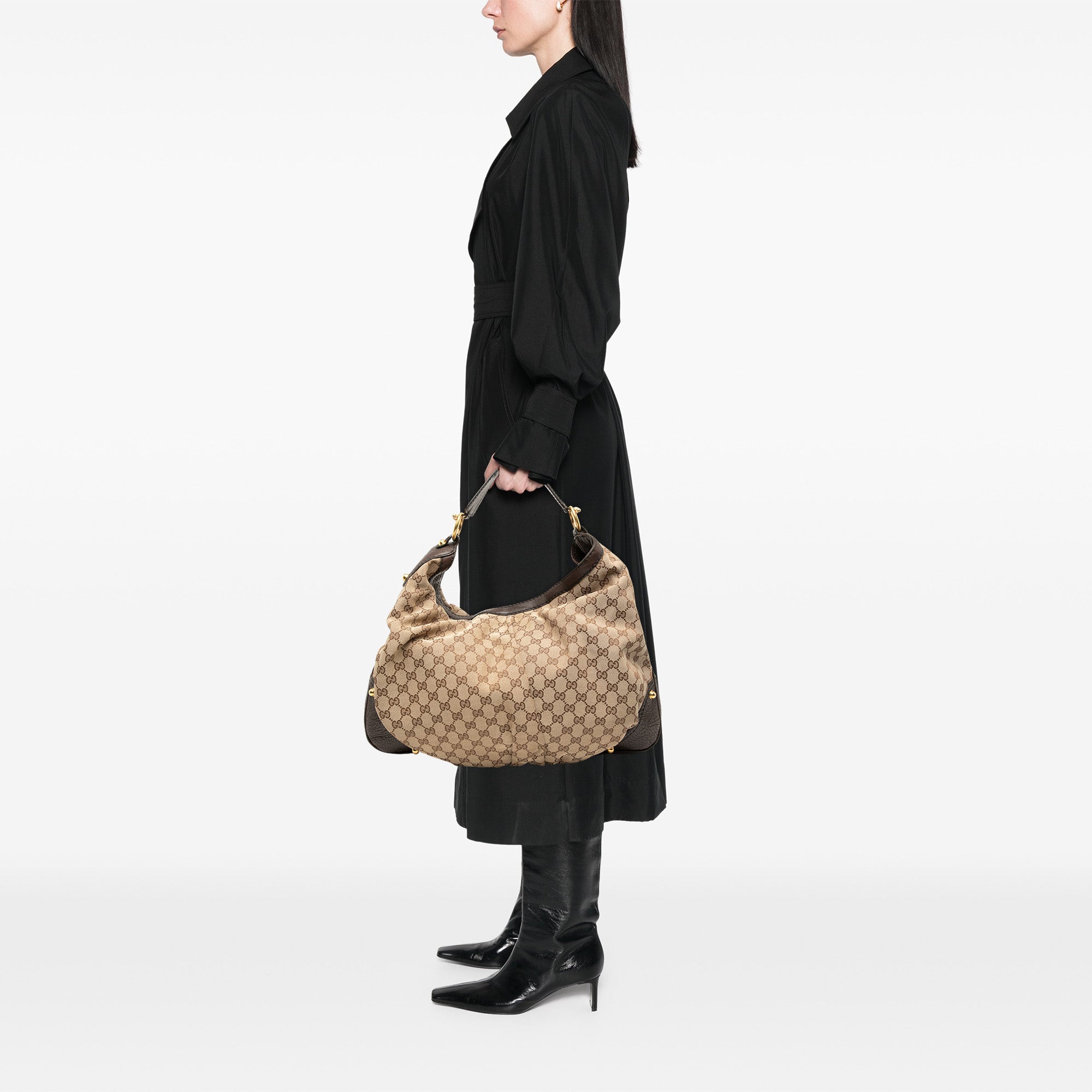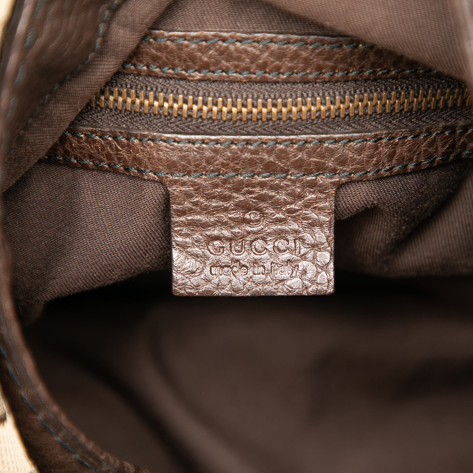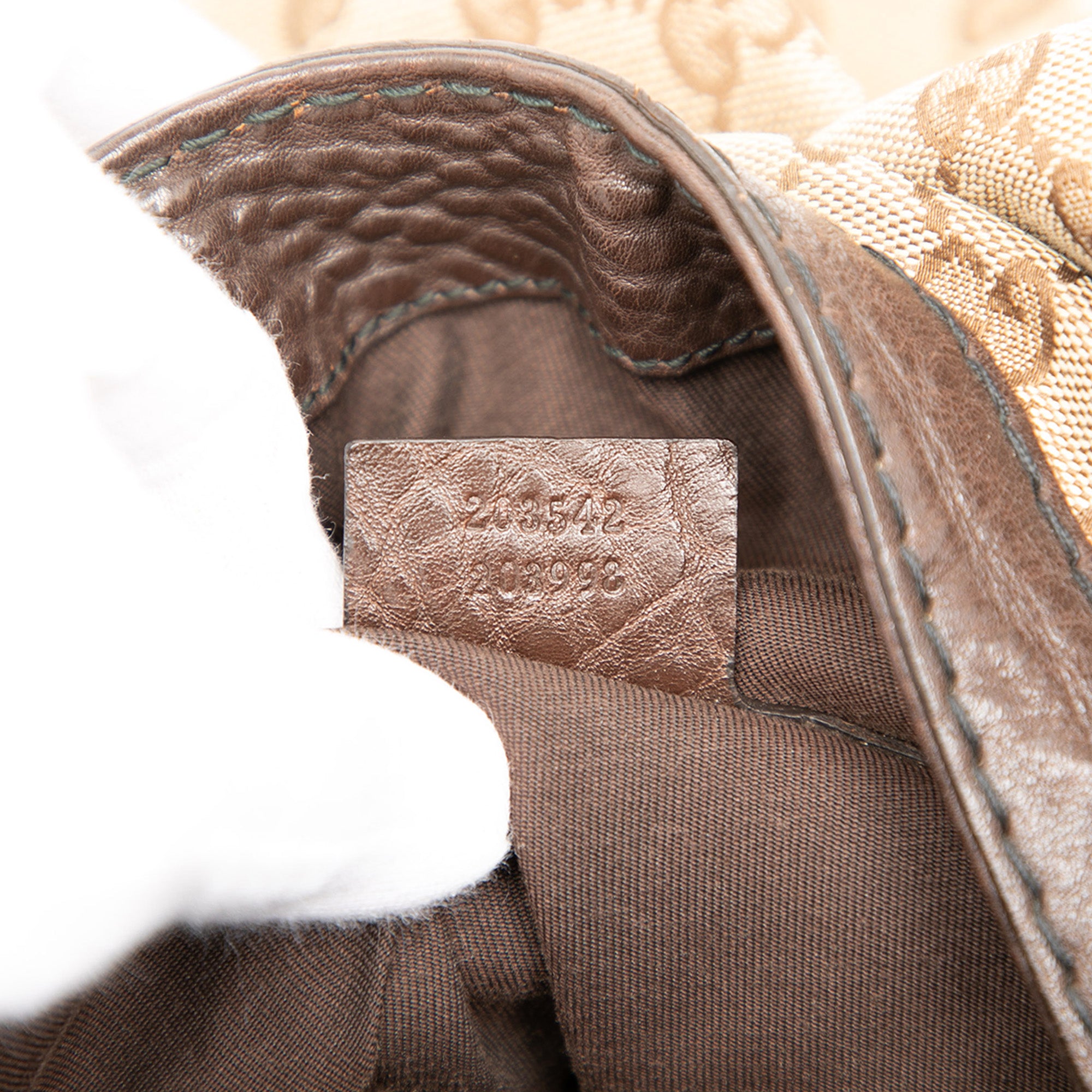 Product Details: Brown Gucci Large GG Canvas Jockey Hobo. The Jockey Hobo features a canvas body with leather trim, a flat leather shoulder strap, an open top, and interior zip and slip pockets. 12.6" L x 18.9" W x 4.3" D, 7.5" drop. Serial number 203542 203998.