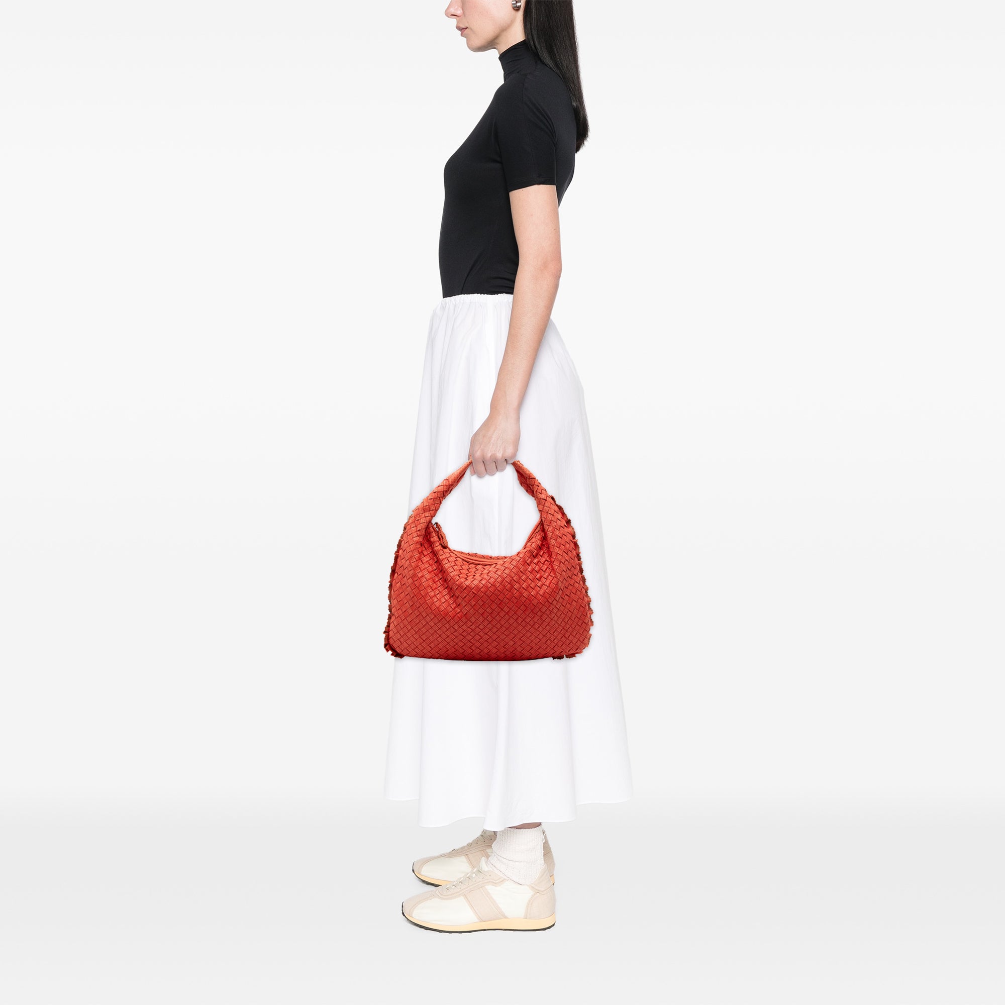 Product Details: Red Bottega Veneta Small Perforated Nappa Intrecciato Veneta Hobo. The Veneta Hobo bag features a perforated woven leather body, a rolled handle, a top zip closure, and an interior zip pocket. 10.2" L x 15.4" W x 1.2" D, 5.5" drop. Serial number 115653.
