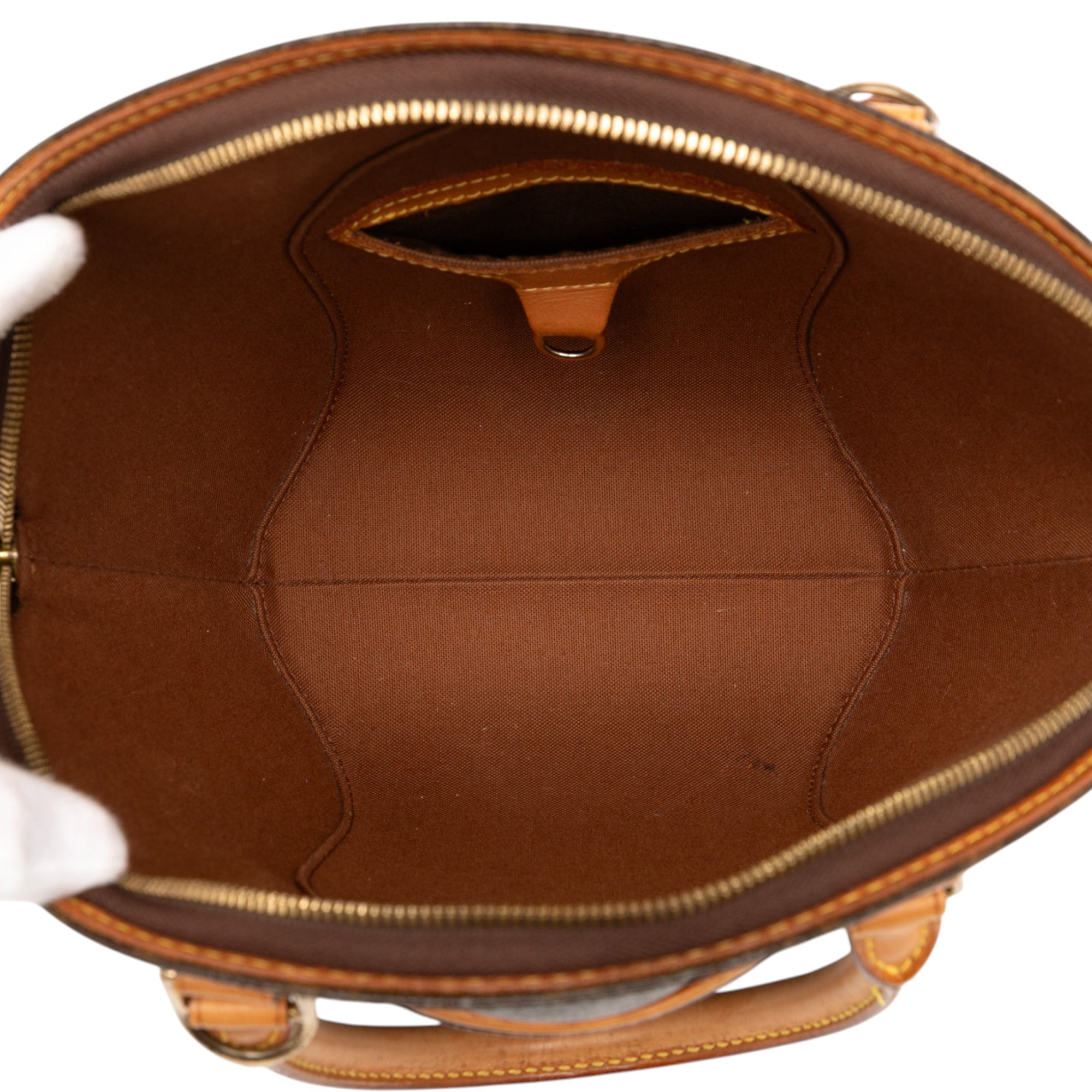 Product Details: Brown Louis Vuitton Monogram Ellipse PM Handbag. The Ellipse PM features a structured monogram canvas body with vachetta leather trim, rolled vachetta leather handles, a top zip closure, and an interior slip pocket. 10.6" L x 8.1" W x 5.5" D, 3.1" drop. Serial number MI0041.