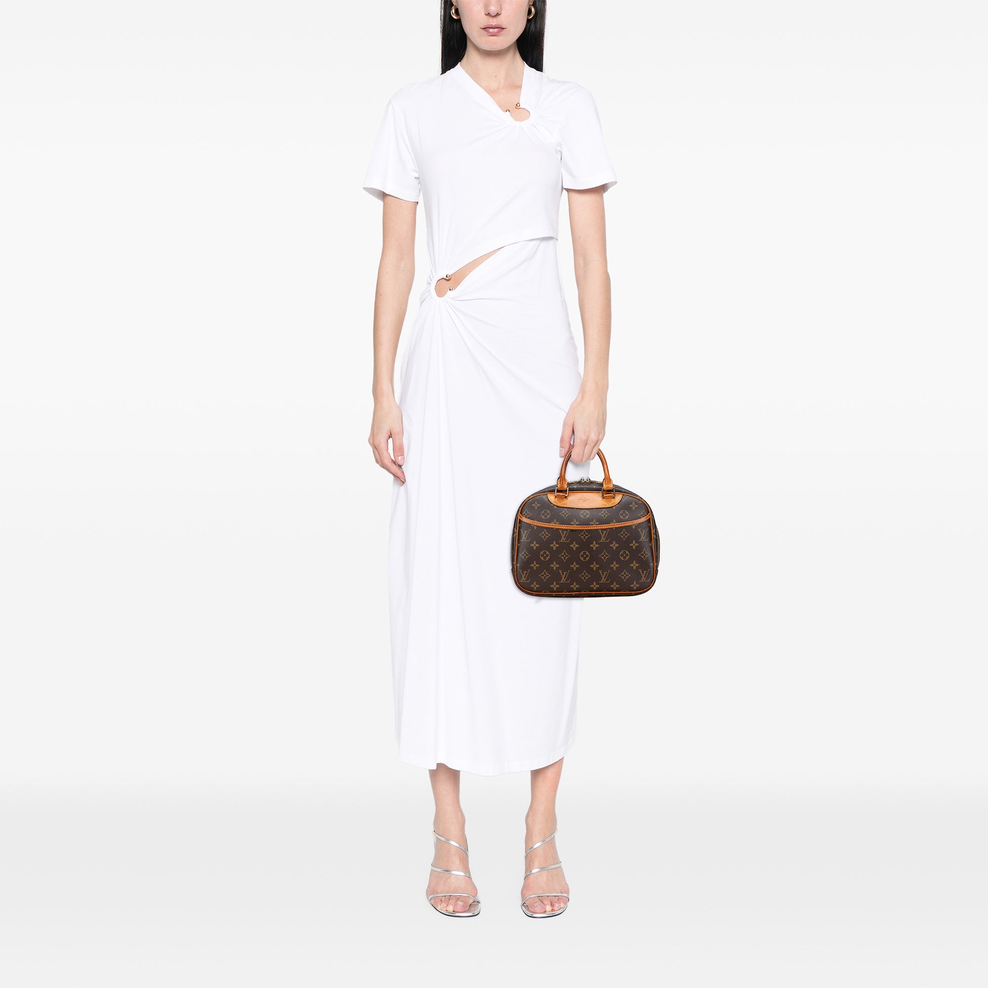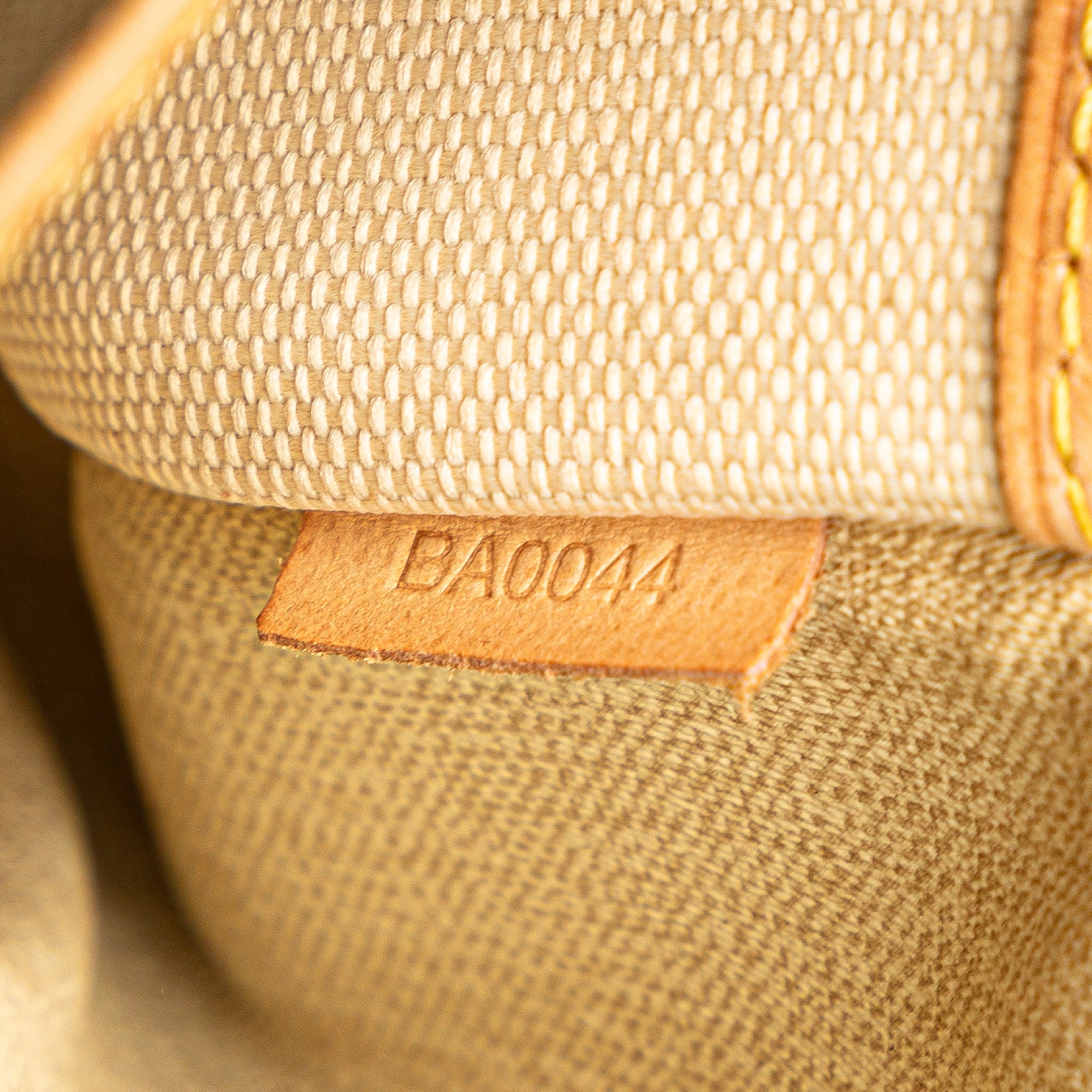 Product Details: Brown Louis Vuitton Monogram Trouville Handbag. The Trouville features a monogram canvas with vachetta leather trim, rolled vachetta leather handles, a top zip closure, an exterior front slip pocket, and interior open pockets. 9.1" L x 10.6" W x 3.9" D, 3.1" drop. Serial number BA0044.