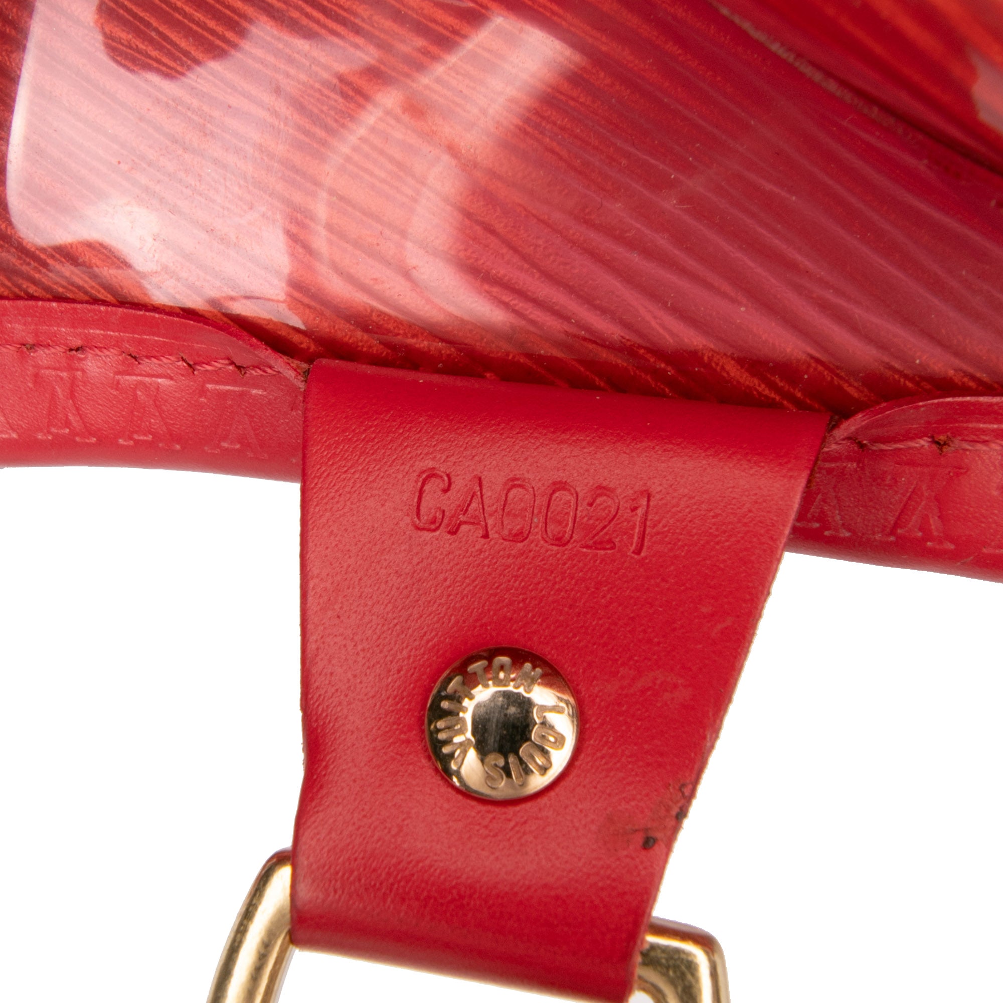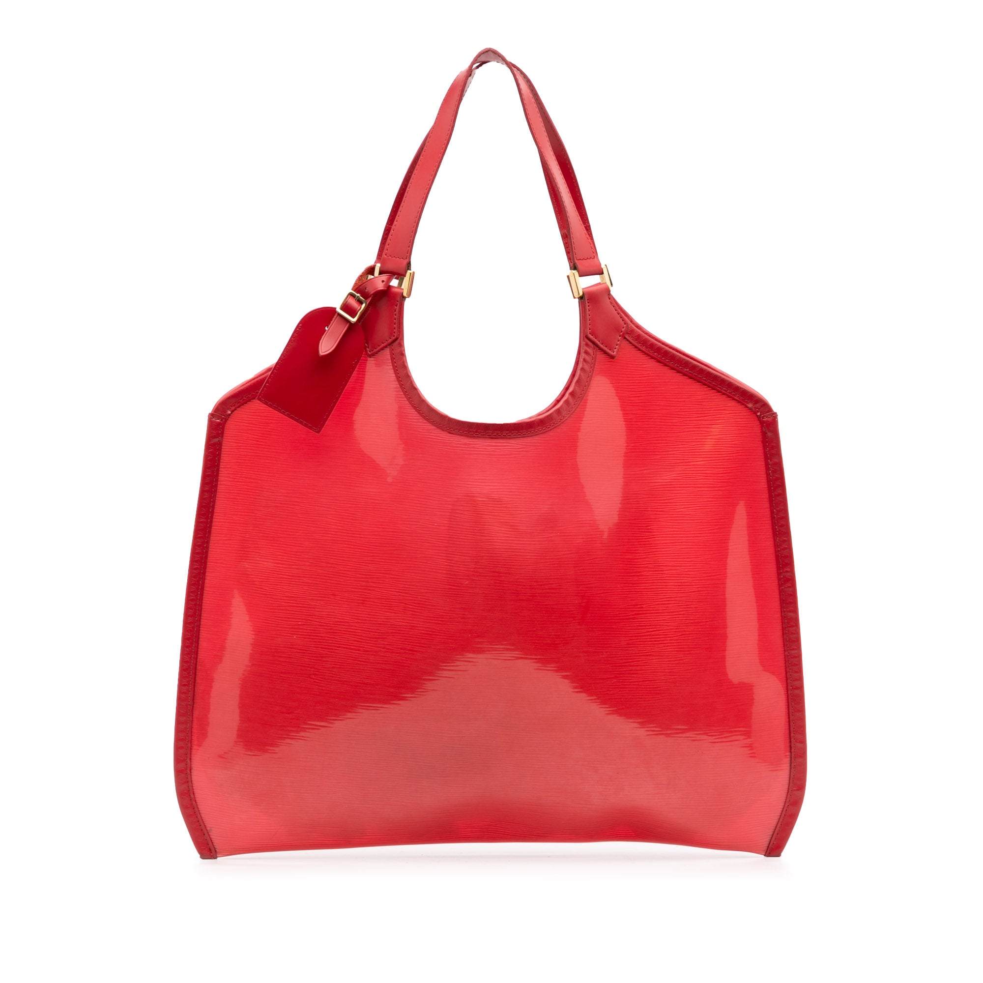 Product Details: Red Louis Vuitton Epi Plage Baia . The Baia features an epi leather body, flat leather straps, a leather luggage tag, and an open top. 13" L x 17.5" W x 0.2" D. Serial number CA0021.