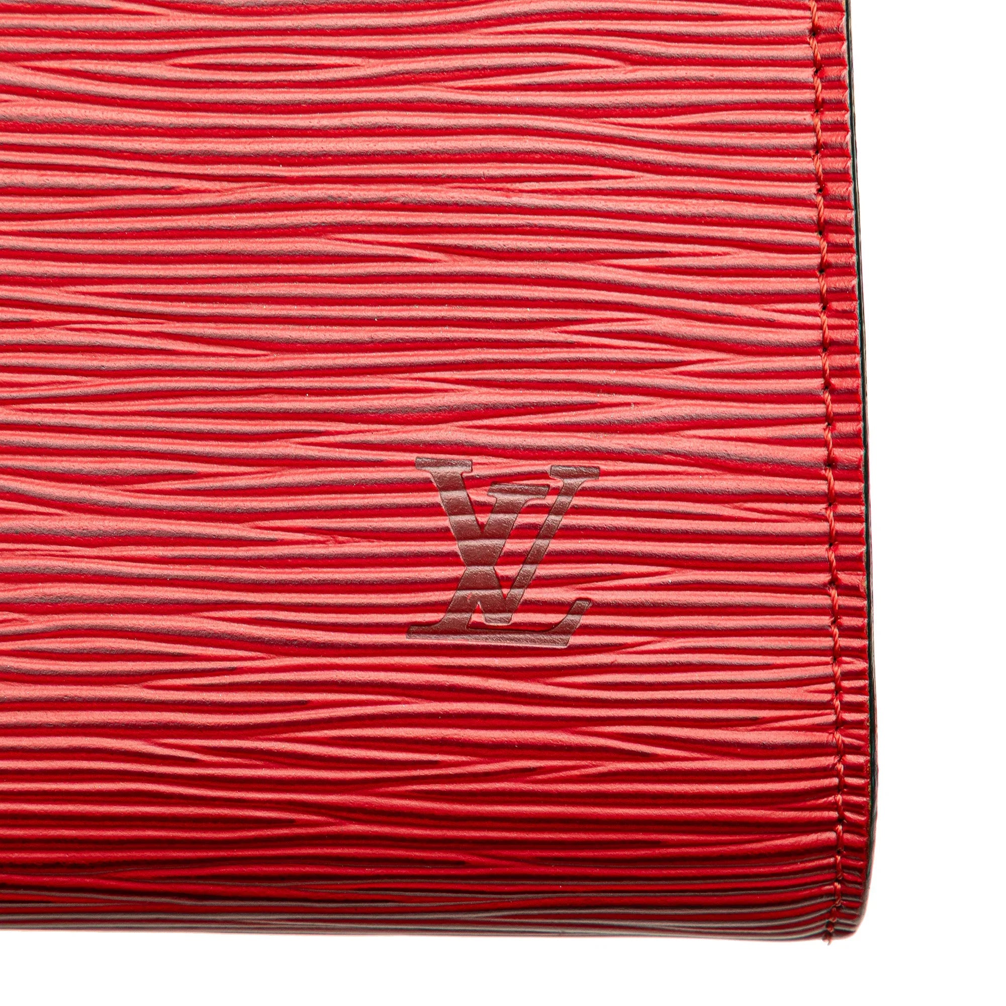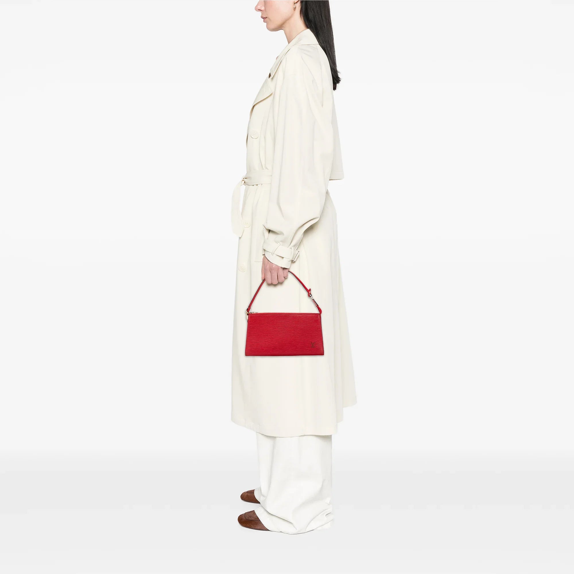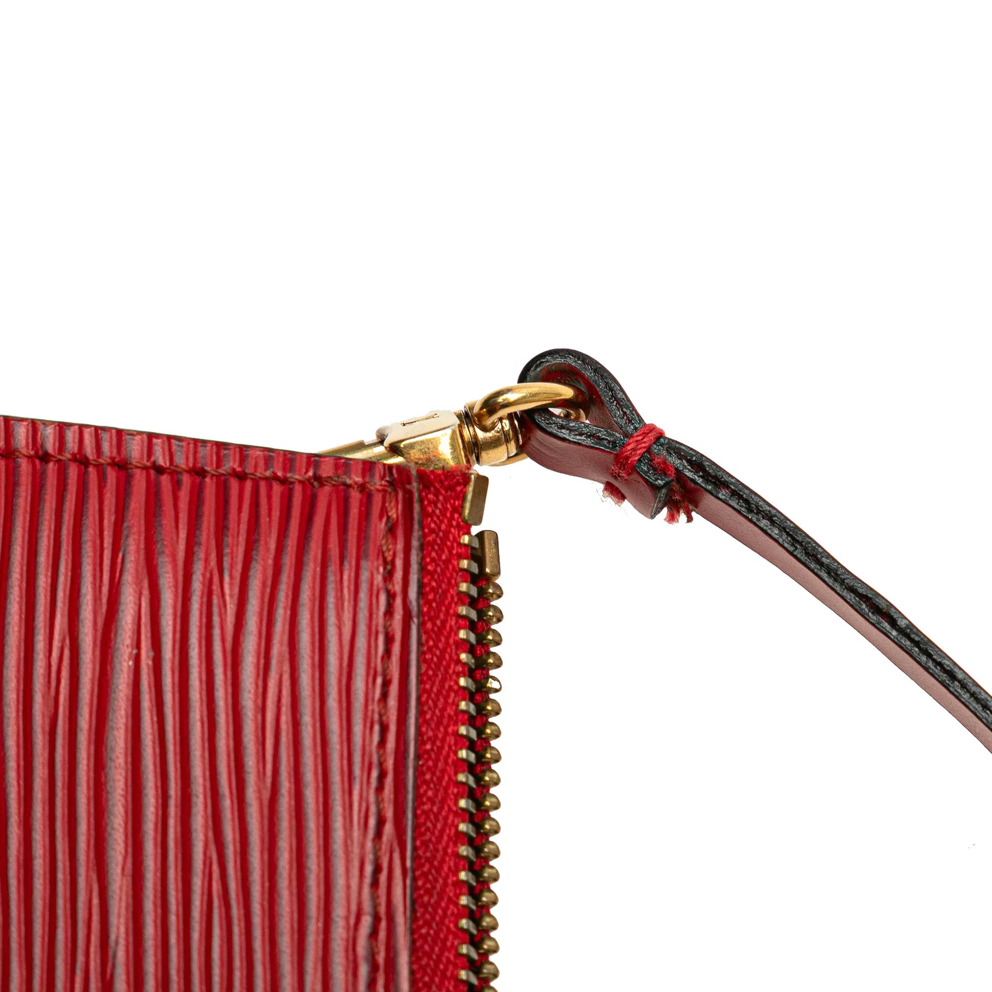 Product Details: Red Louis Vuitton Epi Pochette Accessoires Shoulder Bag. The Pochette Accessoires features an epi leather body, a flat leather shoulder strap, and a top zip closure. 5.1" L x 9.4" W x 1" D, 5.5" drop. Serial number AR1002.