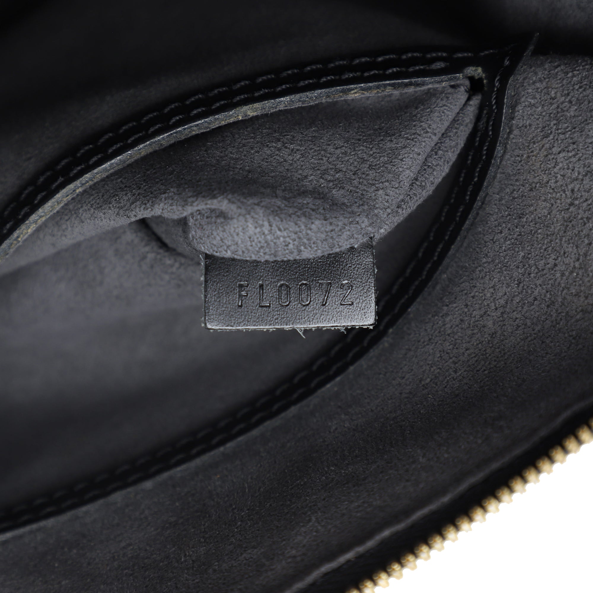 Product Details: Black Louis Vuitton Epi Alma PM Handbag. The Alma PM features an epi leather body, rolled leather handles, a top zip closure, and an interior slip pocket. 9.3" L x 11.8" W x 6.3" D, 3.5" drop. Serial number FL0072.