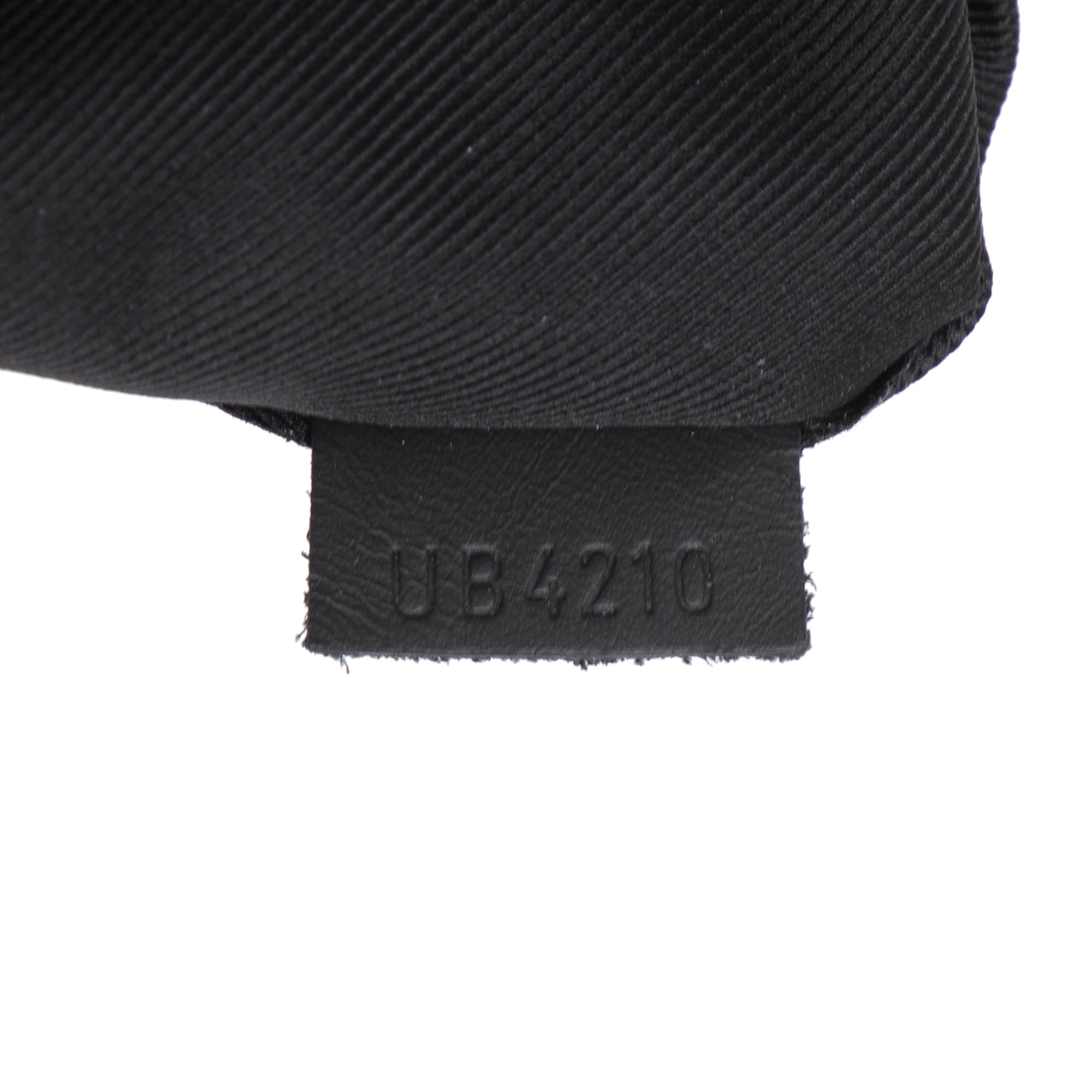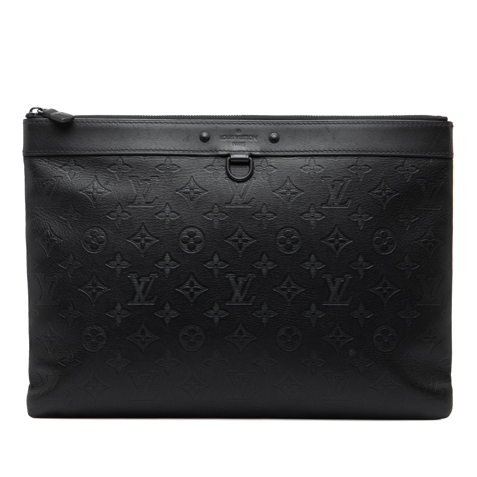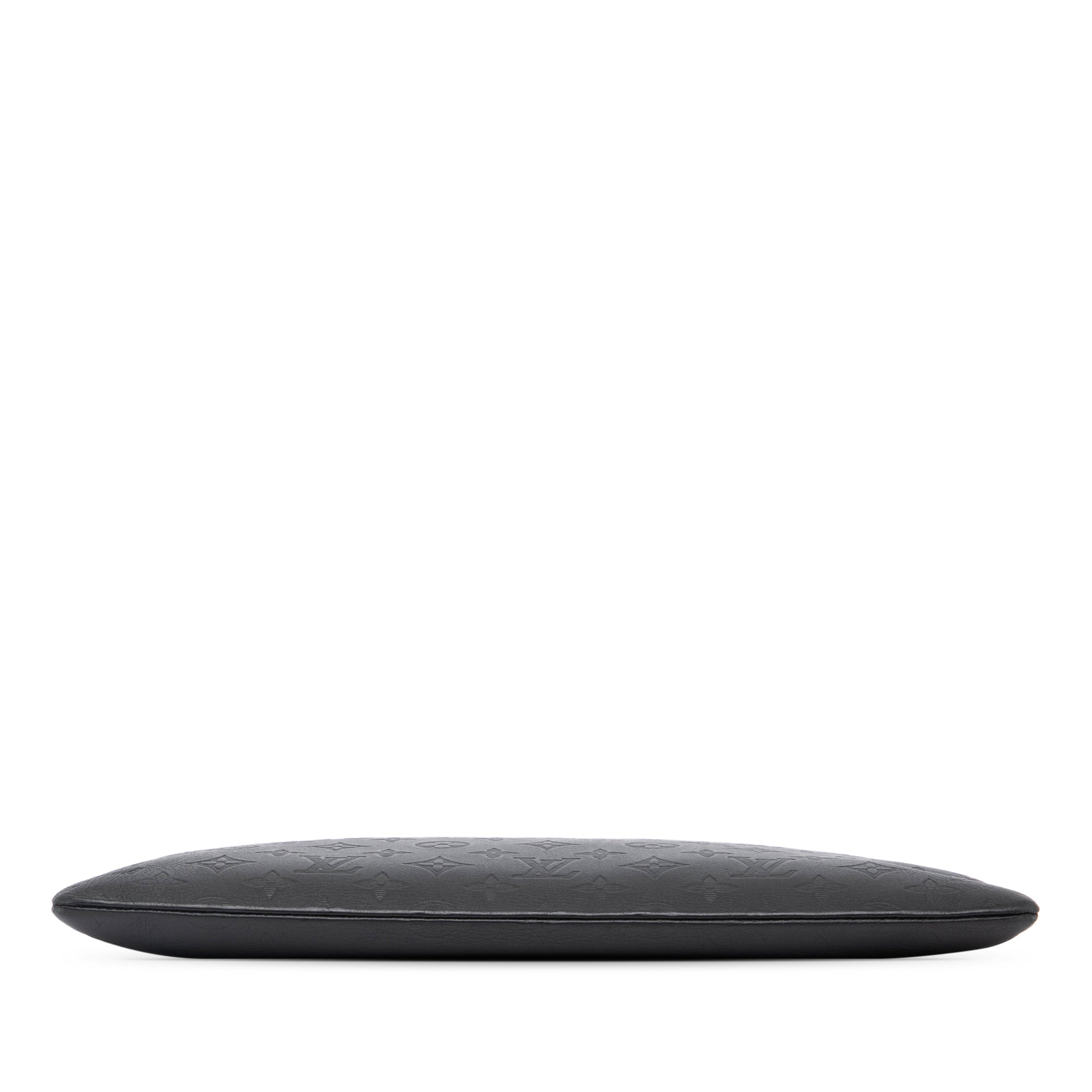 Product Details: Black Louis Vuitton Monogram Shadow Discovery Pochette Clutch Bag. The Discovery Pochette features a leather body, a top zip closure, and an interior slip pocket. 10" L x 14" W x 0.2" D. Serial number UB4210.