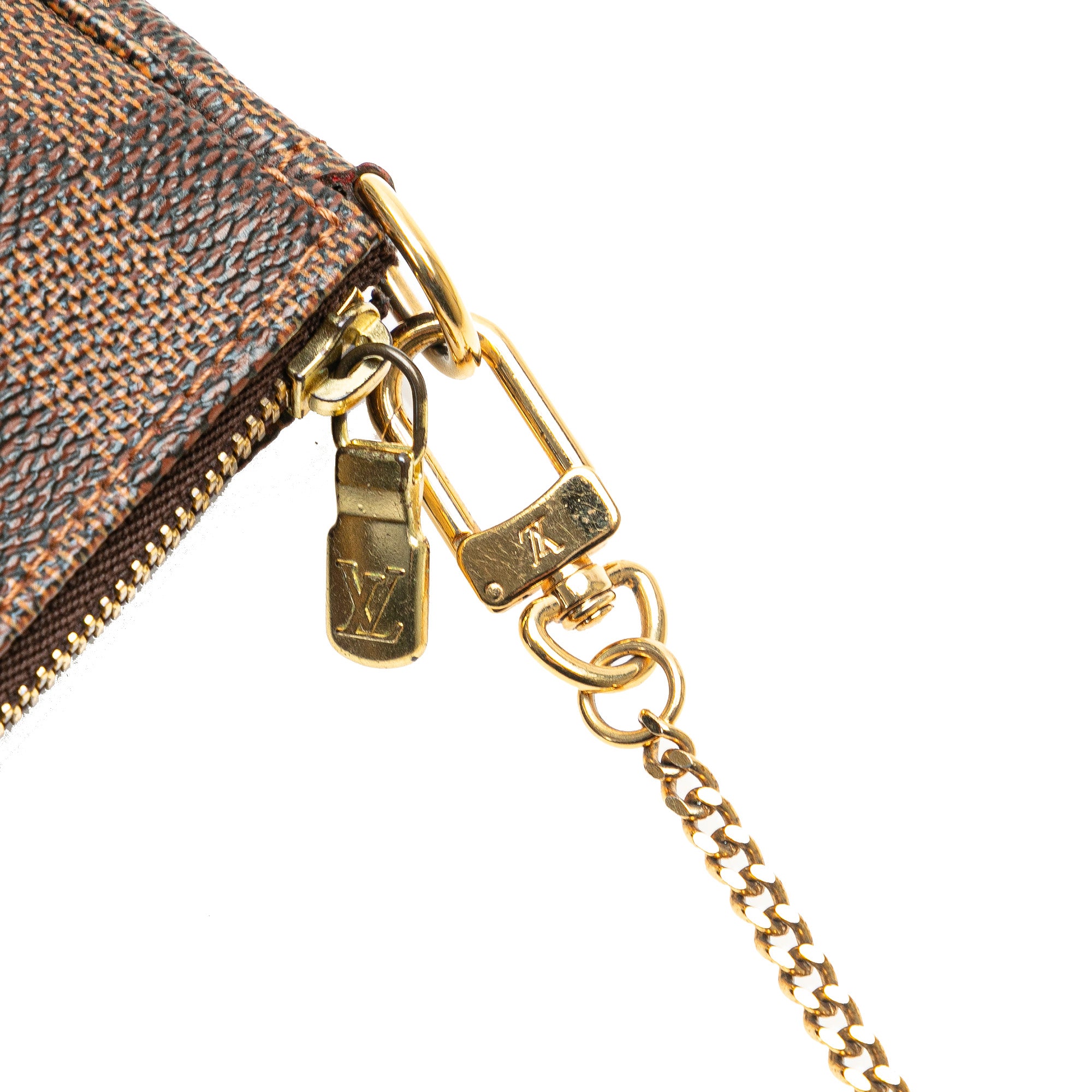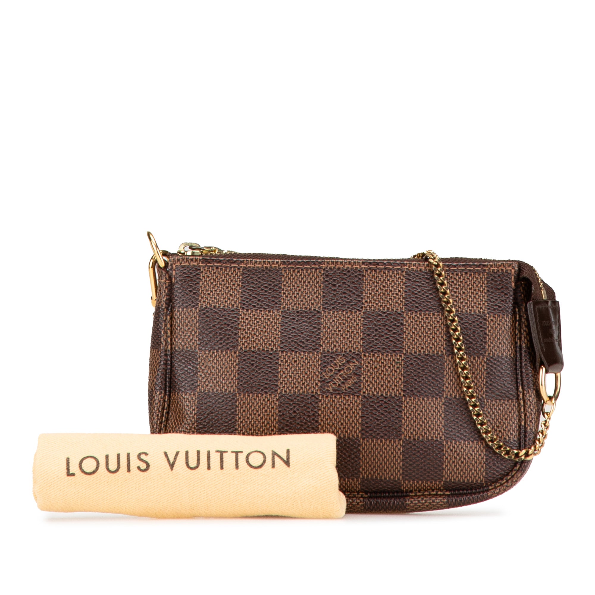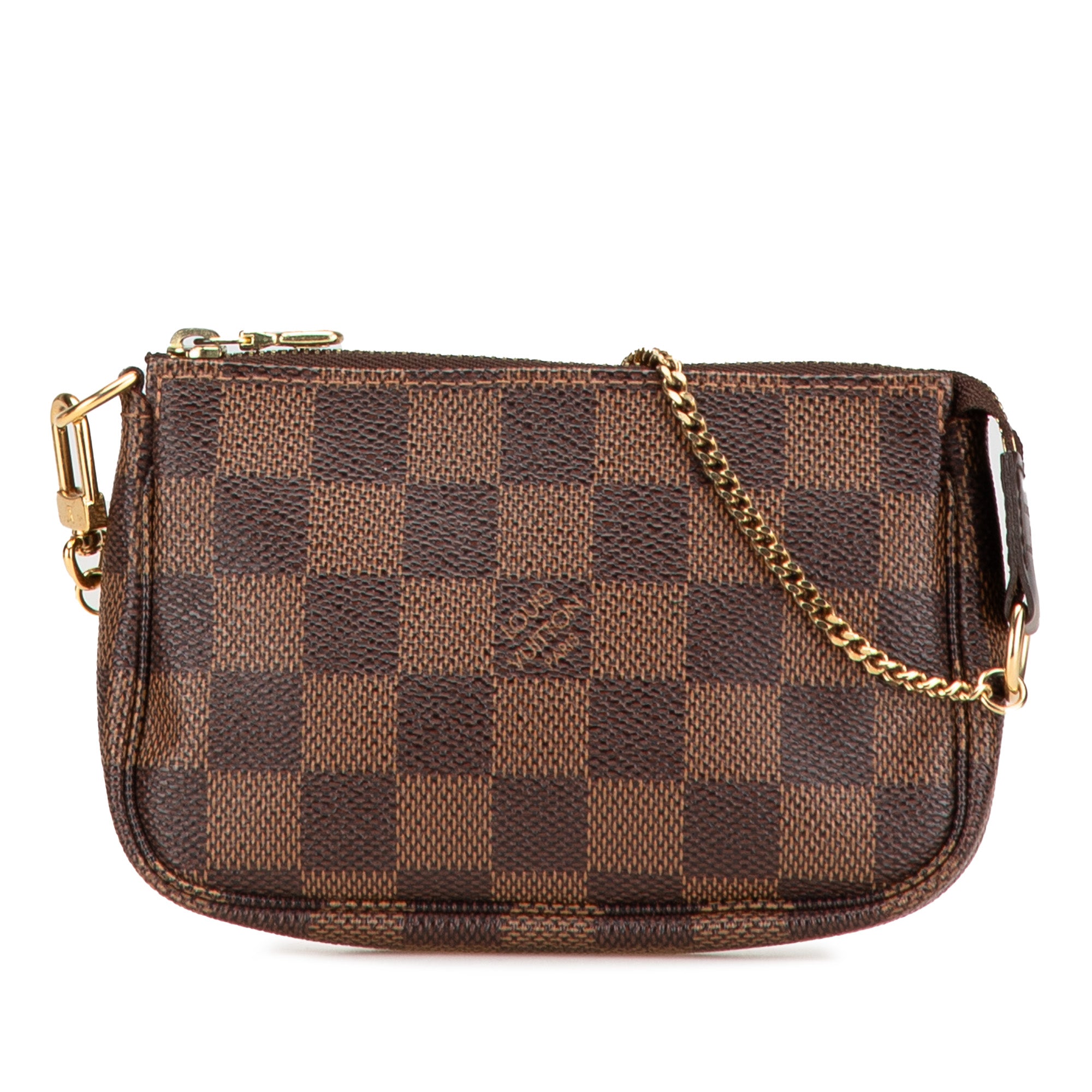 Product Details: Brown Louis Vuitton Damier Ebene Mini Pochette Accessoires Handbag. The Mini Pochette Accessoires features a damier ebene canvas body, a chain link strap, and a top zip closure. 3.7" L x 5.7" W x 1" D, 5.5" drop. Serial number DU2122.
