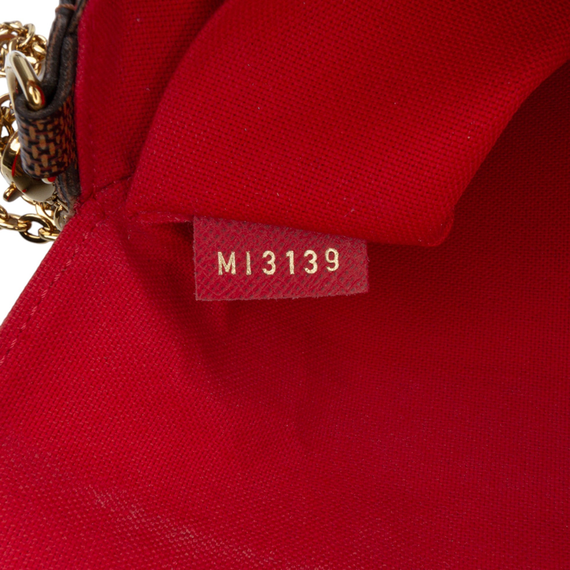 Product Details: Brown Louis Vuitton Damier Ebene Pochette Felicie Crossbody Bag. The Pochette Felicie features a damier ebene canvas body, a detachable chain link shoulder strap, a flap with a snap button closure, an interior slip pocket, and pouch inclusions. 4.9" L x 8.3" W x 1.2" D. Serial number MI3139.