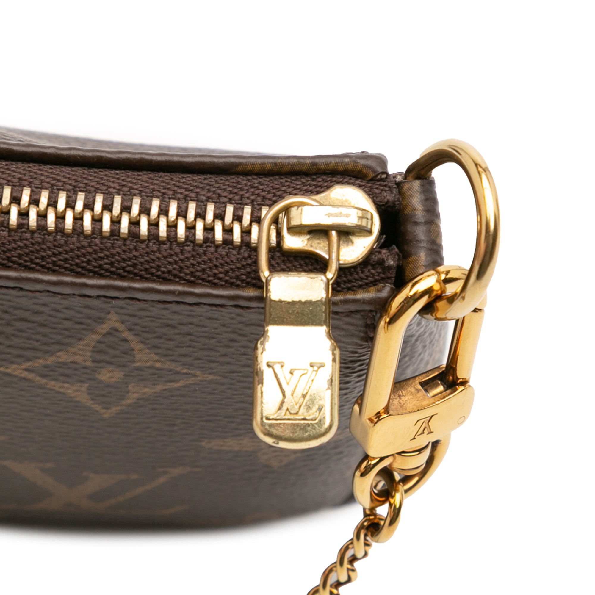 Product Details: Brown Louis Vuitton Monogram Mini Pochette Accessoires Handbag. The Mini Pochette Accessoires features a monogram canvas body, a gold-tone chain strap, and a top zip closure. 3.7" L x 5.7" W x 1.4" D, 6.5" drop. Serial number UB4250.