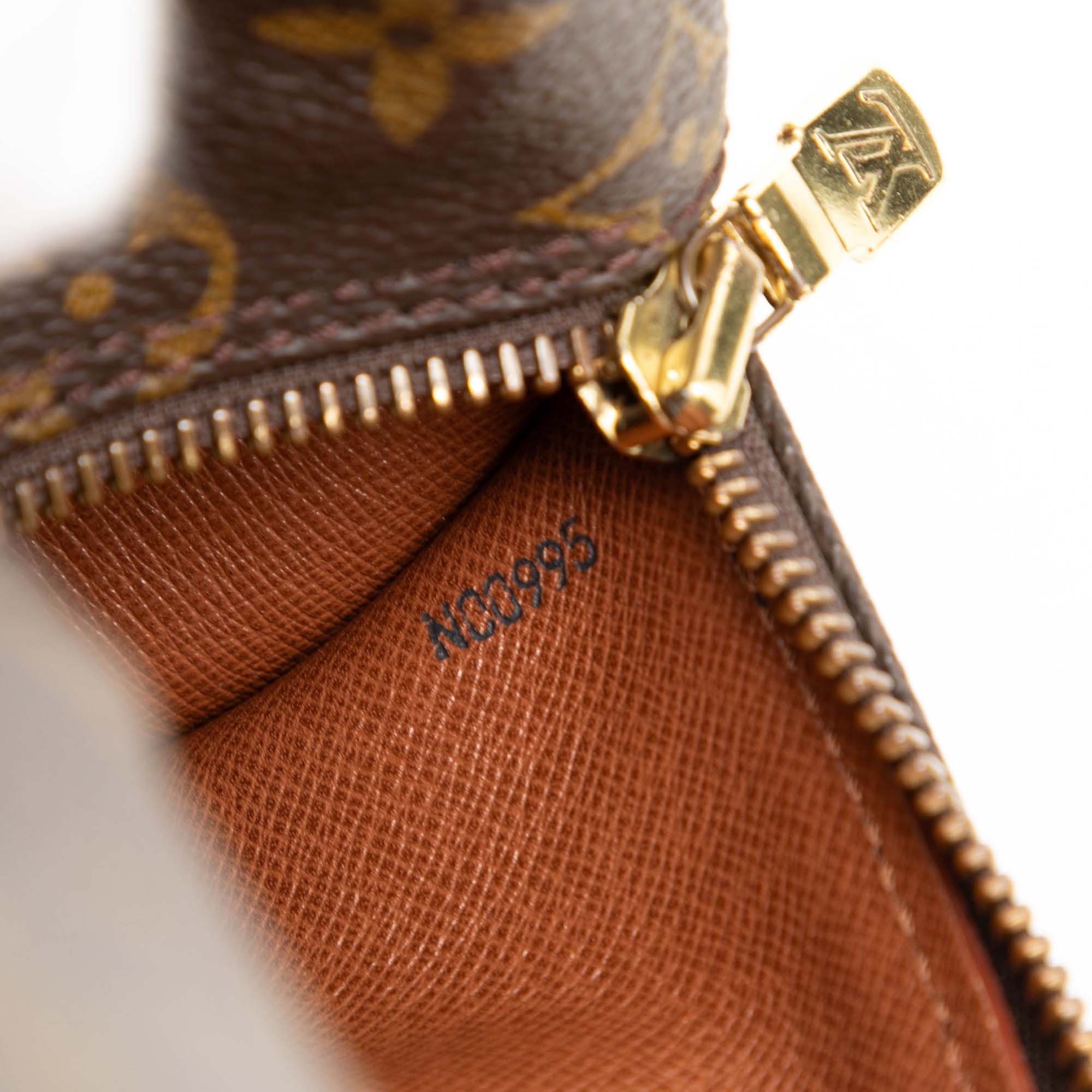 Product Details: Brown Louis Vuitton Monogram Papillon 26 Handbag. The Papillon 26 features a monogram canvas body, flat leather handles, and a top zip closure. 5.1" L x 10.2" W x 5.1" D, 3.9" drop. Serial number NO0995.