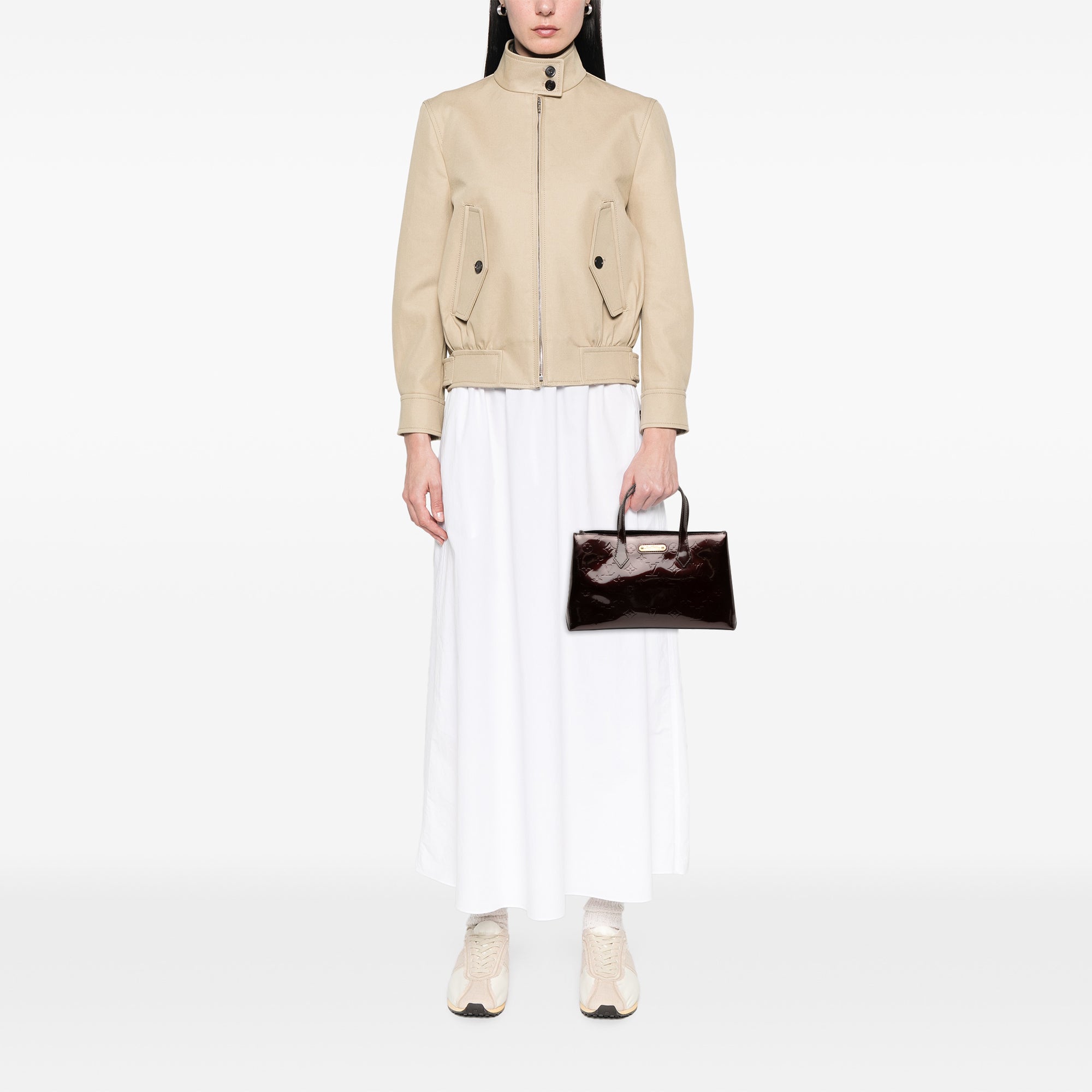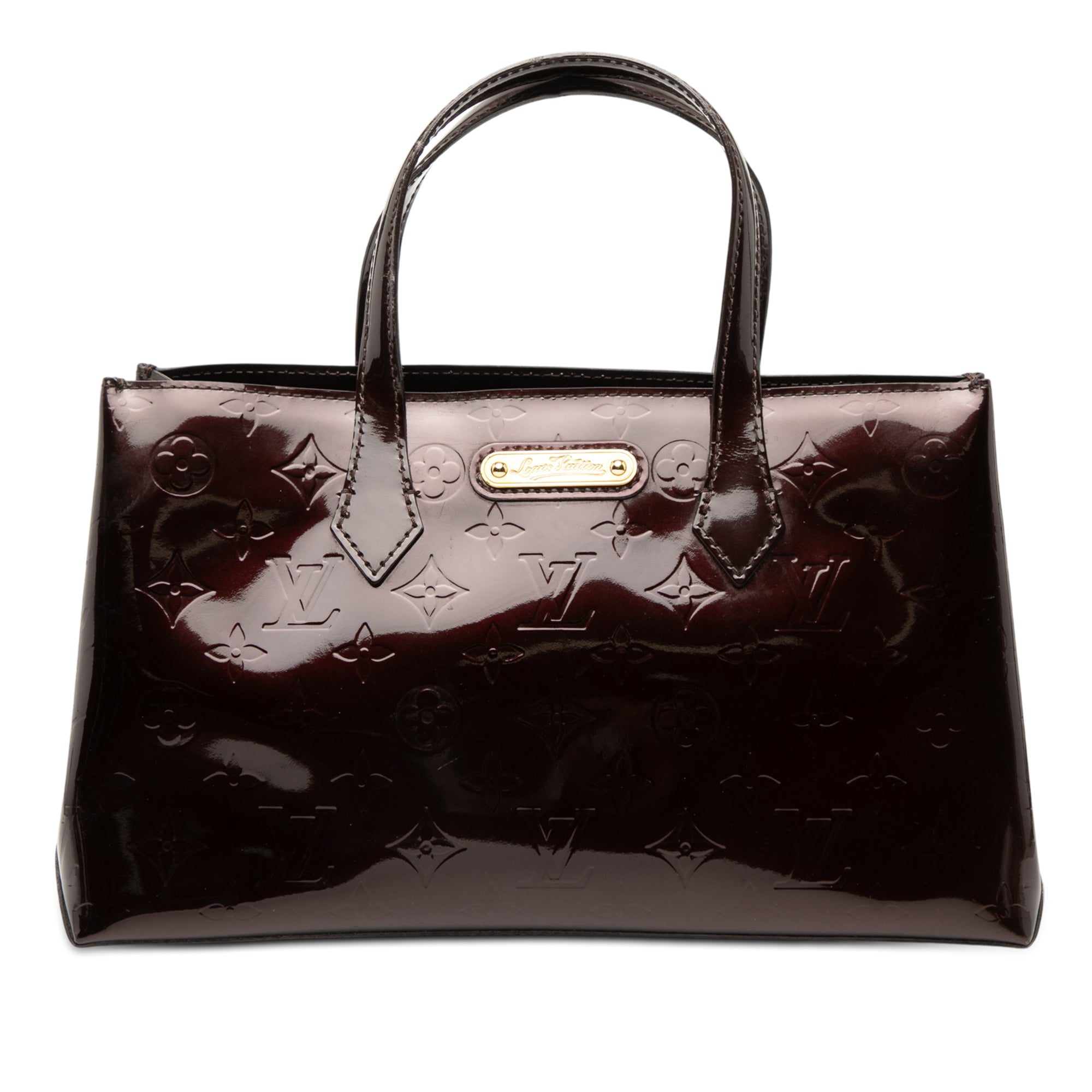Product Details: Purple Louis Vuitton Monogram Vernis Wilshire PM Handbag. The Wilshire PM features a monogram vernis leather body, flat leather handles, an open top with a lobster clasp closure, and an interior zip pocket. 7.1" L x 11.2" W x 4.3" D, 3.9" drop.