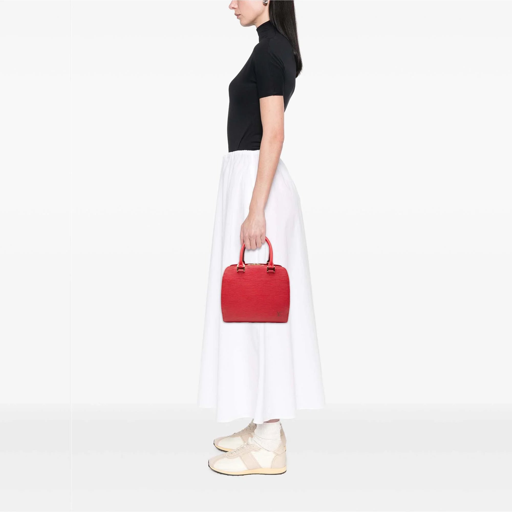 Product Details: Red Louis Vuitton Epi Pont Neuf Handbag. The Pont Neuf features an epi leather body, rolled leather handles, a 2-way top zip closure, and an interior slip pocket. 8.7" L x 9.6" W x 4.5" D, 4.3" drop. Serial number MI0051.
