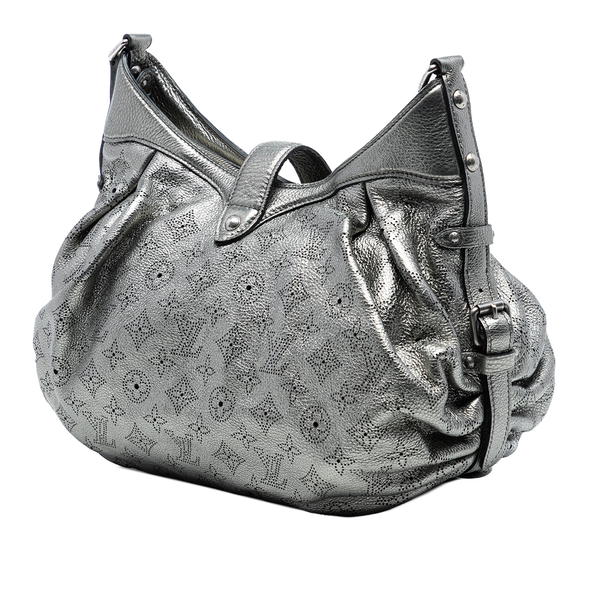 Product Details: Silver Louis Vuitton Monogram Mahina XS Crossbody Bag. This crossbody bag features a mahina leather body, an adjustable flat leather shoulder strap, a front strap with a push lock closure and a top zip closure, and interior slip pockets. 11.4" L x 14.4" W x 5.5" D, 11.4" drop. Serial number MB0078.