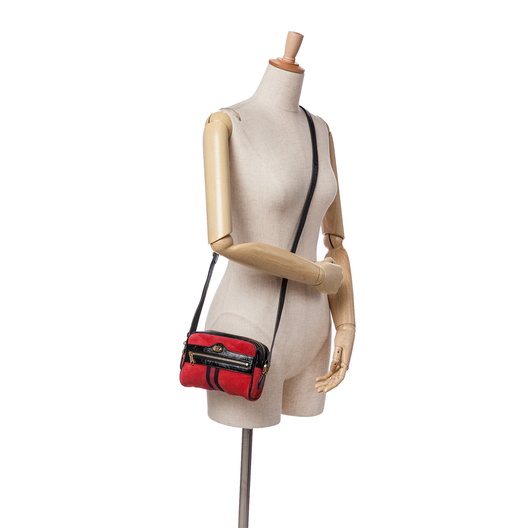 Product Details: Red Gucci Mini Suede Ophidia Crossbody. The Ophidia crossbody bag features a suede body with patent leather trim and web detail, an adjustable flat leather strap, a top zip closure, an exterior front zip pocket, and an interior slip pocket. 4.3" L x 7.7" W x 2.2" D. Serial number 517350 493075.
