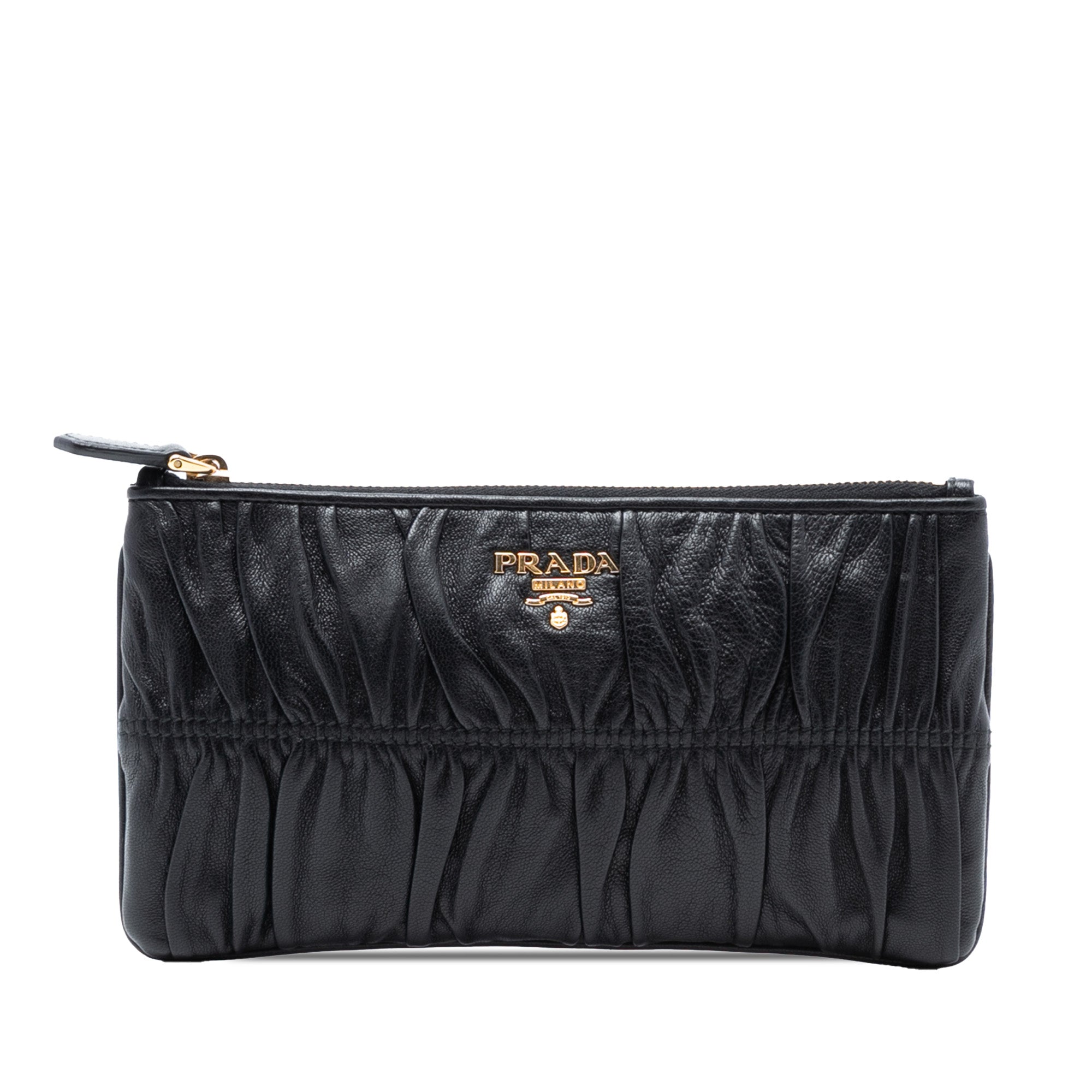 Product Details: Black Prada Nappa Gaufre Pouch. This pouch features a gathered leather body and top zip closure. 4.3" L x 7.9" W x 0.8" D.