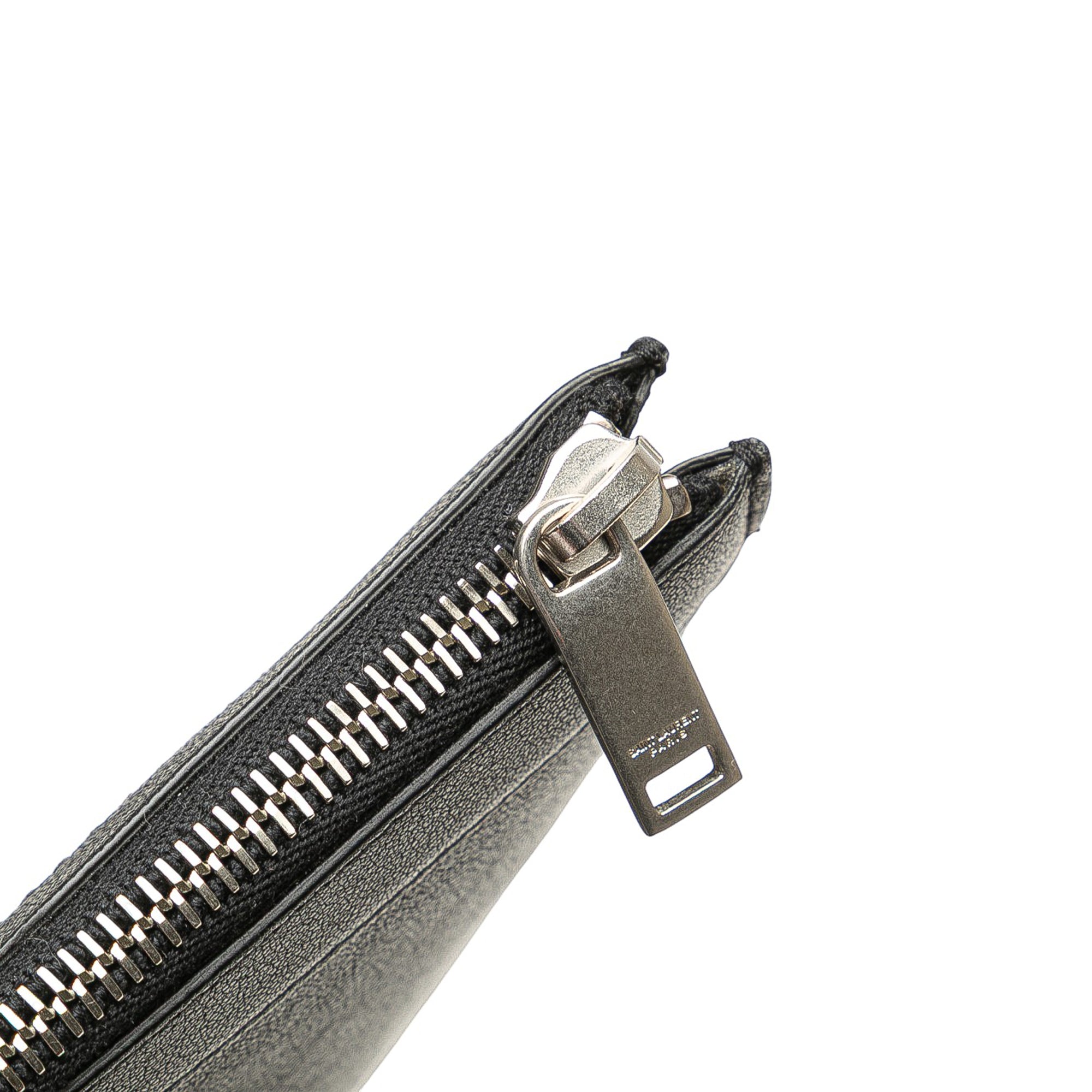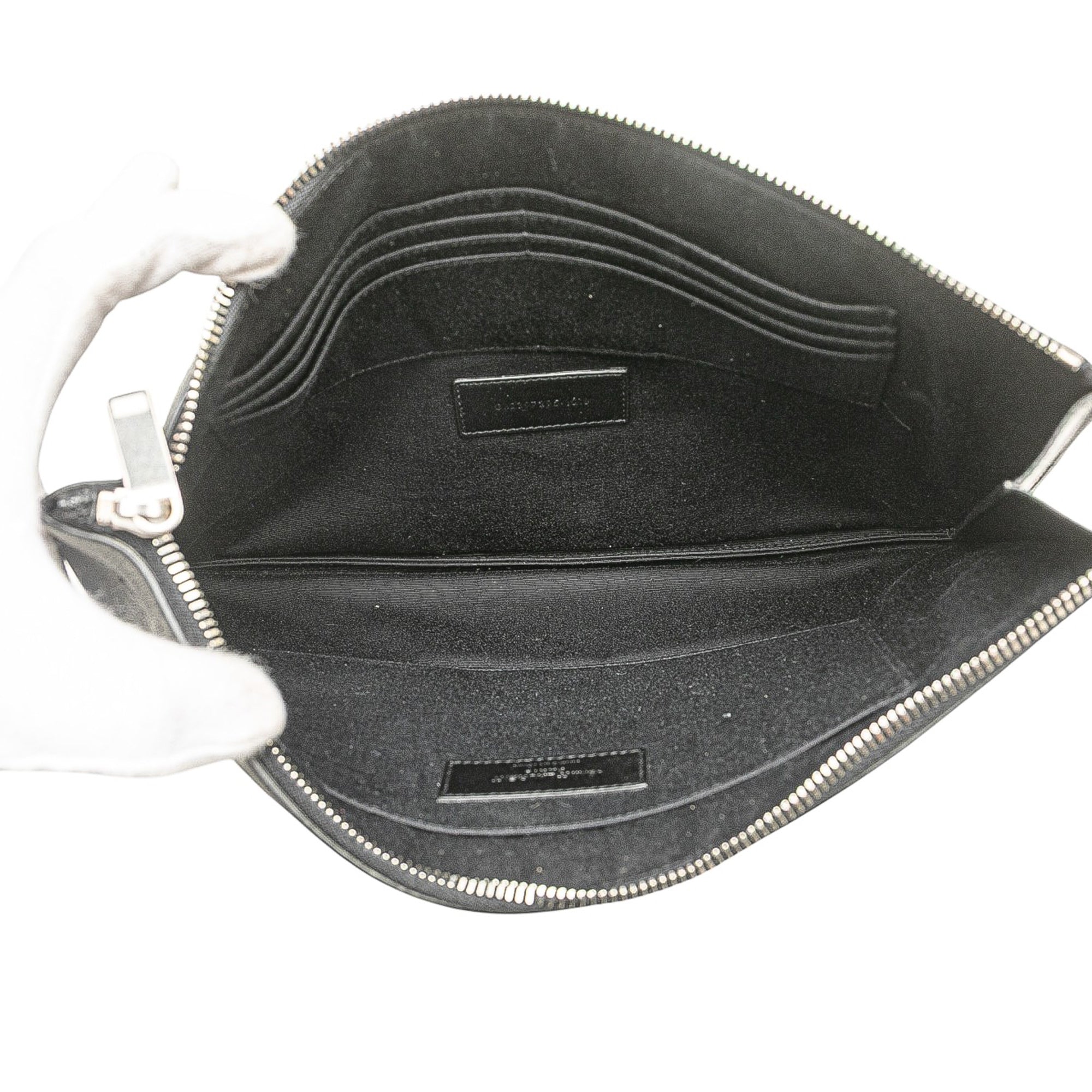 Product Details: Black Saint Laurent Studded Leather Clutch. This clutch bag features a leather body with silver toned studs, a top zip closure, and interior slip pockets. 8.3" L x 11.4" W x 0.2" D. Serial number GRZ397295.1018.