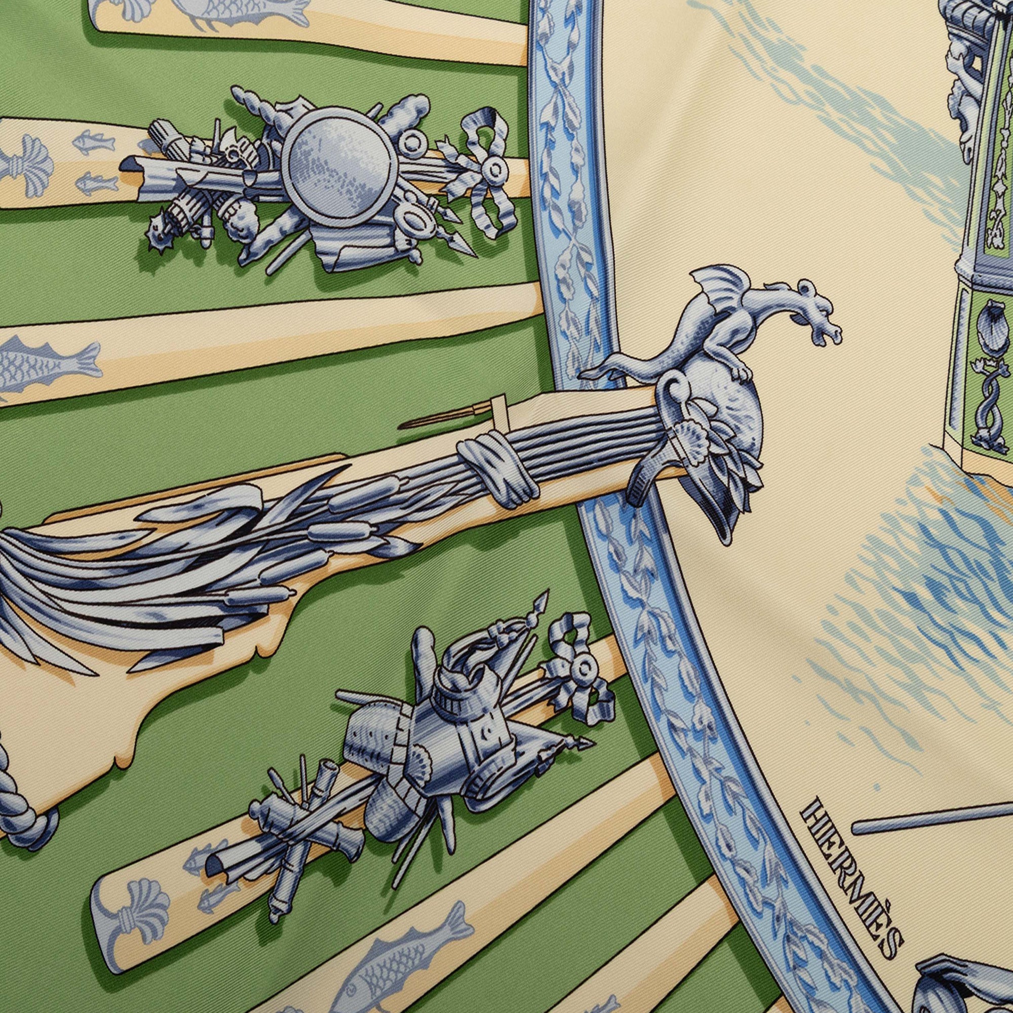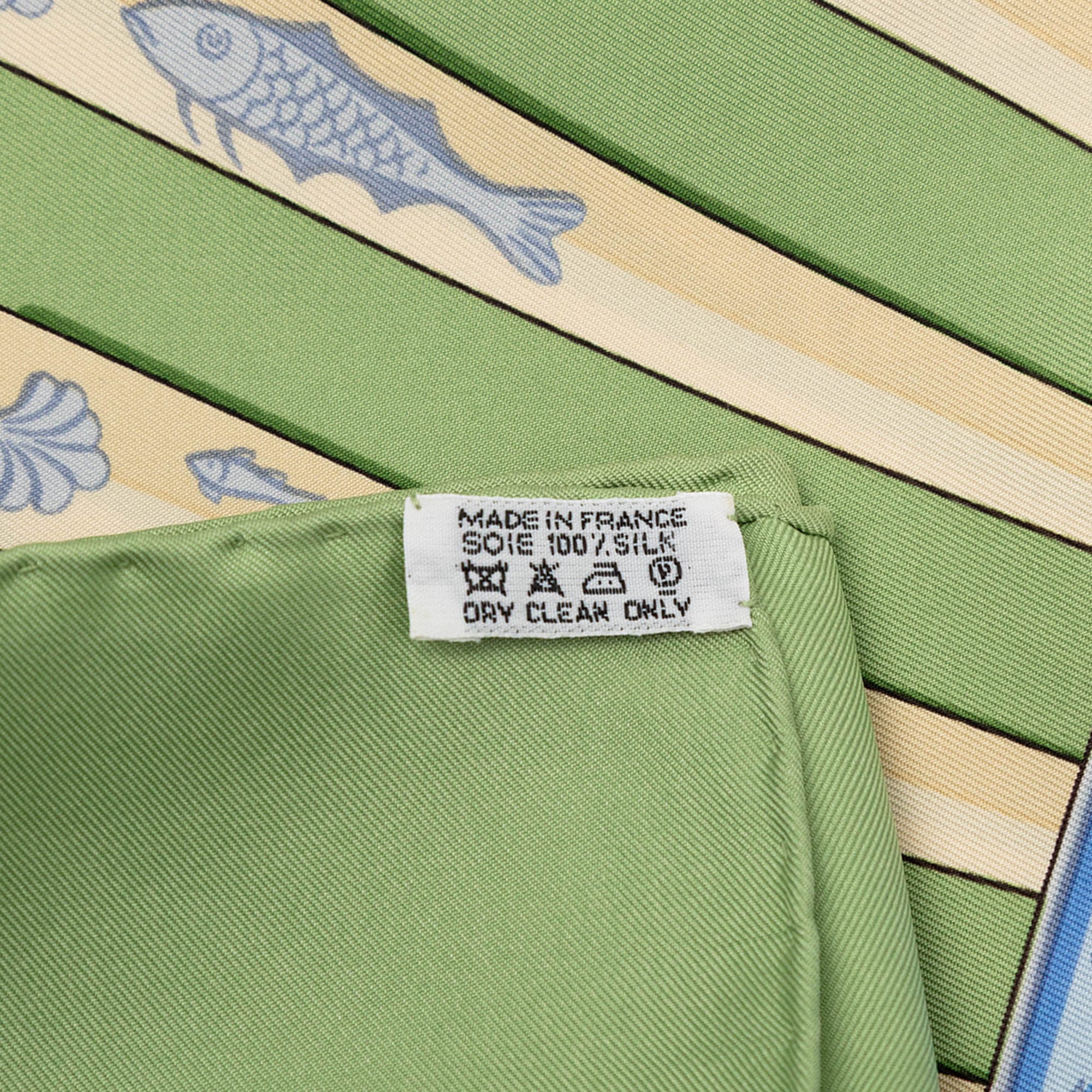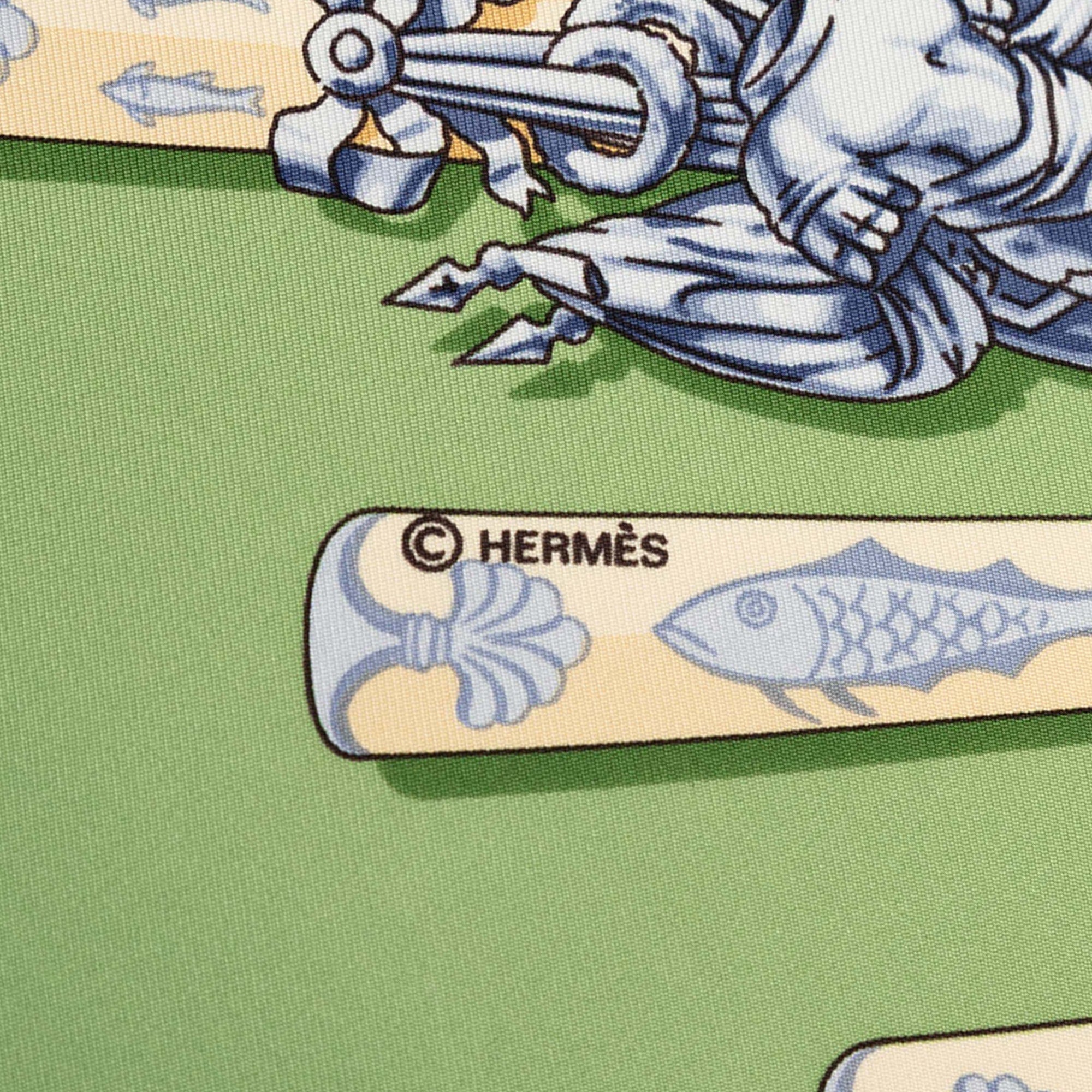 Product Details: Green Hermès La Marine a Rames Silk Scarf 90. This scarf features the La Marine a Rames print on 100% silk. 34.4" L x 35" W x 0" D.