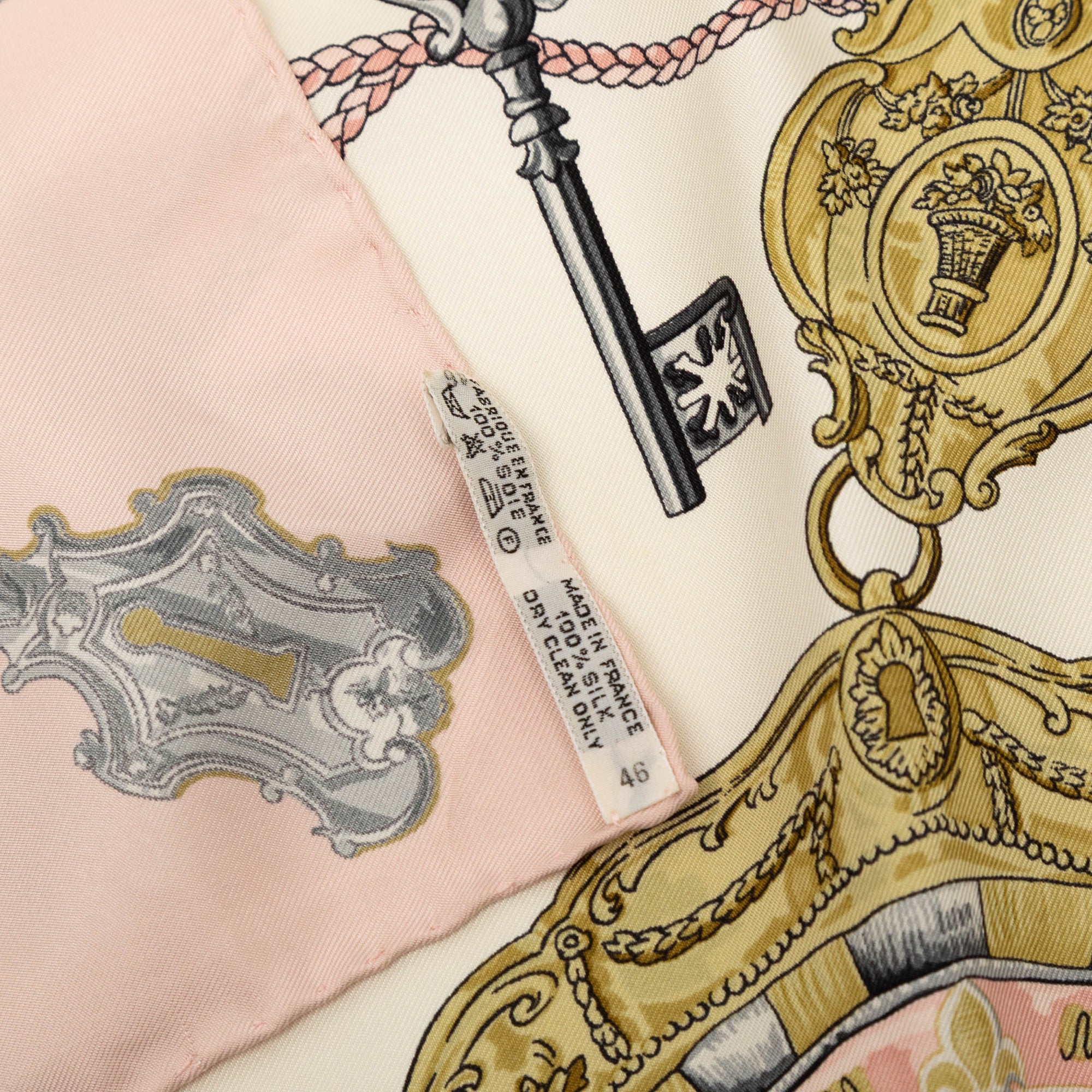 Product Details: White Hermès Les Cles Silk Scarf 90 Scarves. This scarf features the Les Cles print on 100% silk. 34.3" L x 34.6" W x 0" D.