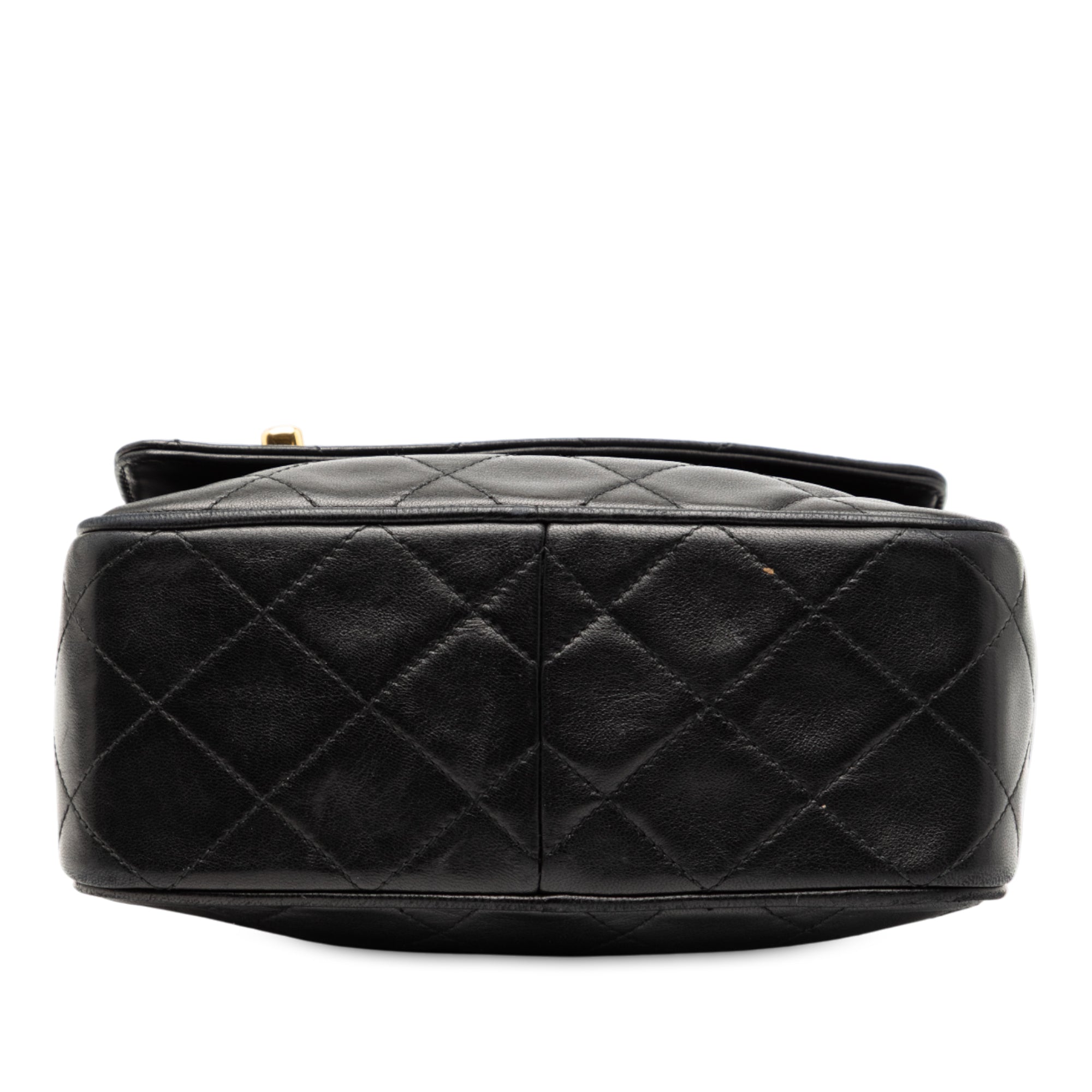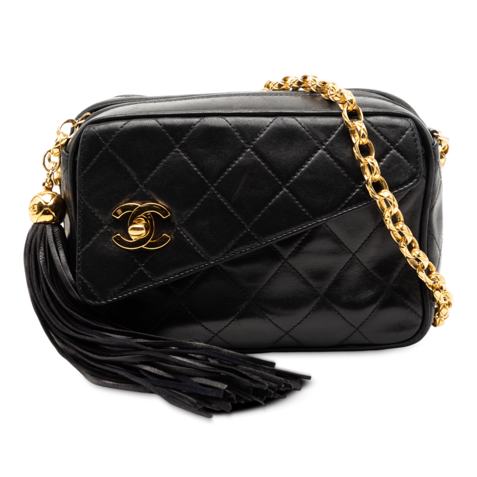 Product Details: Black Chanel CC Quilted Lambskin Tassel Camera Bag. This crossbody features a quilted lambskin leather body, a chain link shoulder strap, a top zip closure with tassel detail, an exterior front flap compartment with twist lock closure, and interior zip and slip pockets. 4.7" L x 7.1" W x 2.8" D. Serial number 2748621.
