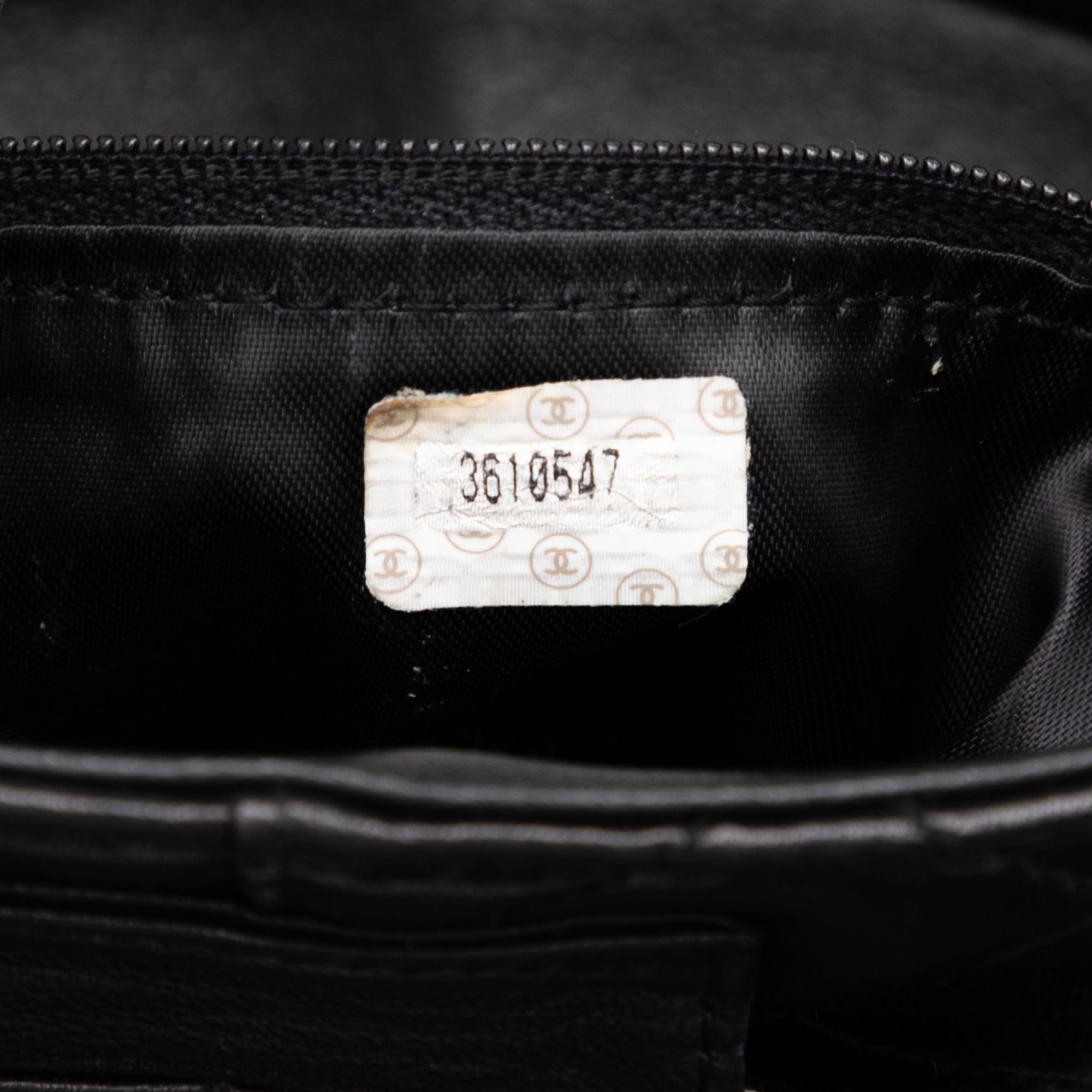 Product Details: Black Chanel CC Quilted Lambskin Tassel Vanity Bag. This vanity bag features a quilted leather body, a flat quilted leather strap, a top flap with magnetic snap closure, an interior zip pocket, and an interior mirror. 4.7" L x 6.9" W x 3.9" D. Serial number 3610547.