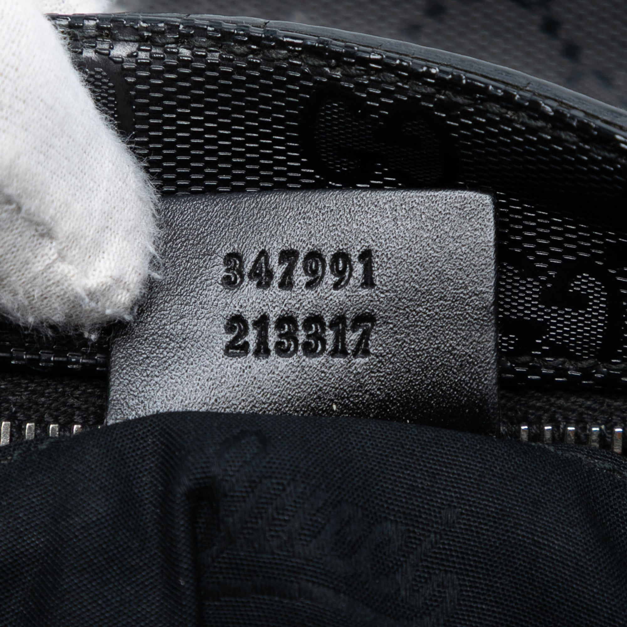 Product Details: Black Gucci GG Imprime Web Crossbody. This crossbody bag features a coated canvas body with leather trim and web detail, an adjustable flat shoulder strap, a top zip closure, and interior zip and slip pockets. 11.8" L x 13.8" W x 0.4" D. Serial number 347991 213317.