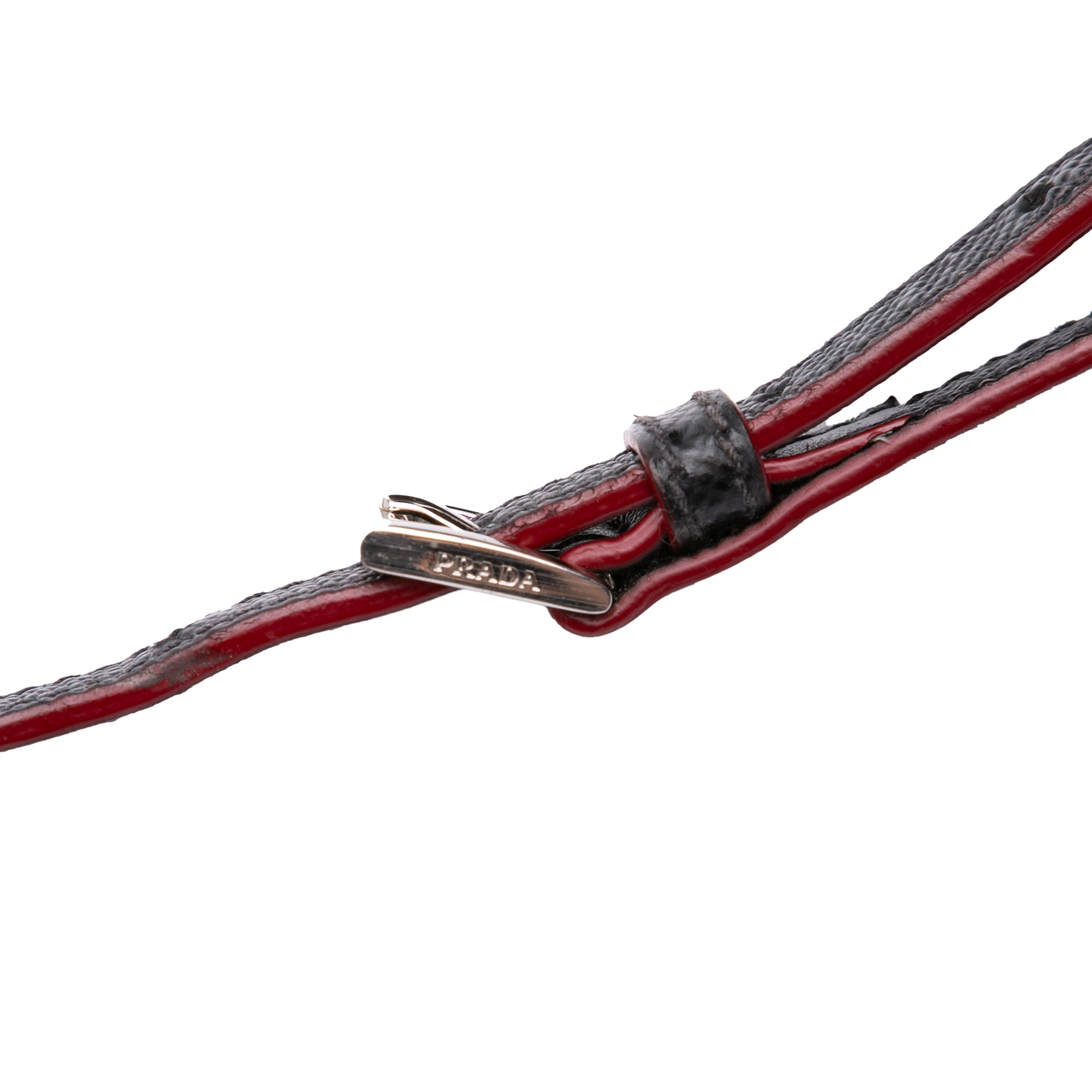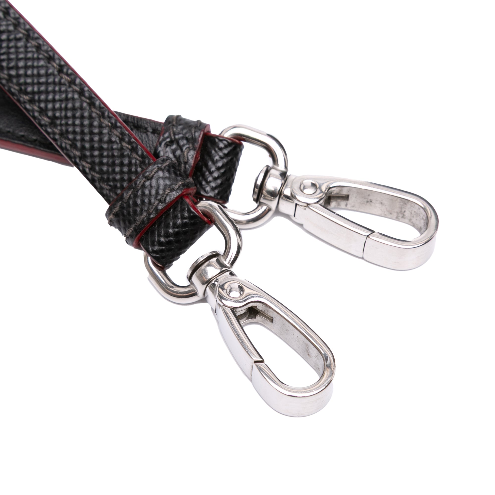 Product Details: Black Prada Saffiano Trimmed Tessuto Bucket Bag Satchel. This bucket bag features a nylon body with saffiano leather trim, a flat leather handle, a detachable flat leather strap, a top drawstring closure, and an interior slip pocket. 9.1" L x 8.3" W x 5.5" D, 5.5" drop.