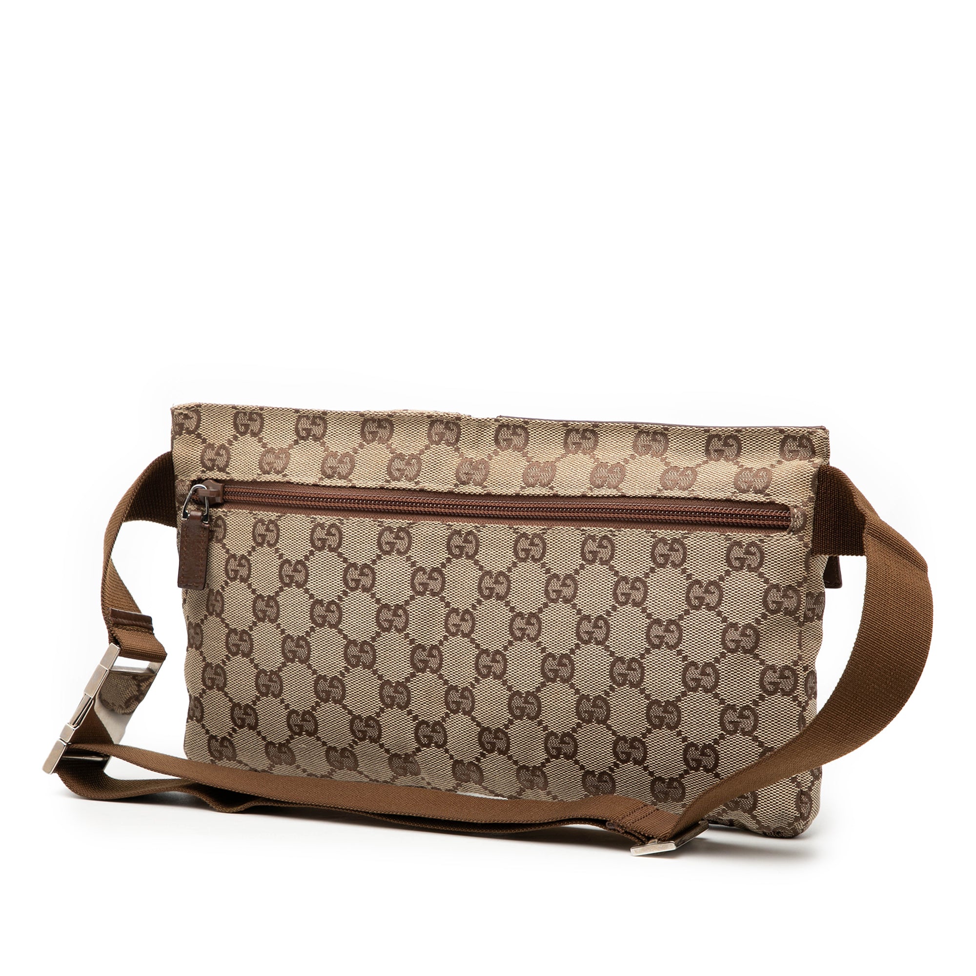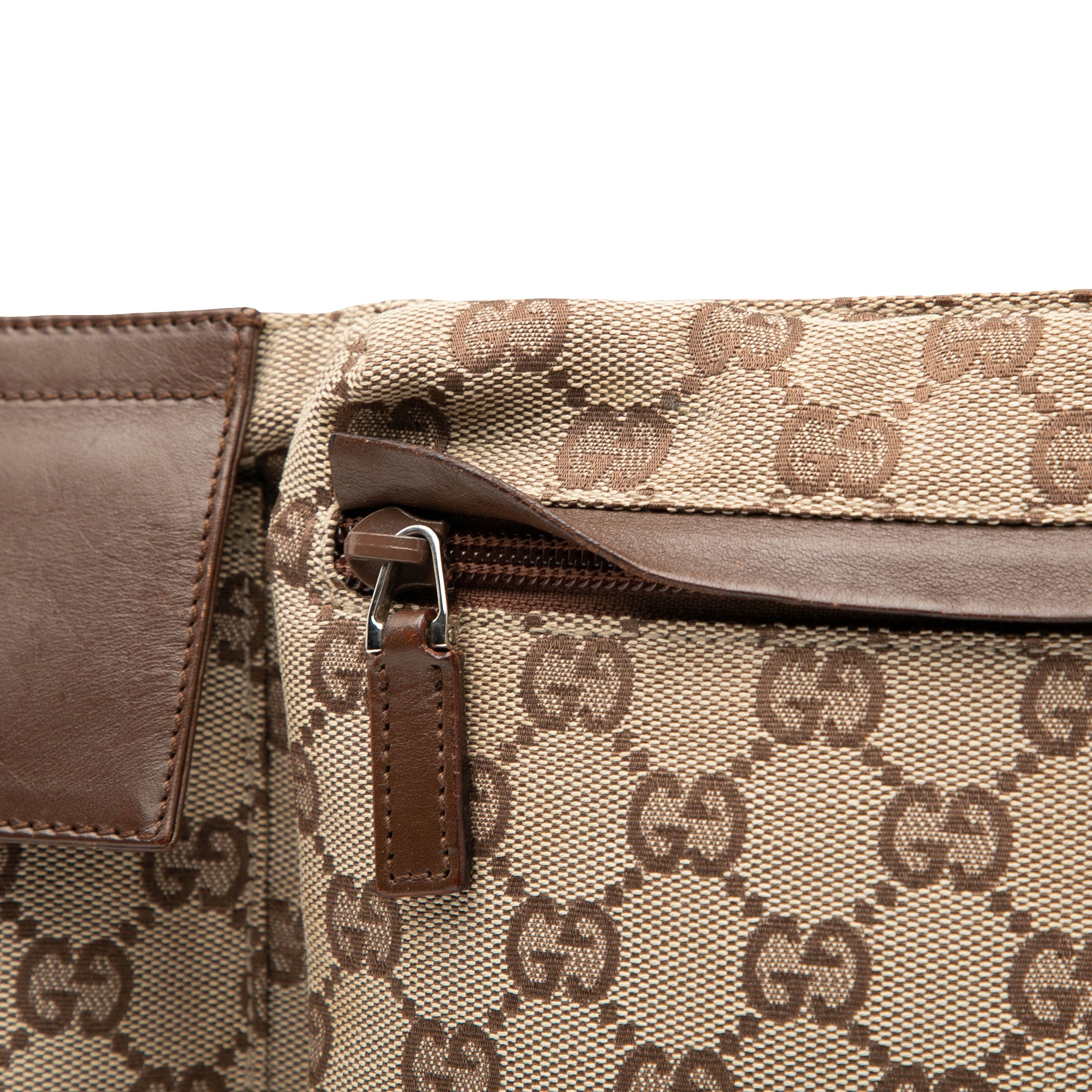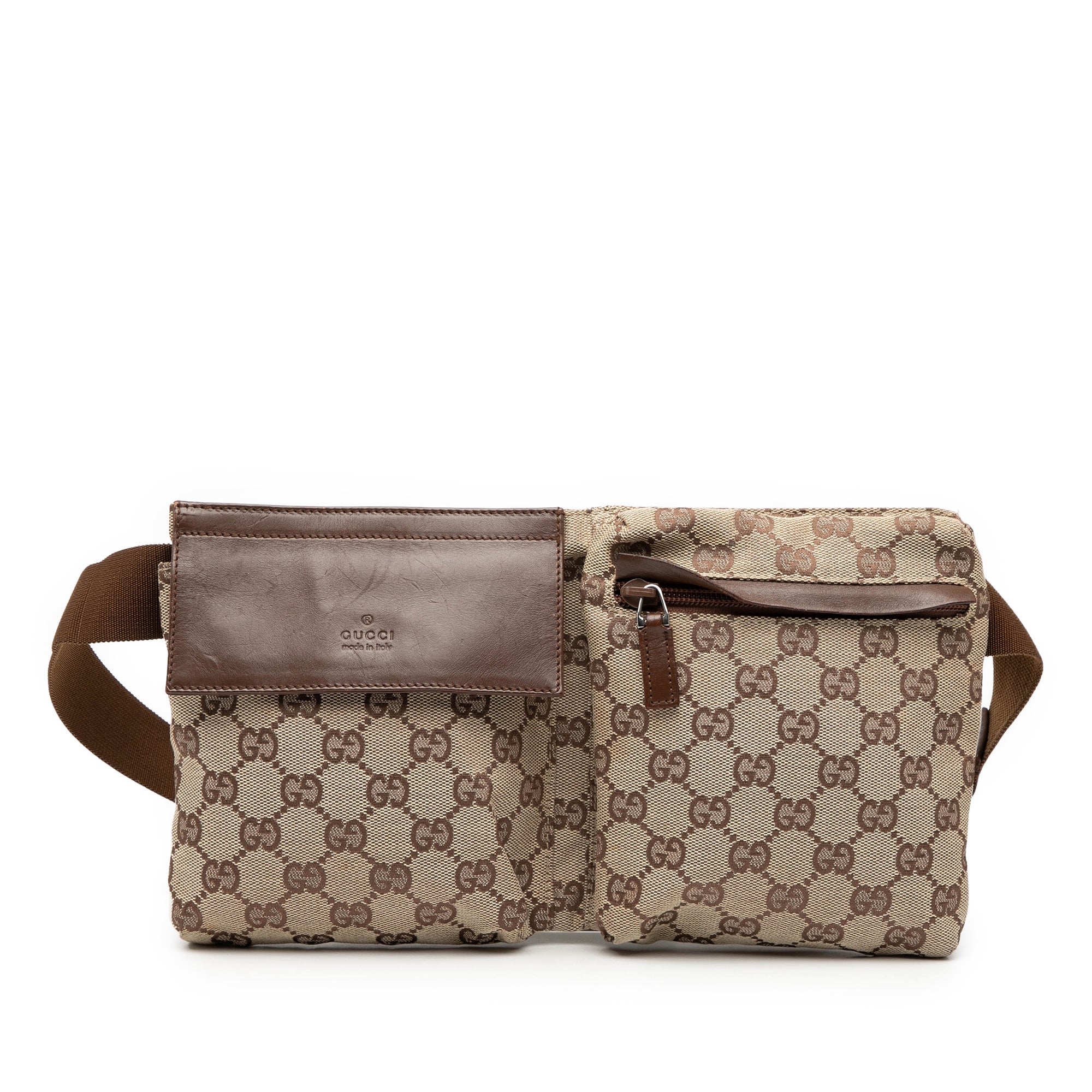 Product Details: Brown Gucci GG Canvas Double Pocket Belt Bag. This belt bag features a canvas body with leather trim, an adjustable flat waist strap, exterior front flap and zip compartments, and an exterior back zip pocket. 6.3" L x 11.4" W x 0.2" D. Serial number 28566 200047.