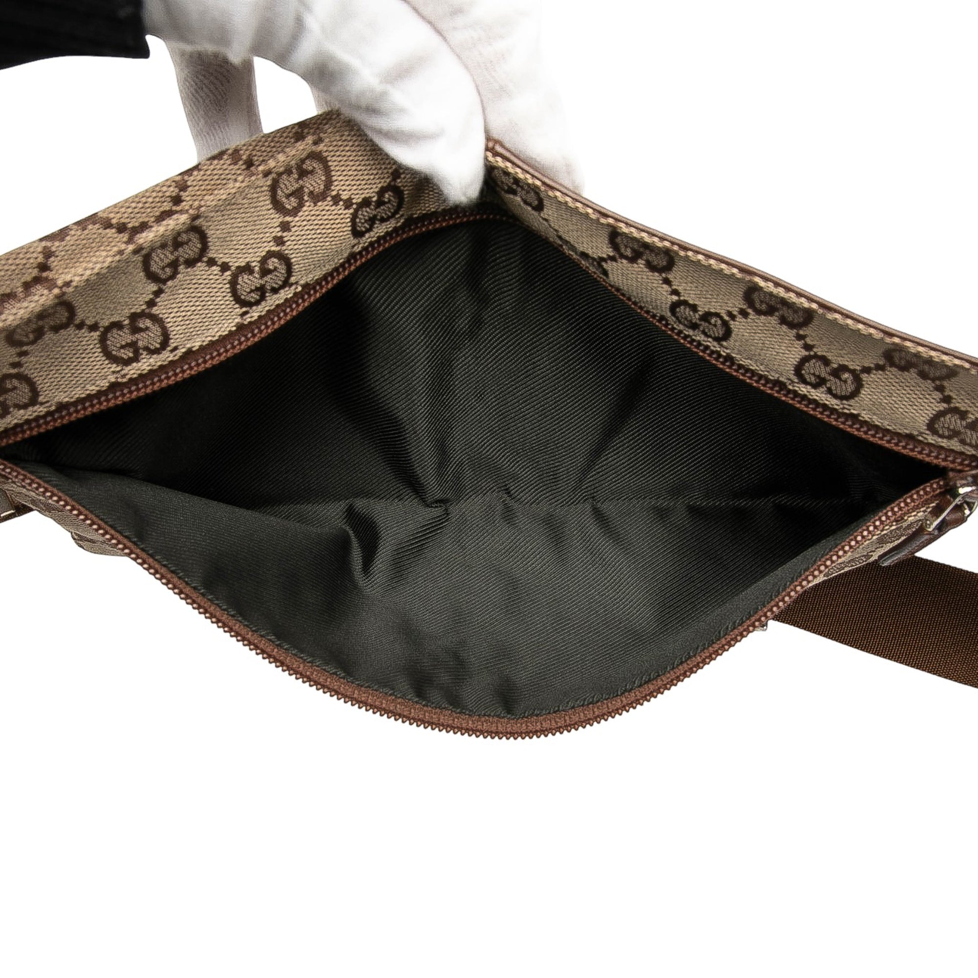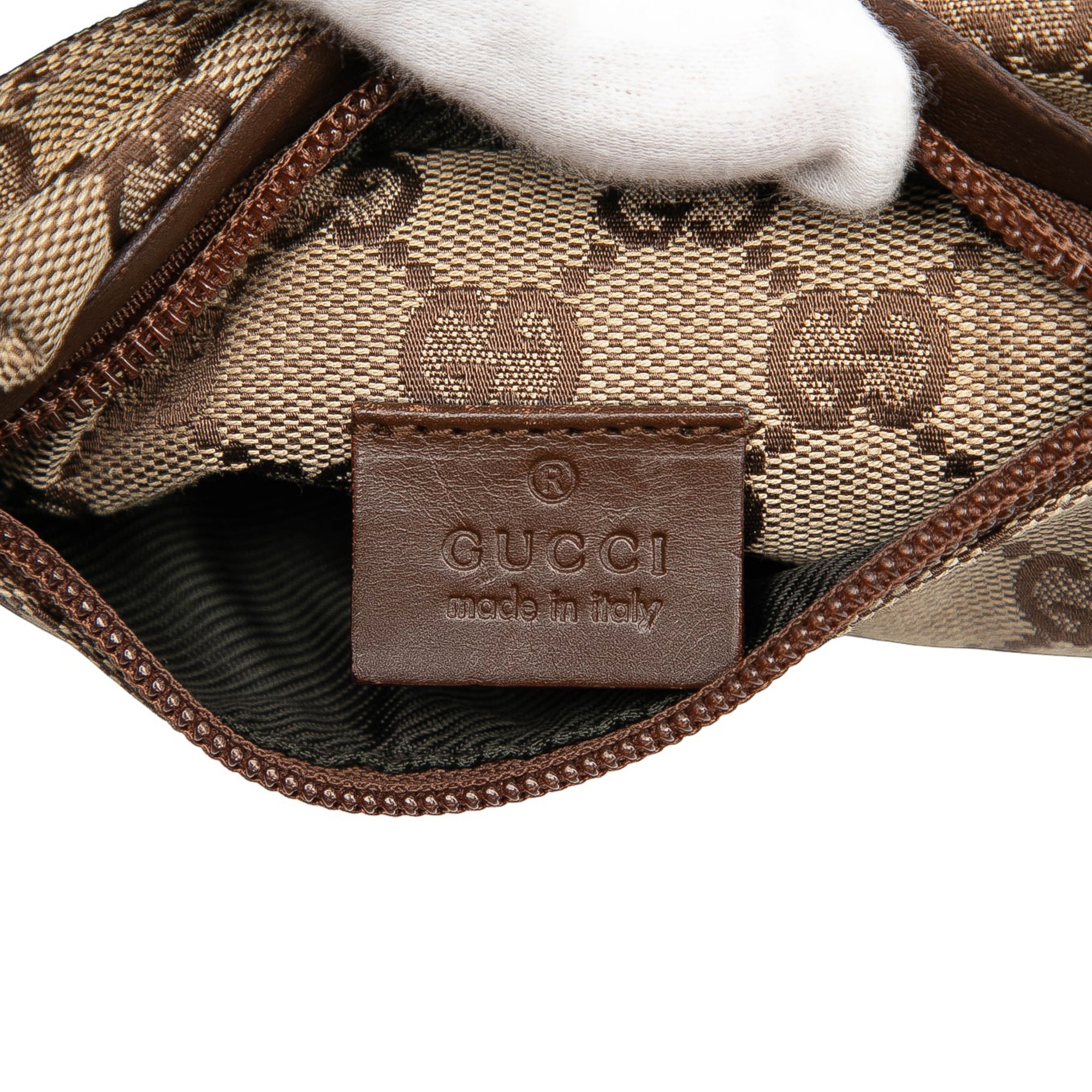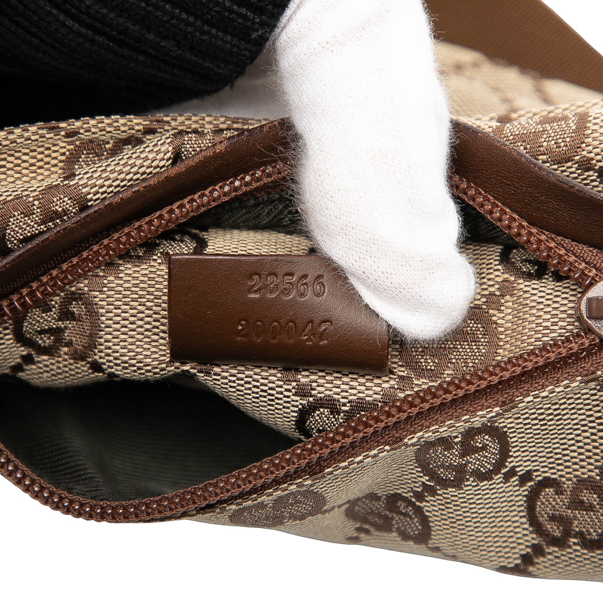 Product Details: Brown Gucci GG Canvas Double Pocket Belt Bag. This belt bag features a canvas body with leather trim, an adjustable flat waist strap, exterior front flap and zip compartments, and an exterior back zip pocket. 6.3" L x 11.4" W x 0.2" D. Serial number 28566 200047.