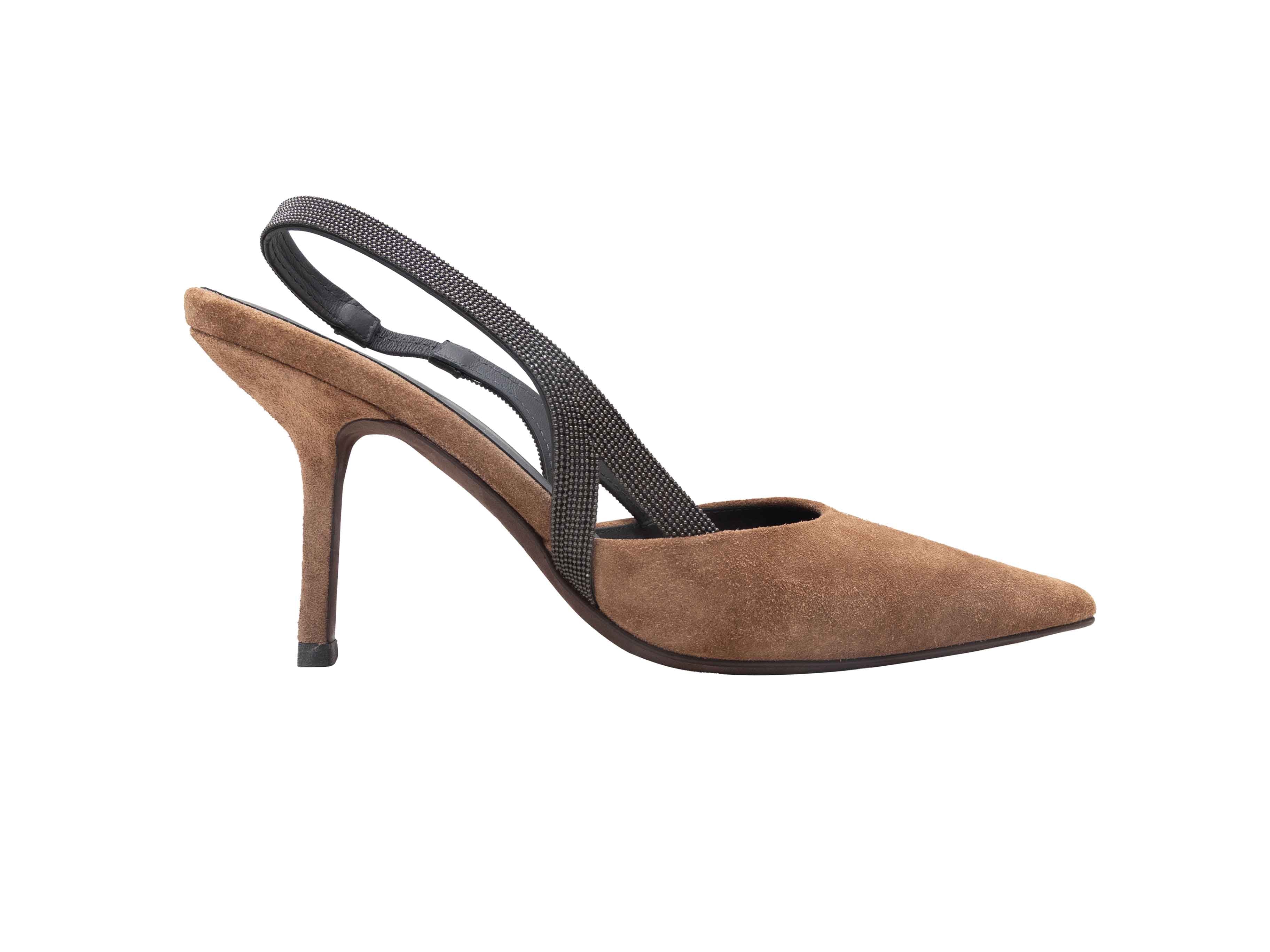 Product Details: Brown suede and gunmetal Monili-detailed pointed-toe slingback pumps by Brunello Cucineli. 3.5" heel height.