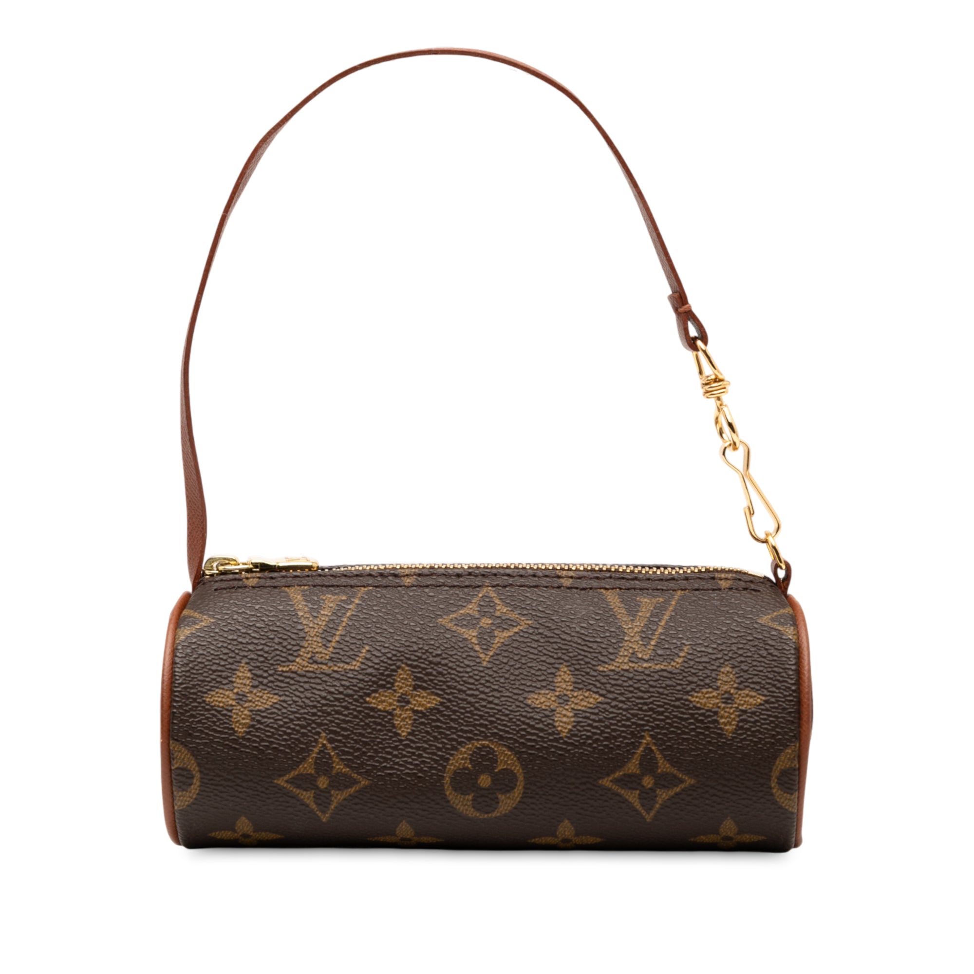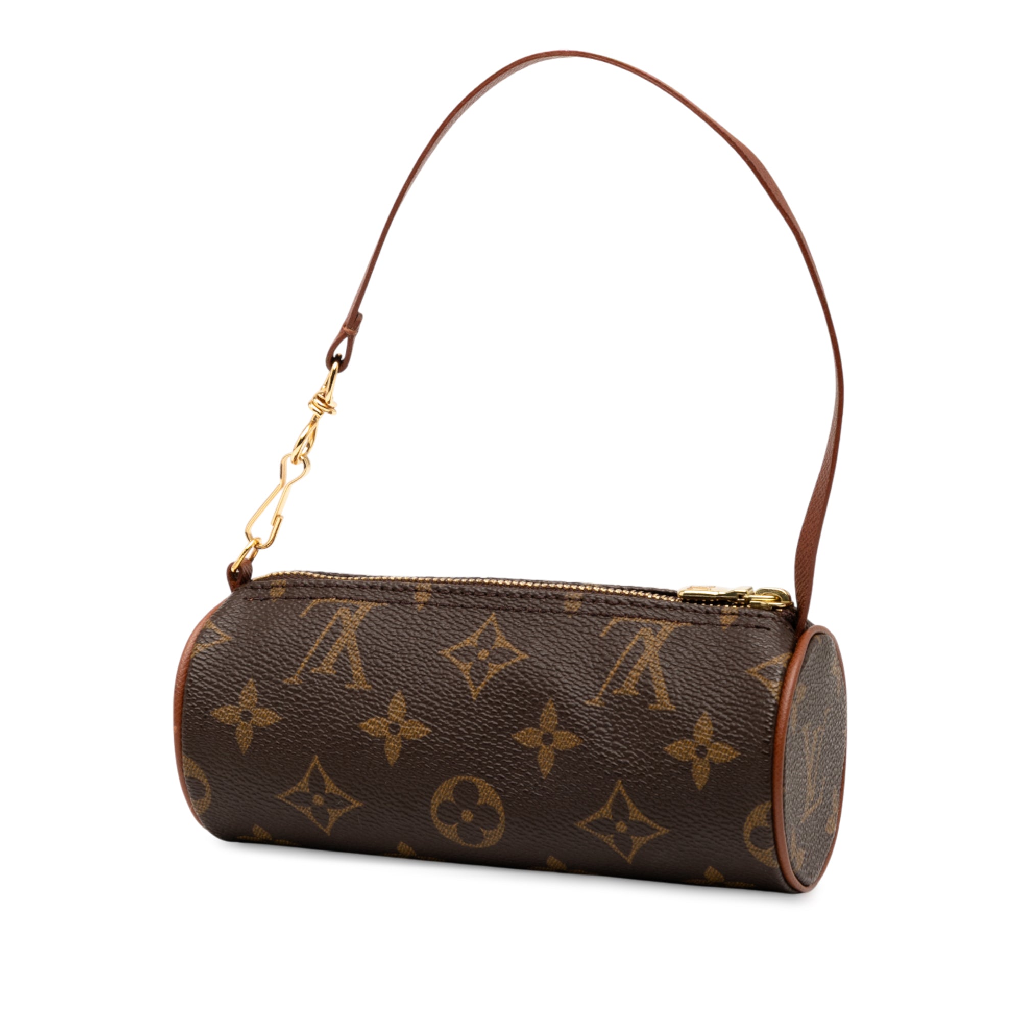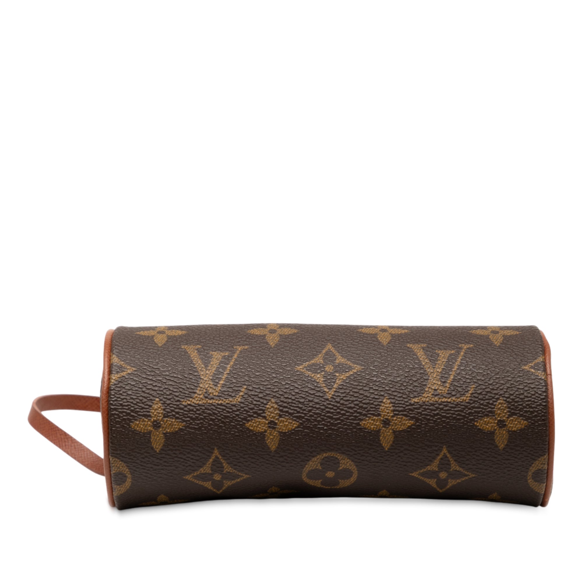 Product Details: Brown Louis Vuitton Monogram Papillon Pochette Handbag. The Pochette Papillon features a monogram canvas body, a detachable leather strap, and a top zip closure. 2.6" L x 6.1" W x 2.6" D, 5.1" drop.