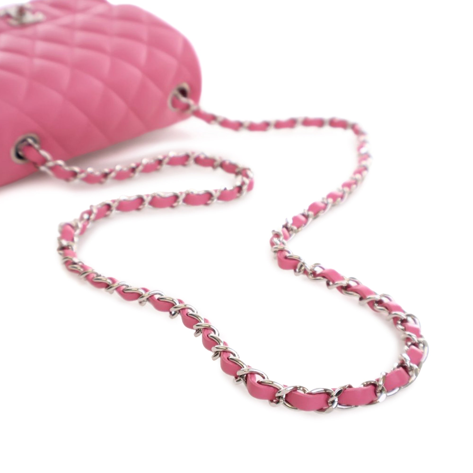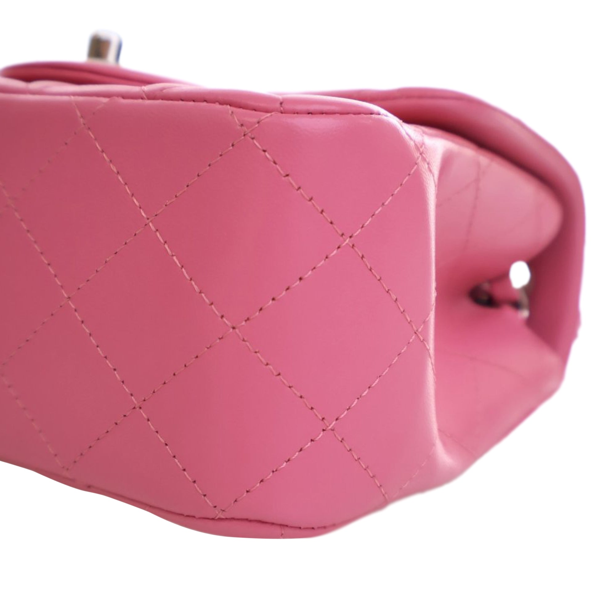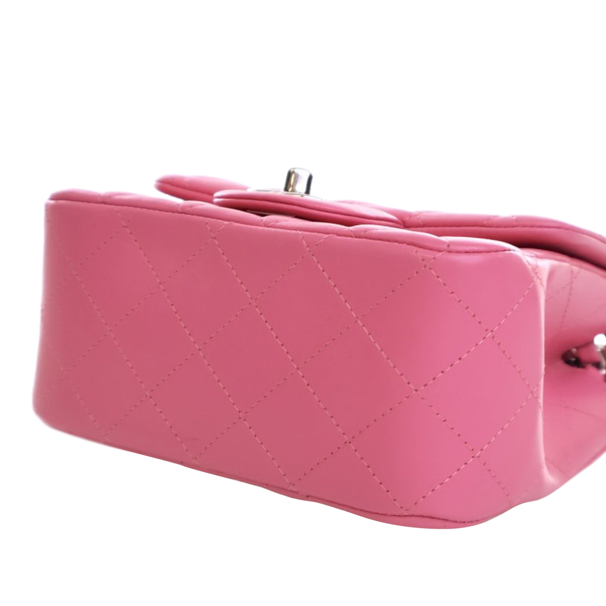 Product Details: Pink Chanel Mini Square Classic Lambskin Single Flap Crossbody Bag. This crossbody bag features a quilted lambskin leather body, a silver-tone leather woven chain link strap, a front flap with a CC turn lock closure, an exterior back slip pocket, and interior zip and slip pockets. 5" L x 6.5" W x 3" D.