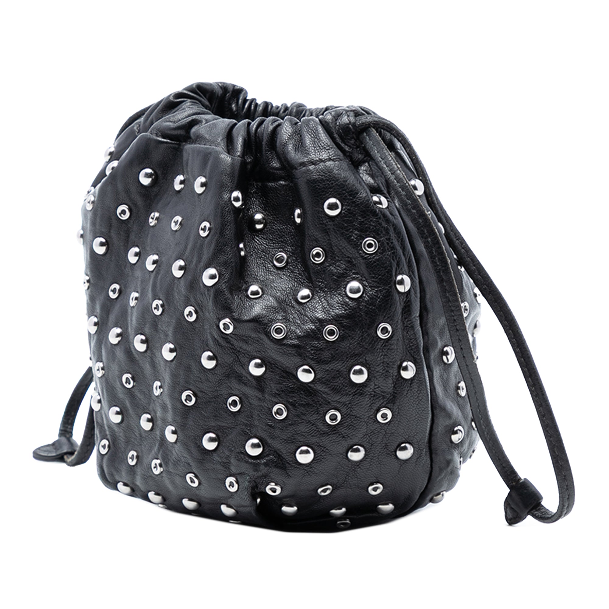 Product Details: Black Prada Studded Leather Drawstring Pouch. This pouch features a leather body with stud embellishments, an open top with drawstring closure, and an interior slip pocket. 6.7" L x 5.5" W x 4.7" D.