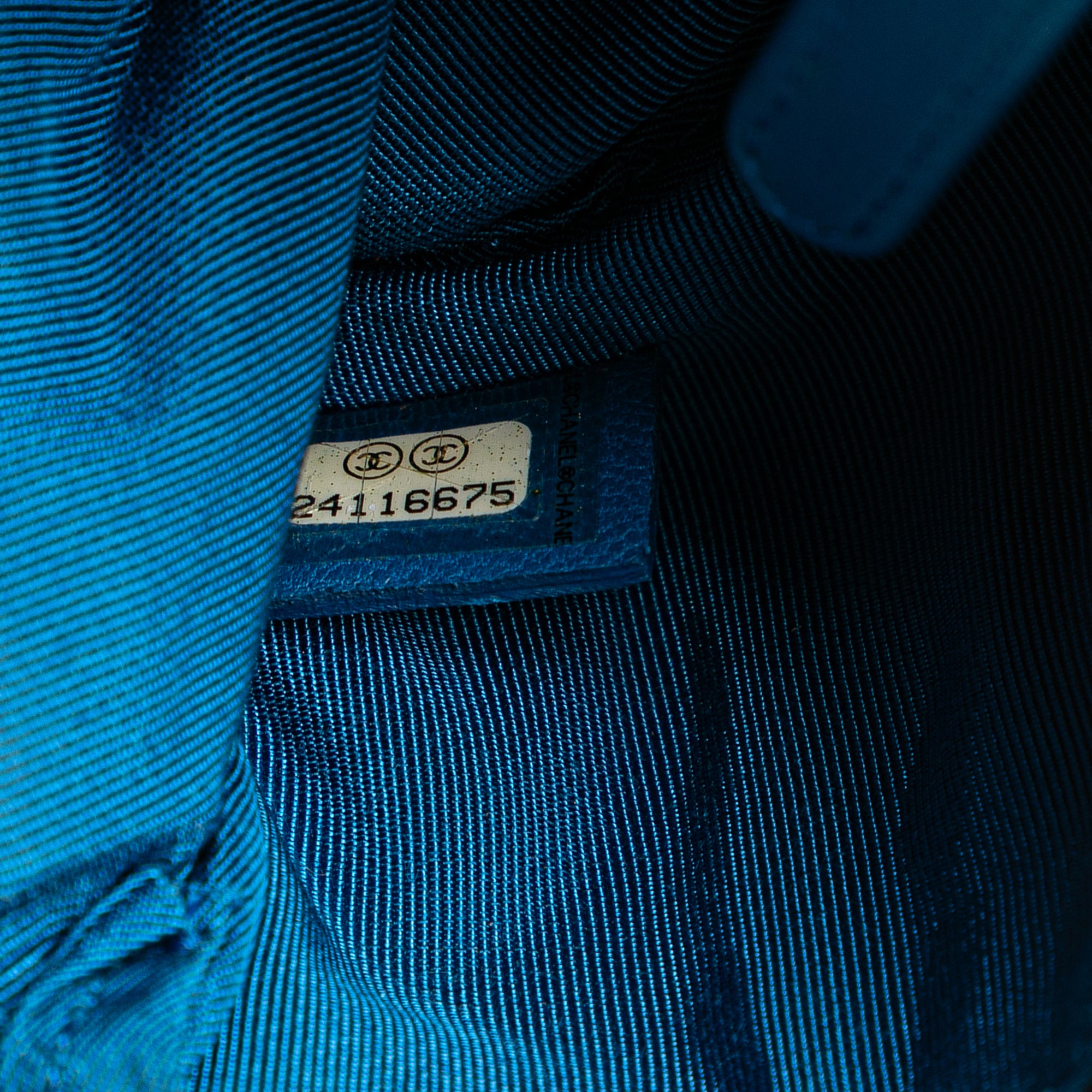Product Details: Blue Chanel Chevron Lambskin O Case Pouch. This pouch features a quilted lambskin leather body and a top zip closure. 3.5" L x 5.9" W x 0.6" D. Serial number 24116675.