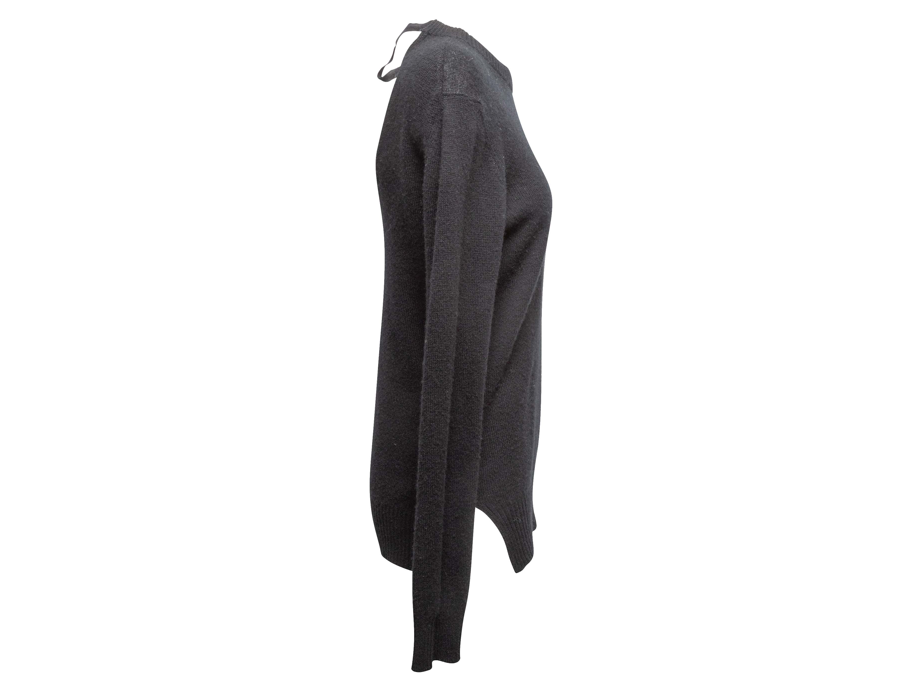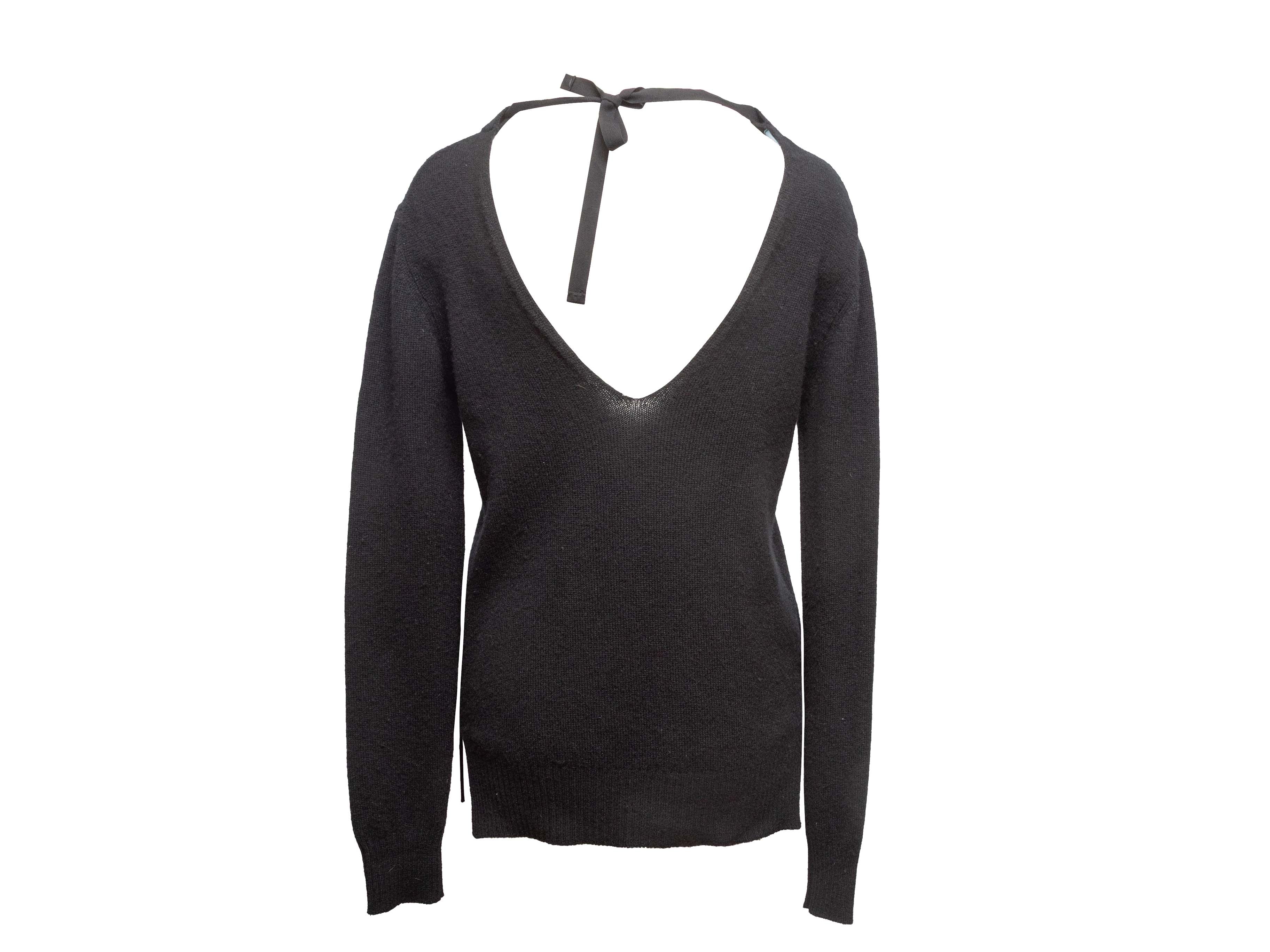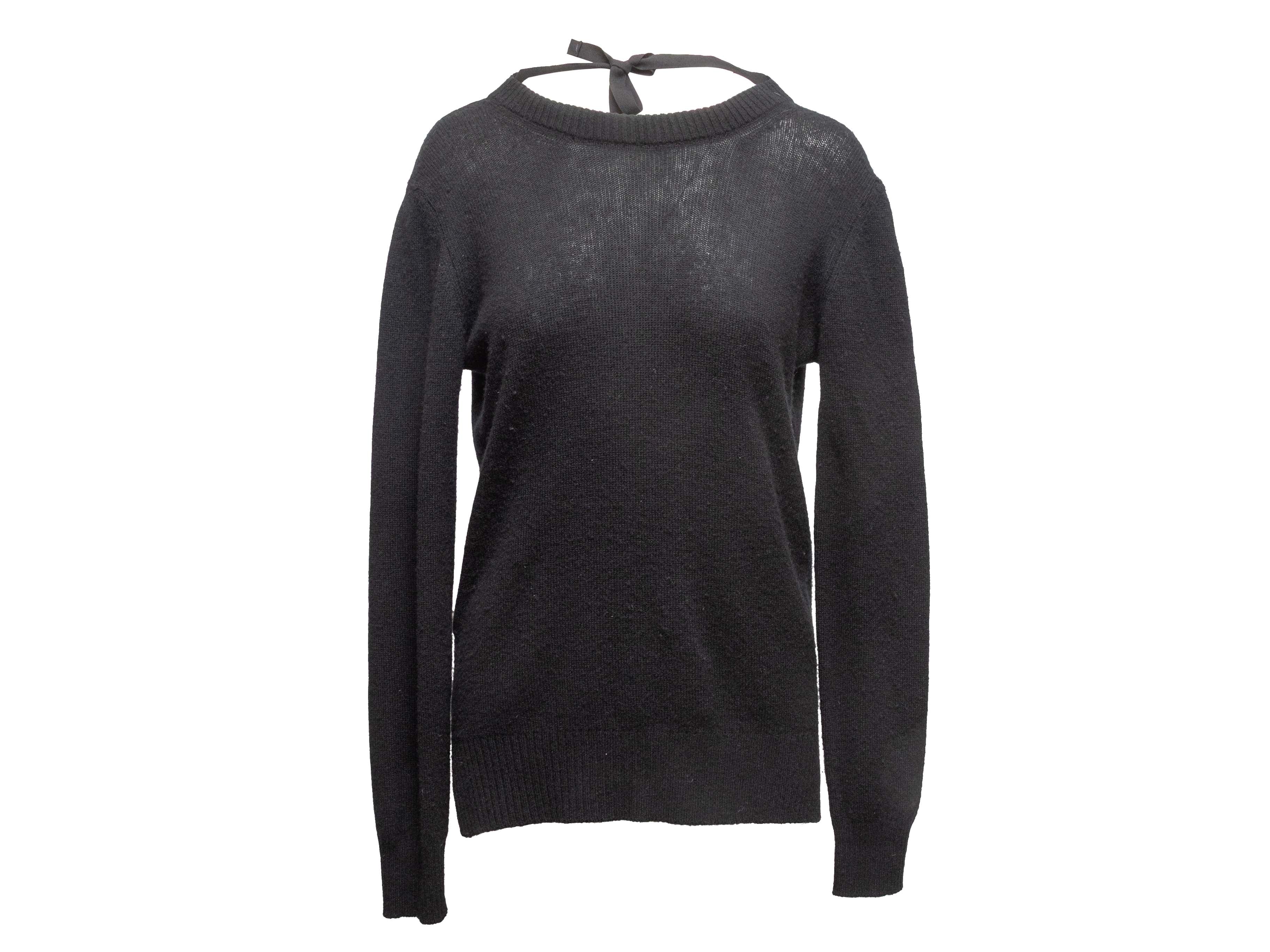 Product Details: Black low back knit sweater by Prada. Crew neck. Tie at nape. 37" bust, 15.75" shoulder width, 26" length.