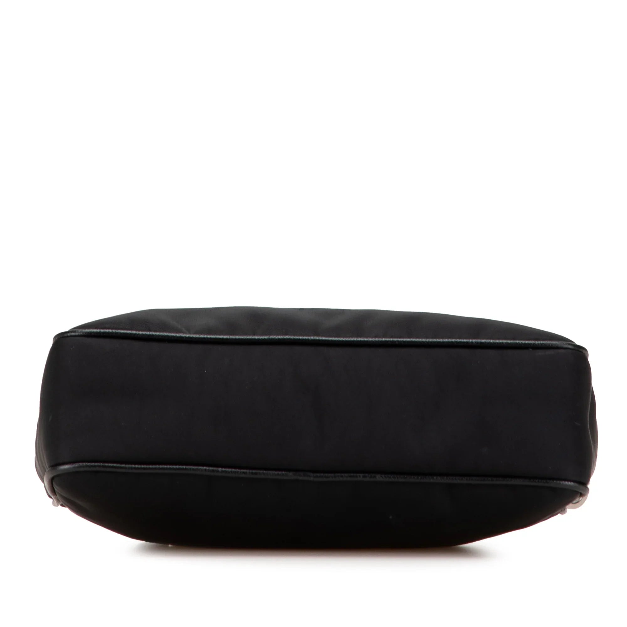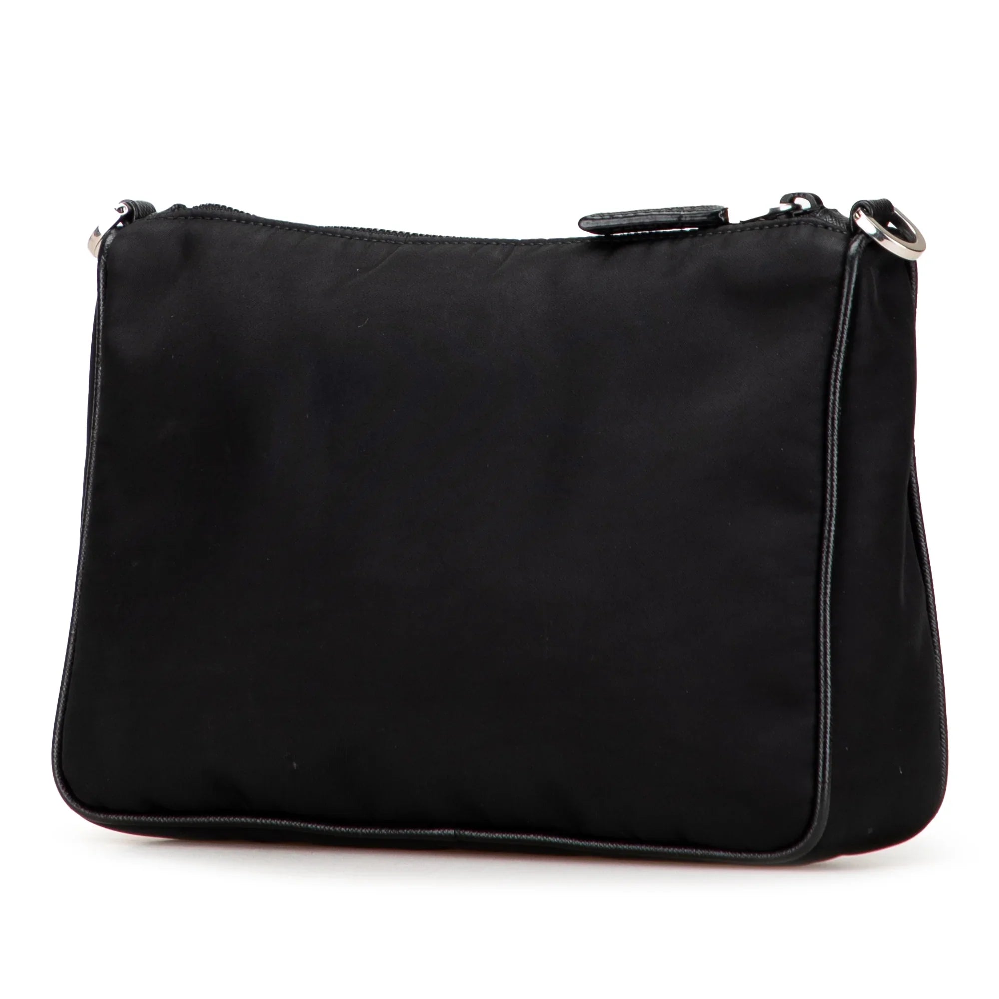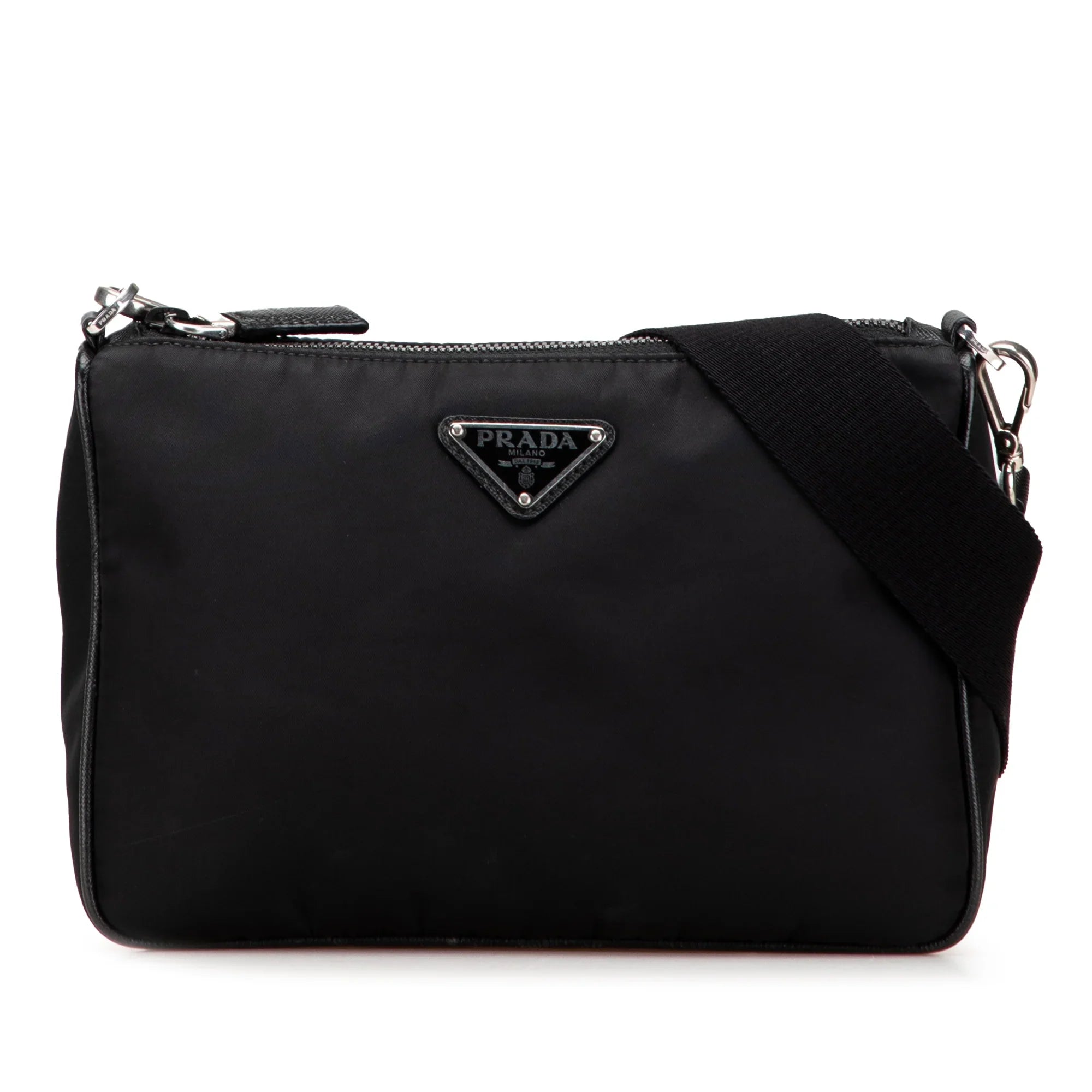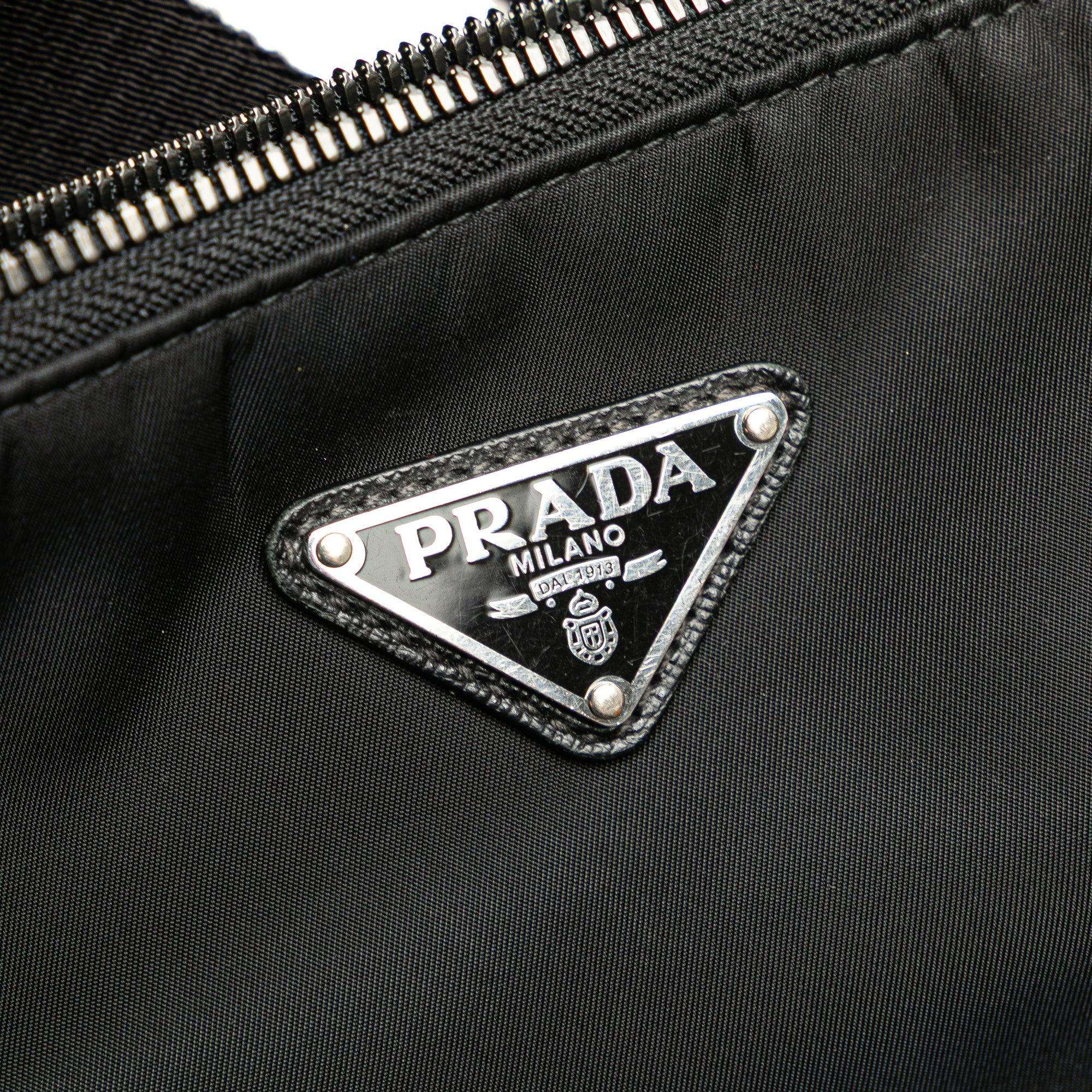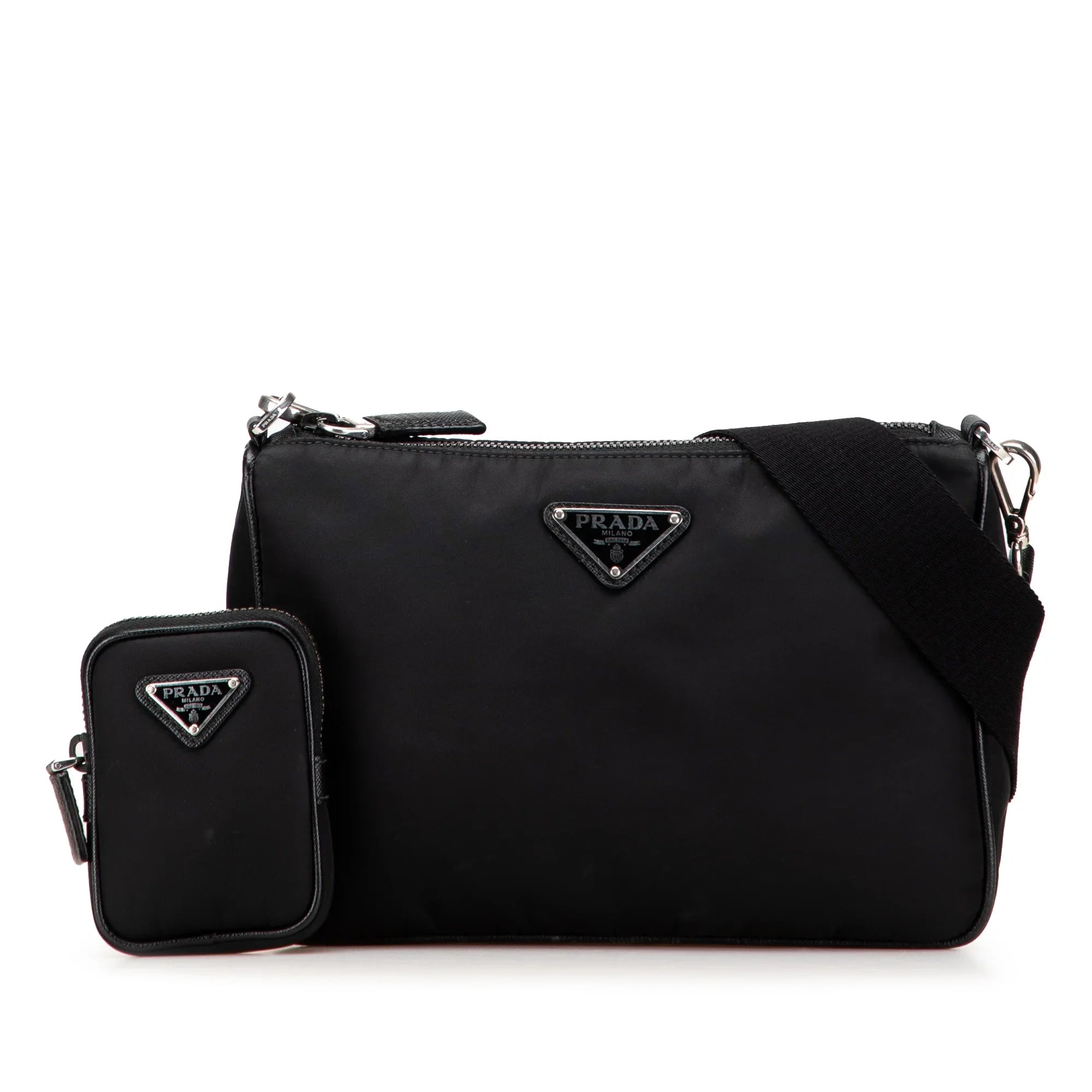 Product Details: Black Prada Saffiano Trimmed Re Nylon Zip Top Crossbody. This crossbody bag features a nylon body, a detachable strap with a removable pouch attachment, and a top zip closure. 6.7" L x 9.3" W x 2.4" D.